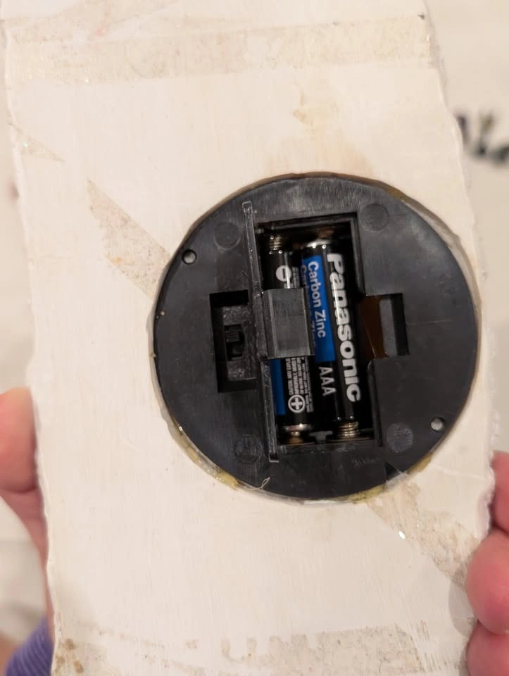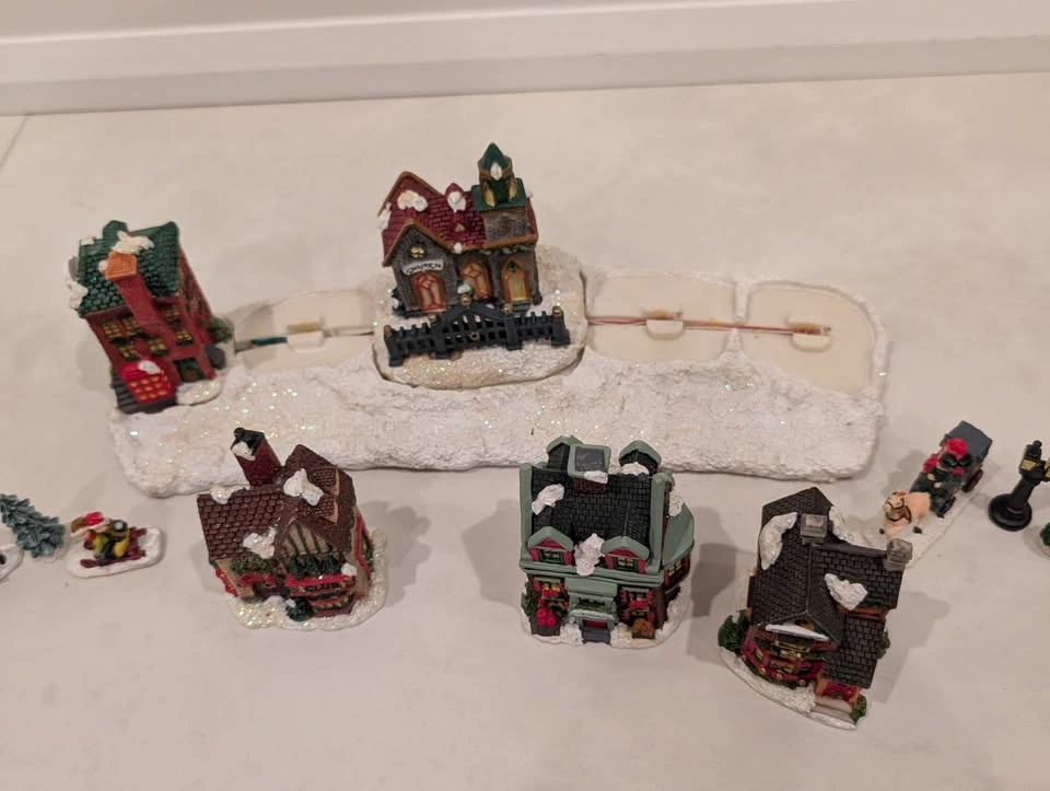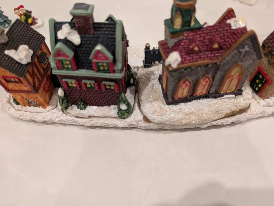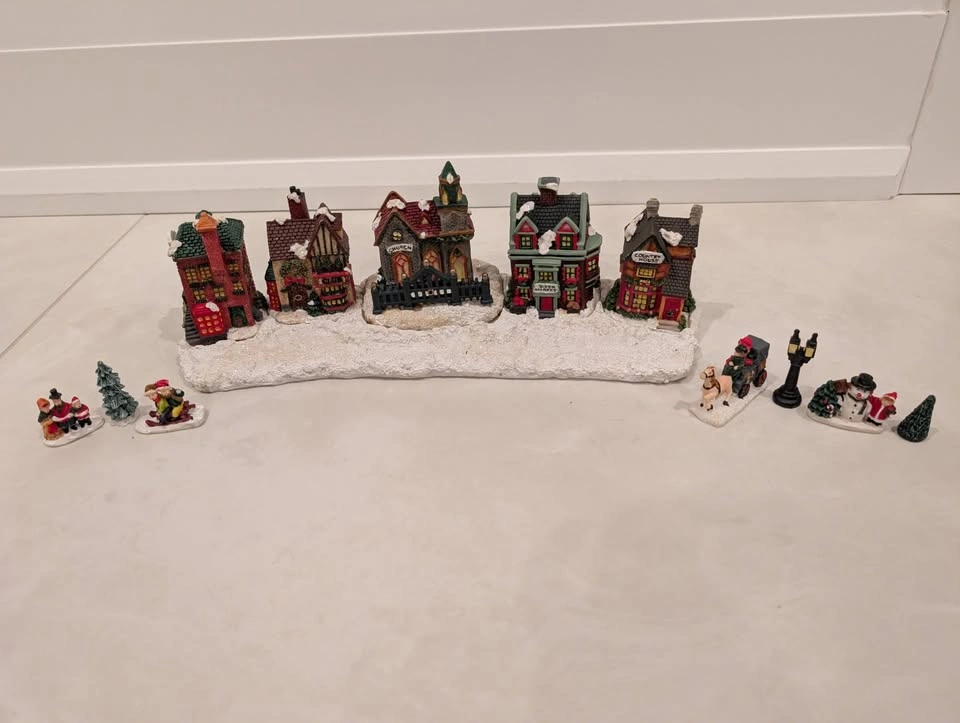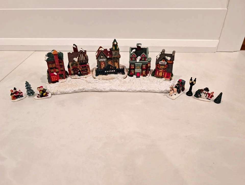 Uses AAA battery- batteries not included. Please note: There are tape marks on the bottom. There is wear to the buildings and glue marks where the buildings connect to the snow platform.
