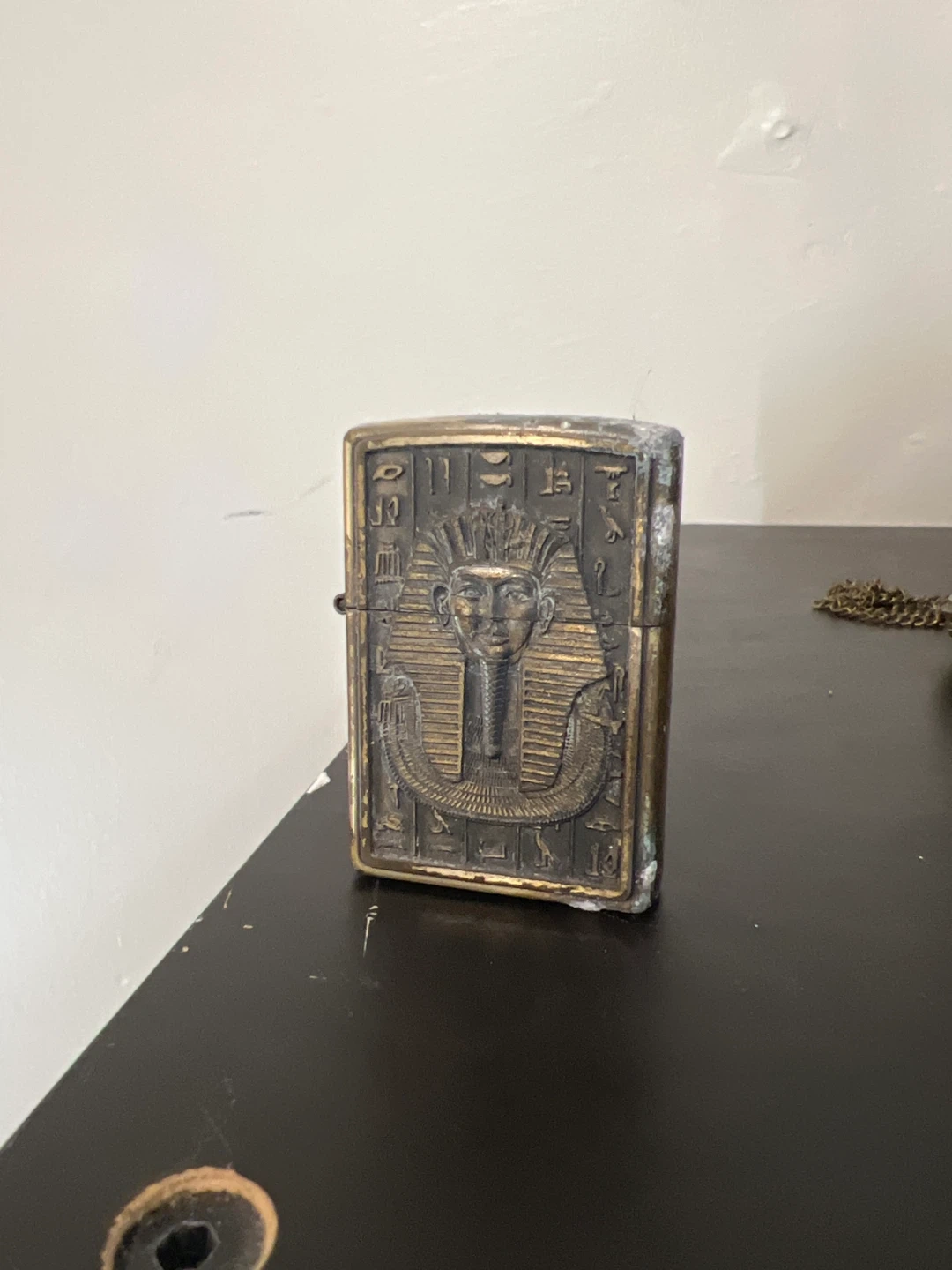 98Selling a lighter with a unique Egyptian design. It shows signs of use but is in good working condition. The lighter features detailed engravings of Egyptian imagery on its surface.
