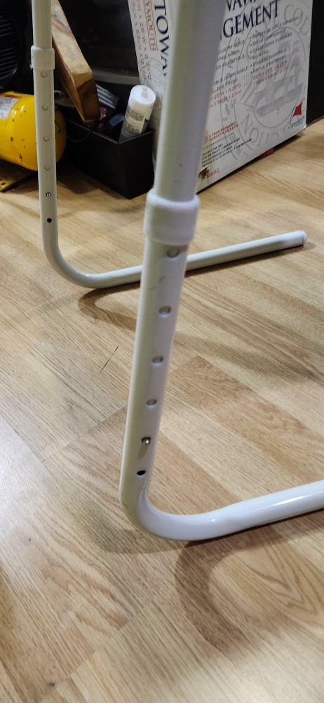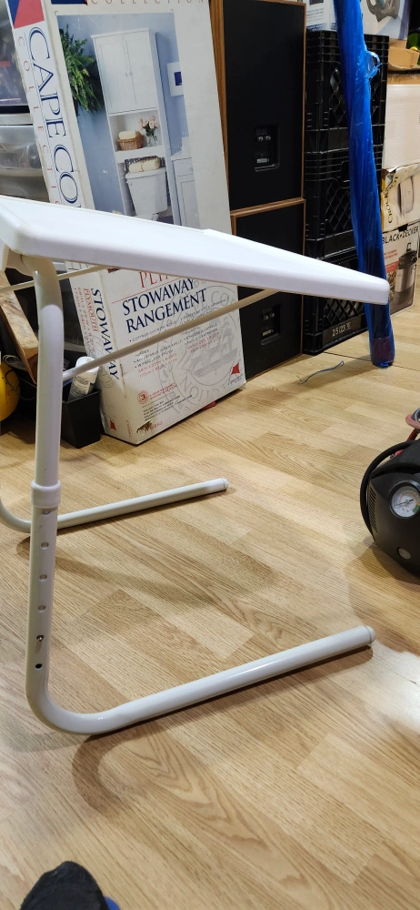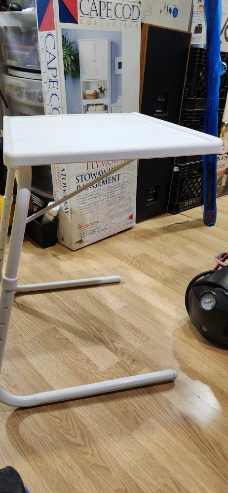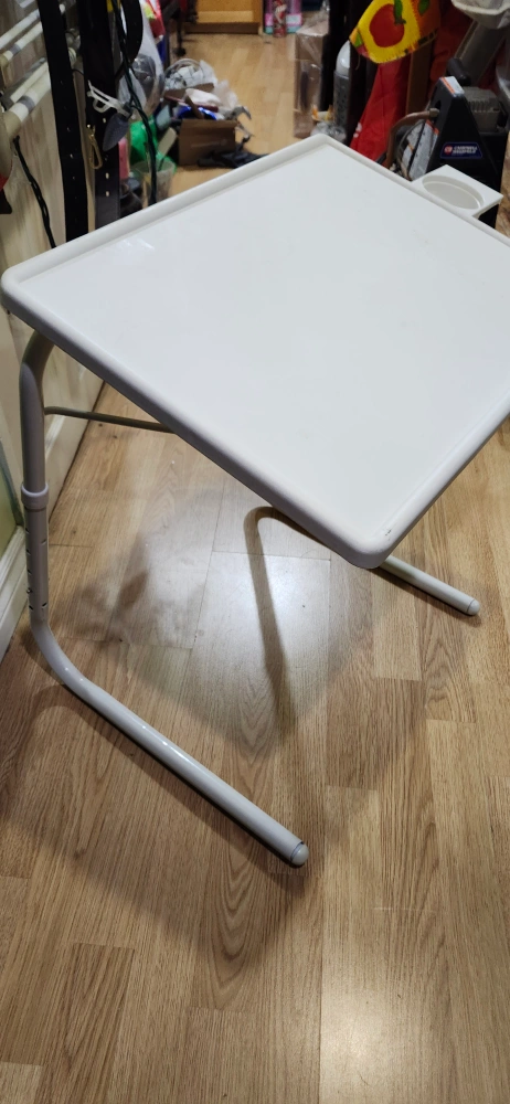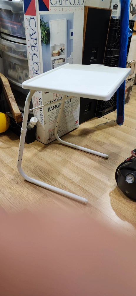 Here's a handy adjustable folding table! It's in great shape and perfect for small spaces. It's white and has a cup holder. price is firm only cash only pickup no delivery meet up on 801 O'Connor drive East York outside TD Canada Trust bank