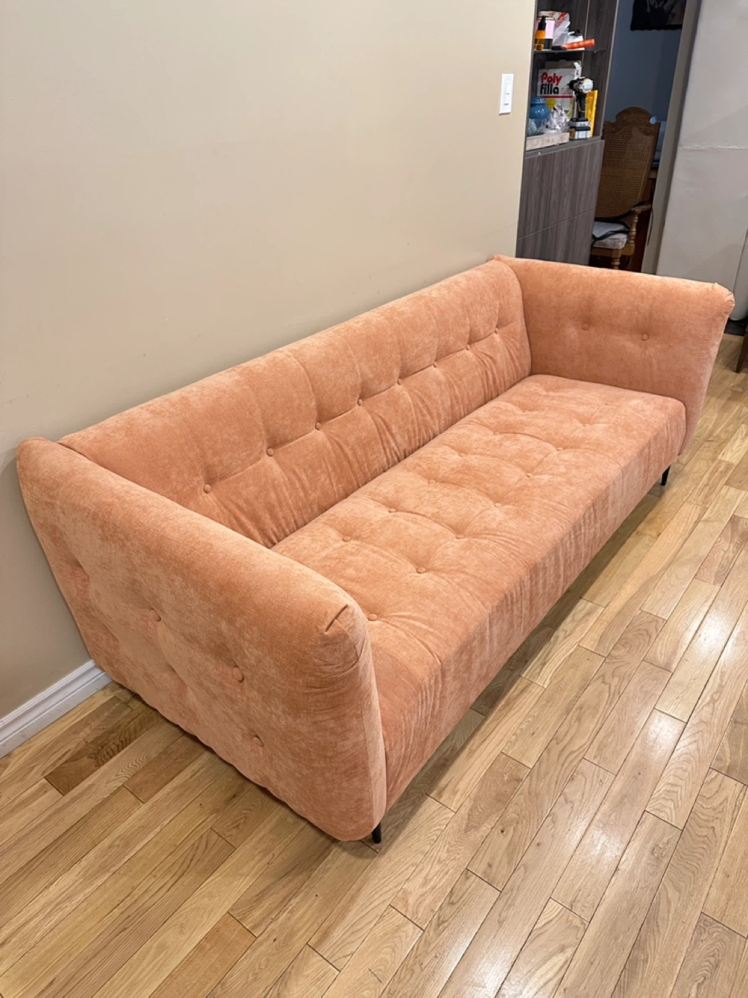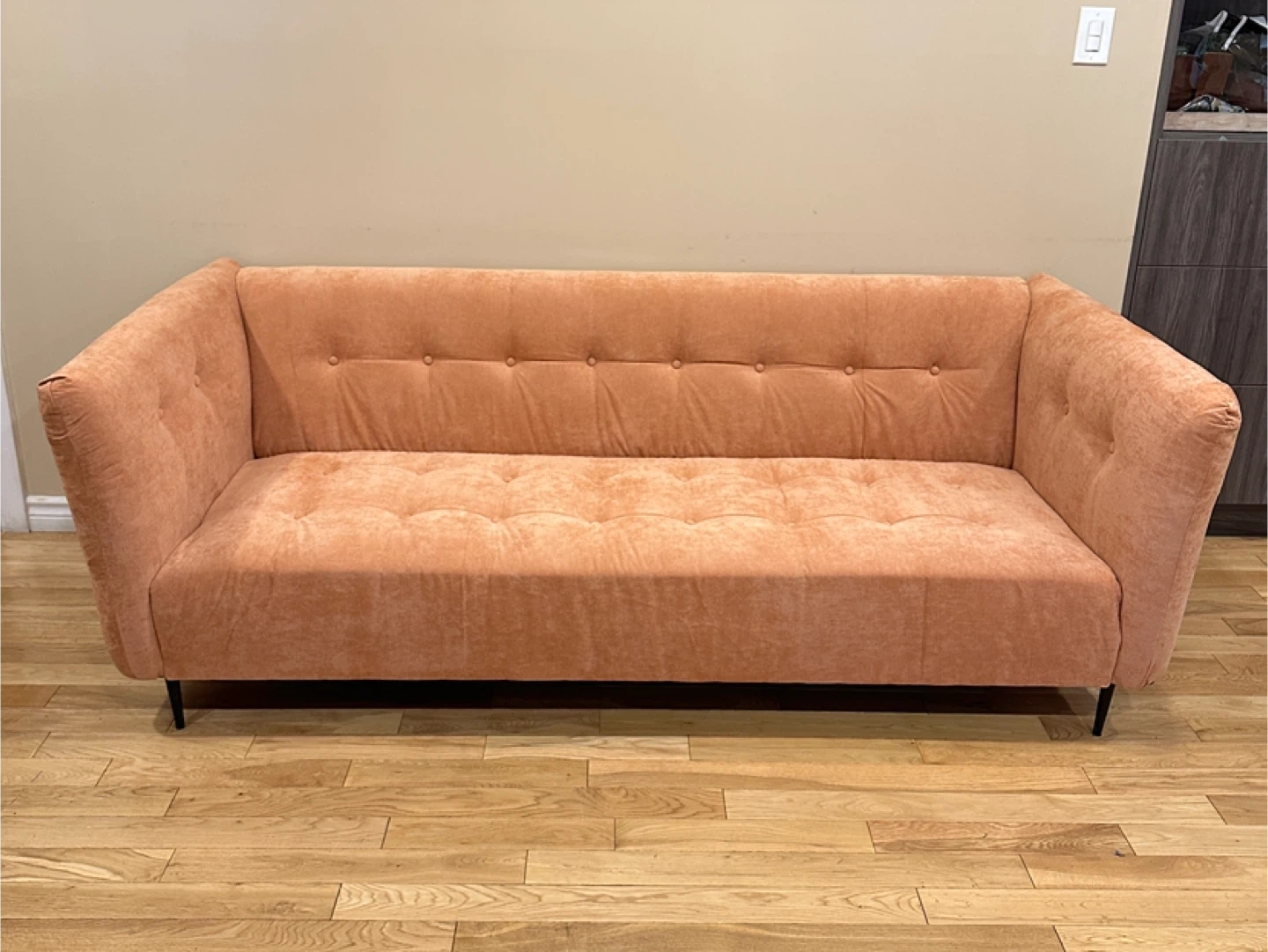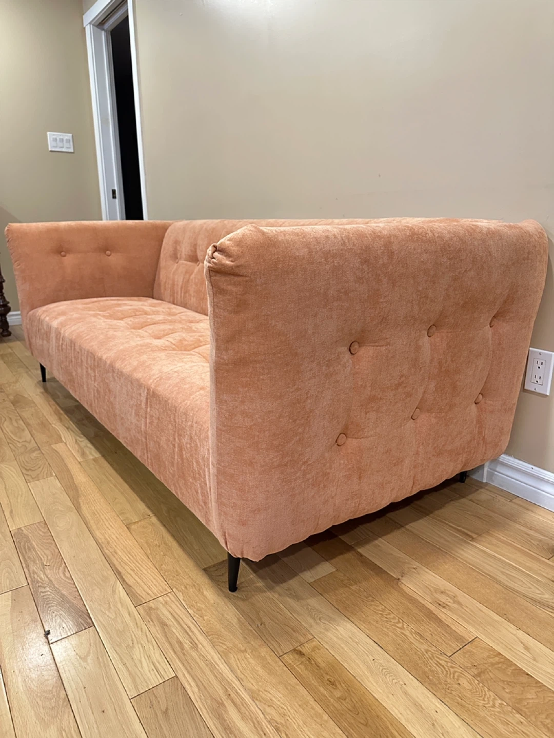 114Gorgeous MCM style modern 3-seater sofa in a warm peach/terracotta fabric. Features a sleek boxy shape with tufted cushions and slim black metal legs for a stylish mid-century look. Very comfortable and in excellent, like-new condition from a smoke-free, pet-free home. 🌟CAN DELIVER FOR A FEE🌟 PRICE: $450 OBO Measurements: L85” × W36” × H30” Highlights: • Soft upholstery in a unique warm tone • Modern mid-century design with tufted cushions • Sturdy black metal legs • Clean and well cared for – like new Viewing in Barrhaven