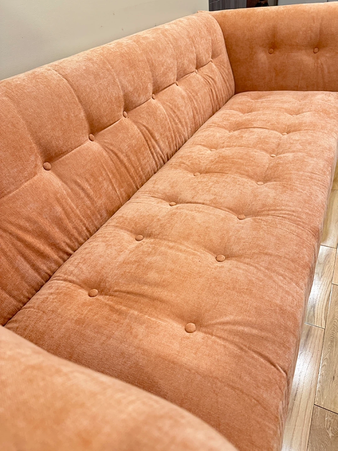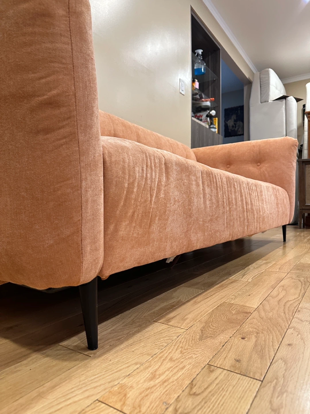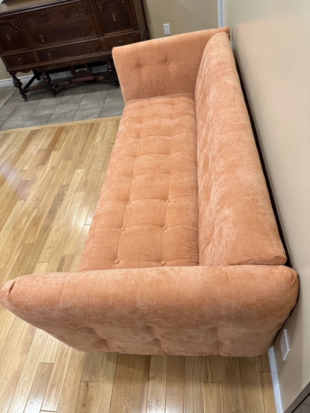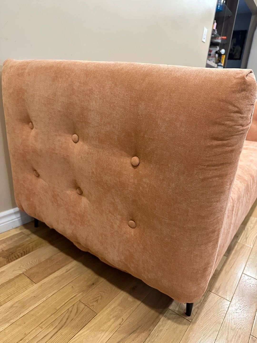 114Gorgeous MCM style modern 3-seater sofa in a warm peach/terracotta fabric. Features a sleek boxy shape with tufted cushions and slim black metal legs for a stylish mid-century look. Very comfortable and in excellent, like-new condition from a smoke-free, pet-free home. 🌟CAN DELIVER FOR A FEE🌟 PRICE: $450 OBO Measurements: L85” × W36” × H30” Highlights: • Soft upholstery in a unique warm tone • Modern mid-century design with tufted cushions • Sturdy black metal legs • Clean and well cared for – like new Viewing in Barrhaven