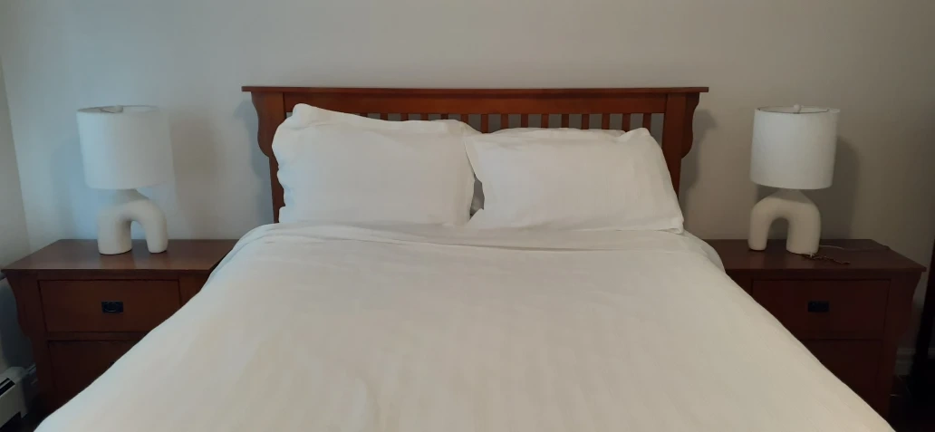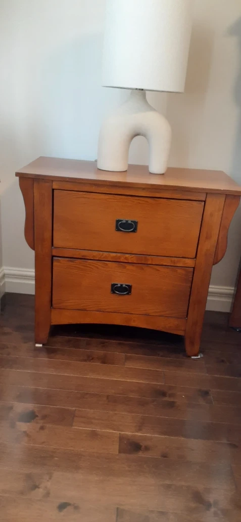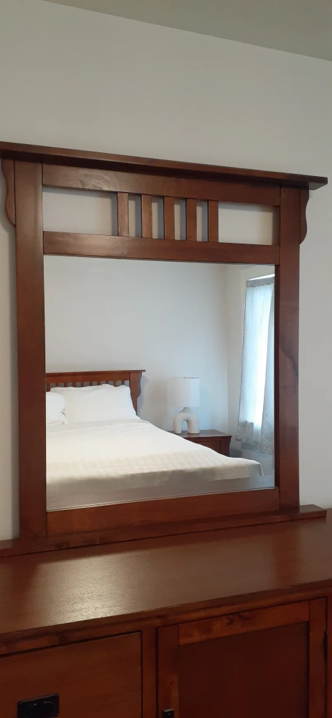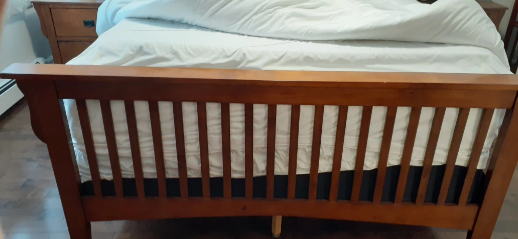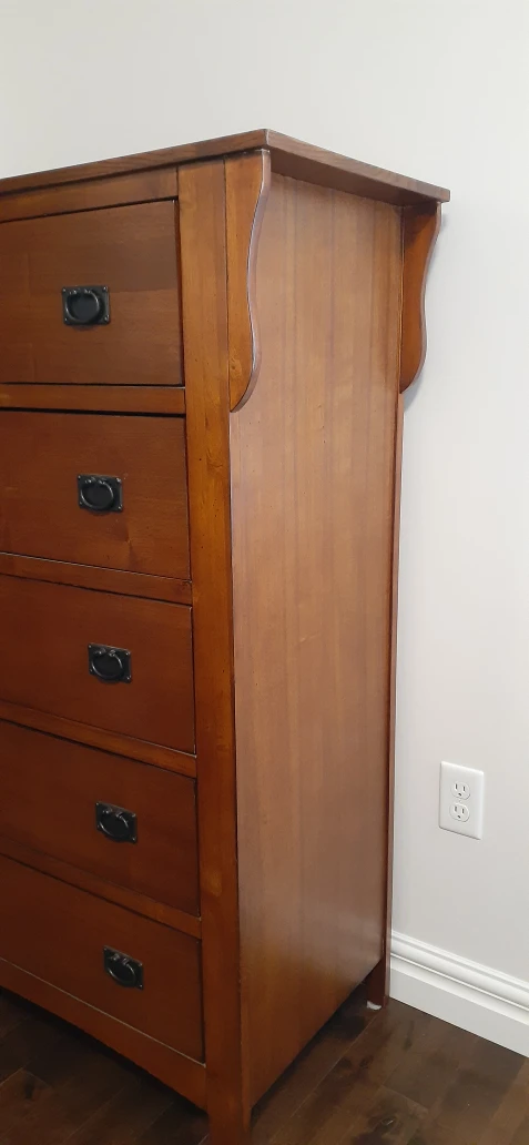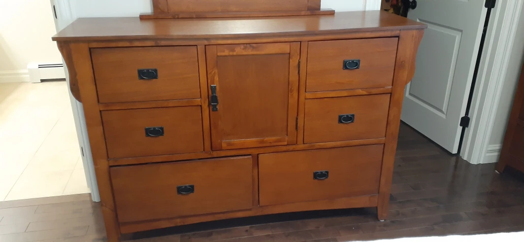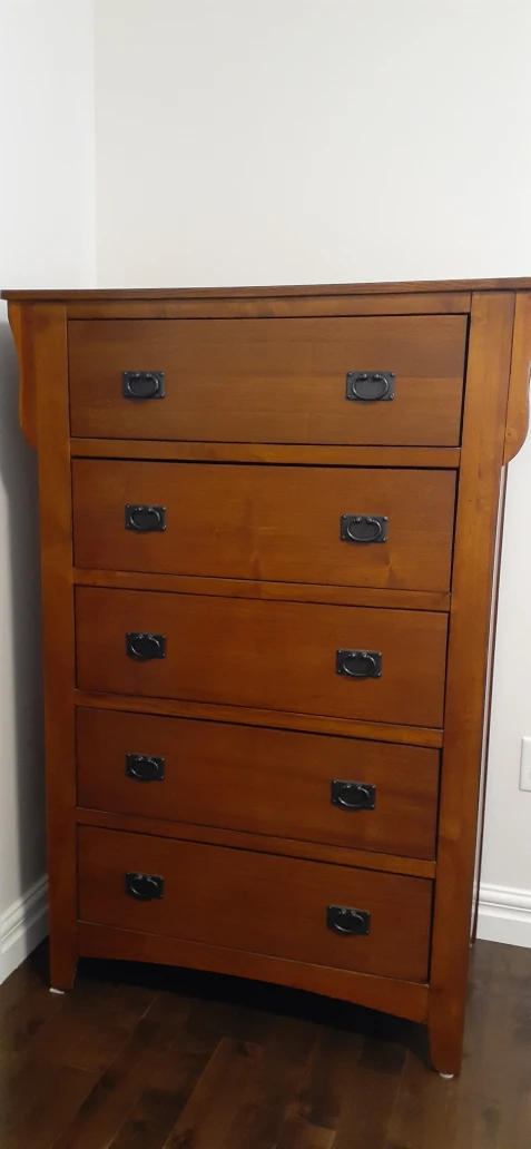 5- vanity with mirror : 6 drawer / + middle cupboard-like square storage. 46cm depth X 152cm wt X 103cm ht - high boy dresser : 5 drawer : 46cm depth X 92cm wt X 133cm ht - 2 nightstands: 2 drawer: 41cm depth X 76cm wt X 66cm ht - queen with headboard and footboard. - Including Kingsdown queen size mattress, boxspring (both 1 year old).