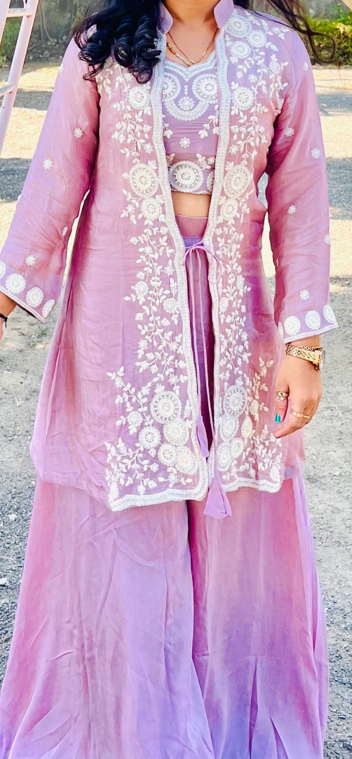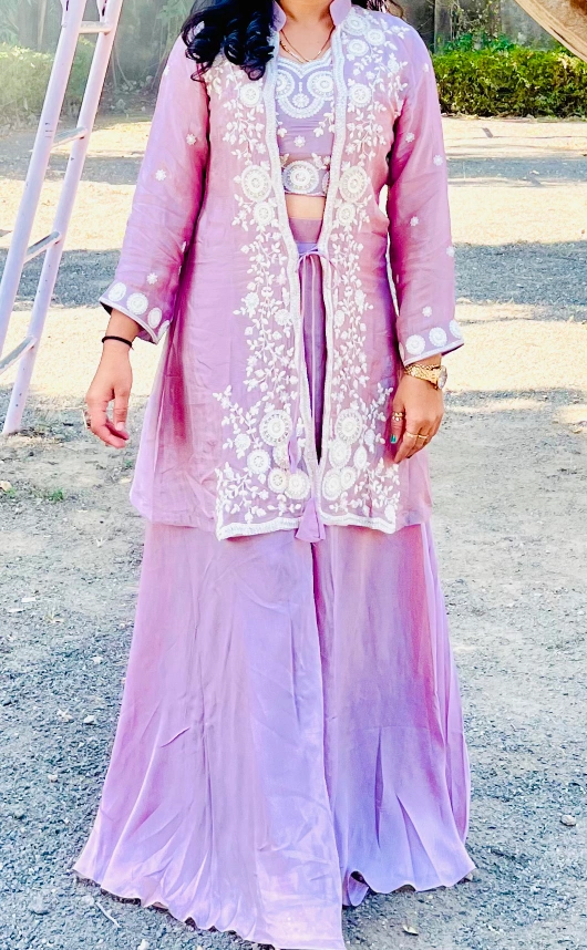 10Beautiful lilac three-piece outfit with intricate white embroidery. This stylish set includes a long jacket, a crop top, and wide-leg pants. Perfect for a special occasion or a chic everyday look!