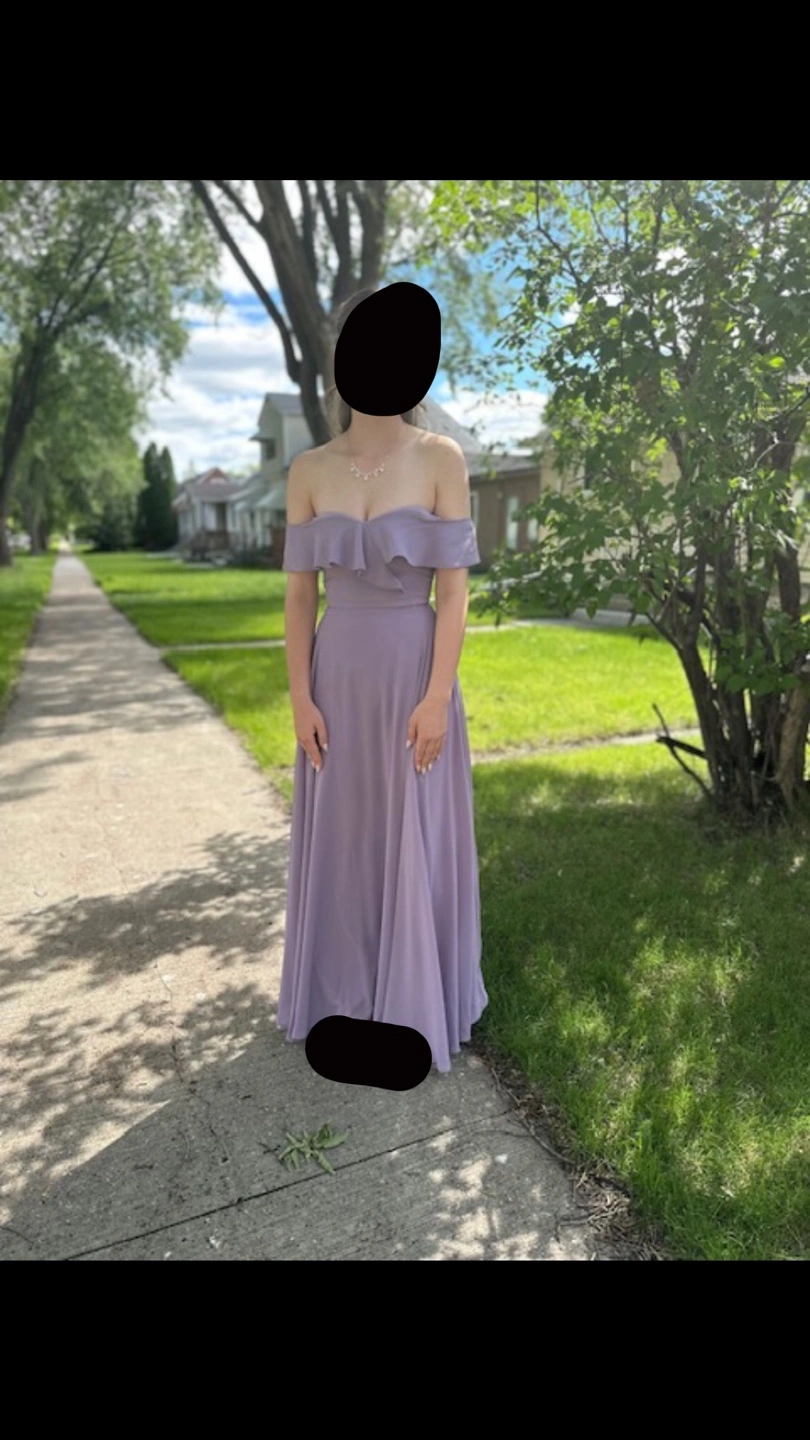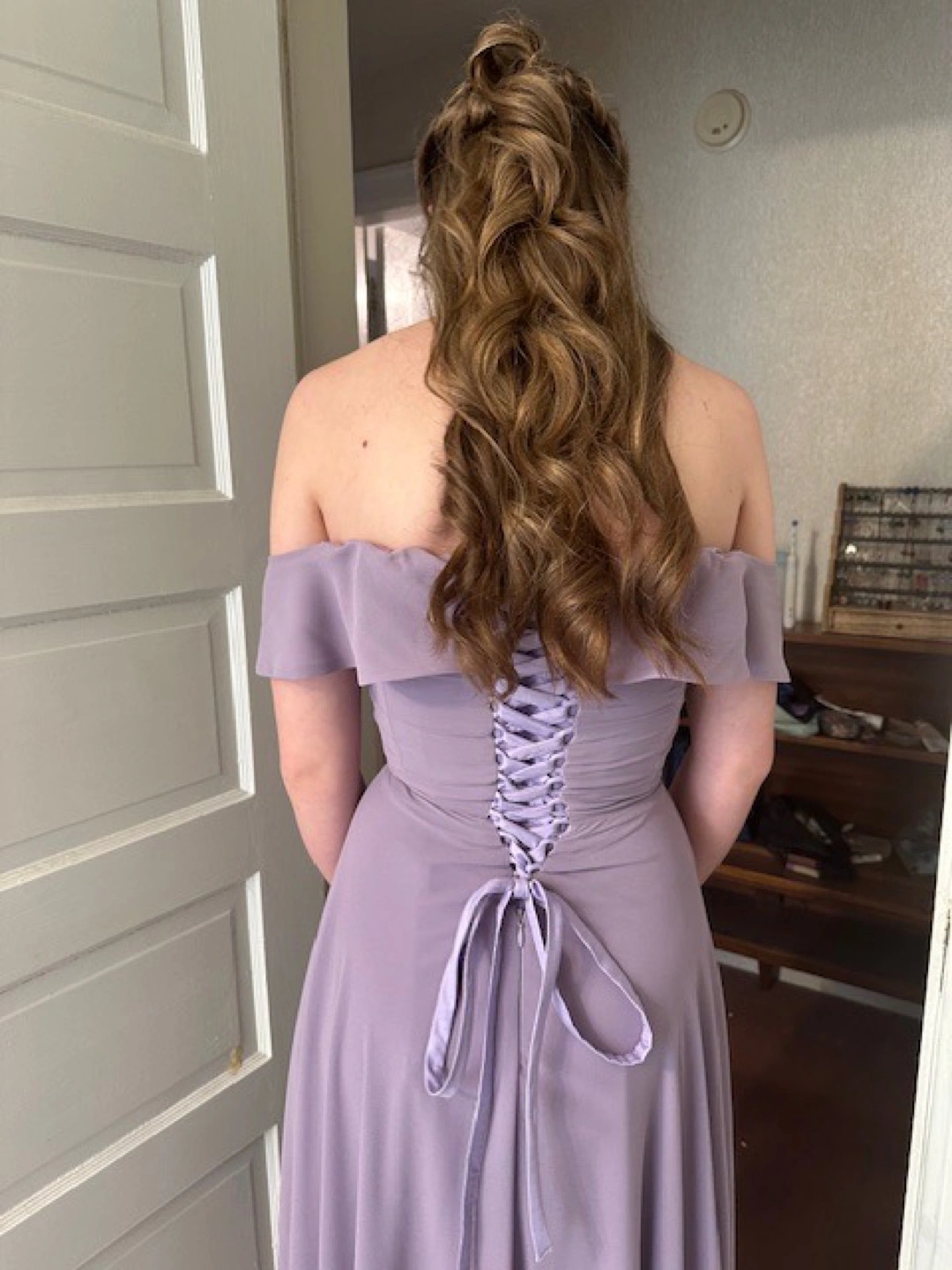 15Gorgeous lilac grad dress. Off-the-shoulder neckline, flowy maxi length. Lace-up back detail. Perfect for a special occasion.