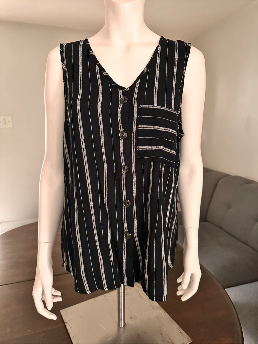 75Here's a cute Lily Morgan sleeveless top! It's black with thin white stripes and has a button-up front. Size M/M.