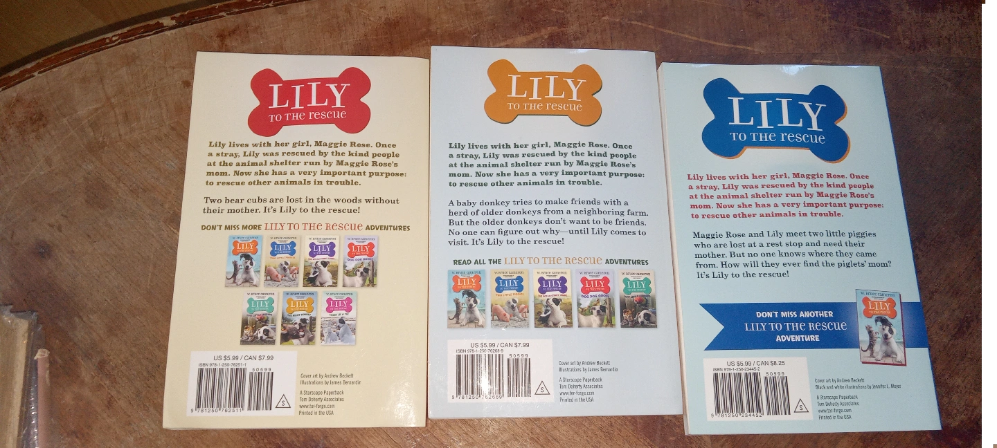 Set of six children's books featuring Lily the dog. Each book follows Lily and her girl, Maggie Rose, as they rescue various animals. Includes: The Three Bears, The Misfit Donkey, Two Little Piggies, The No-So-Stinky Skunk, Dog Dog Goose. each book has like indents ontop of some pages in each book. I don't think it's anything too serious the pages still turn without any incidents there a couple of photos that you might be able to see what I'm trying to explain