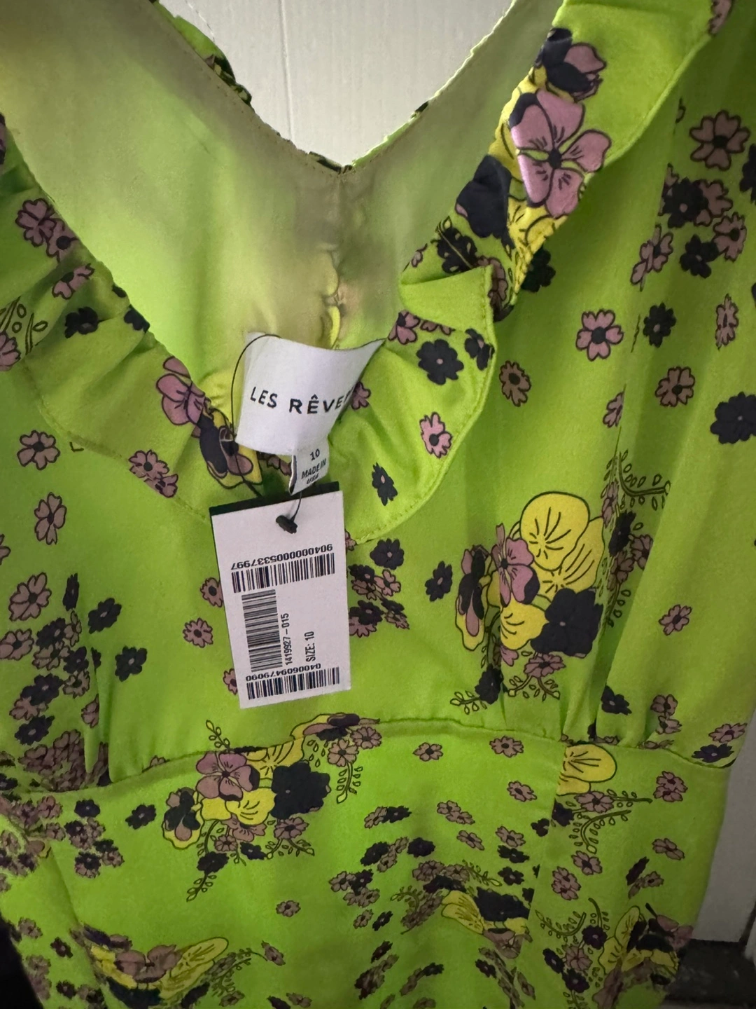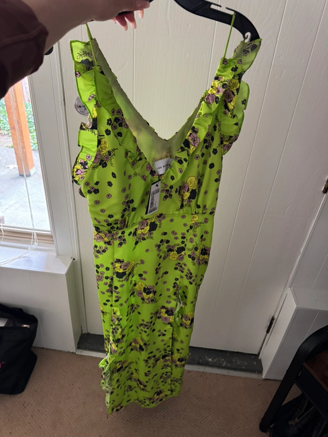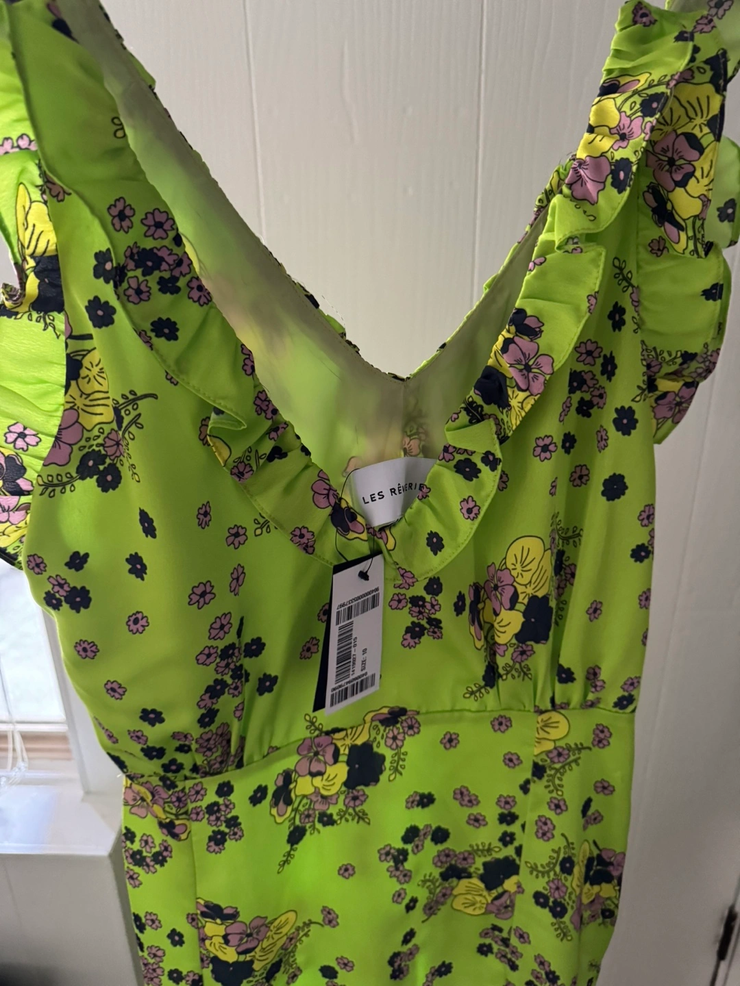 32Beautiful lime green midi dress. Features a V-neckline, ruffle details on the straps and bodice, and a lovely floral print. Lightweight fabric. Perfect for spring or summer.