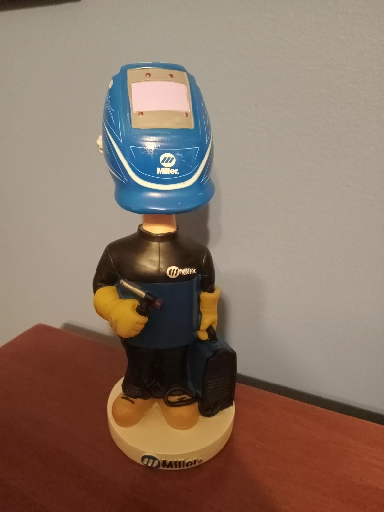 15Selling a Limited Edition Miller welding bobblehead figurine! It's in great shape and would make a fun addition to any collection or workspace. The figurine features a welder wearing a blue welding helmet with the Miller logo, along with a welding torch and carrying case. A tape measure in one of the pictures shows it is approximately 8 inches tall.