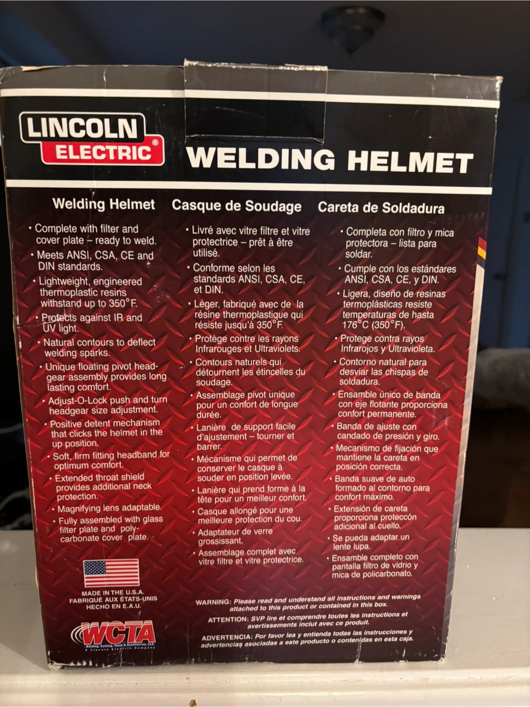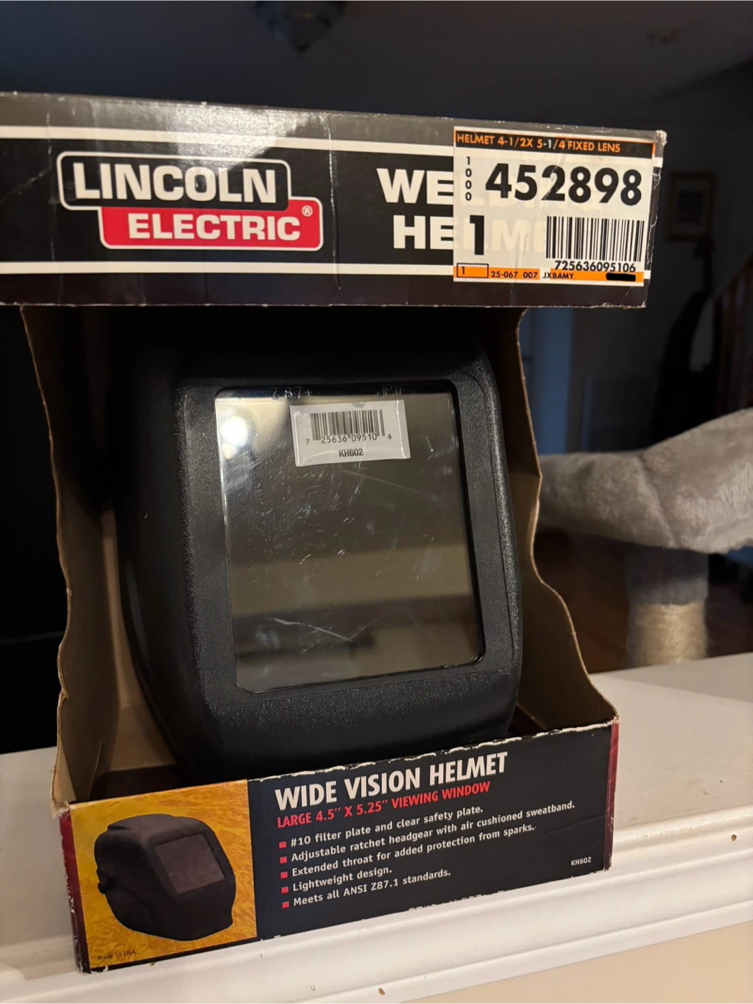 Selling a Lincoln Electric welding helmet with a wide viewing window. It comes complete with a filter and cover plate, ready to weld. - Meets ANSI, CSA, CE, and DIN standards - Lightweight engineered thermoplastic resins withstand up to 350°F - Protects against IR and UV light - Natural contours to deflect welding sparks - Unique floating pivot head-gear assembly provides long lasting comfort - Adjustable ratchet headgear for size adjustment - Lightweight design - Extended throat shield provides additional neck protection It also meets all ANSI Z87.1 standards