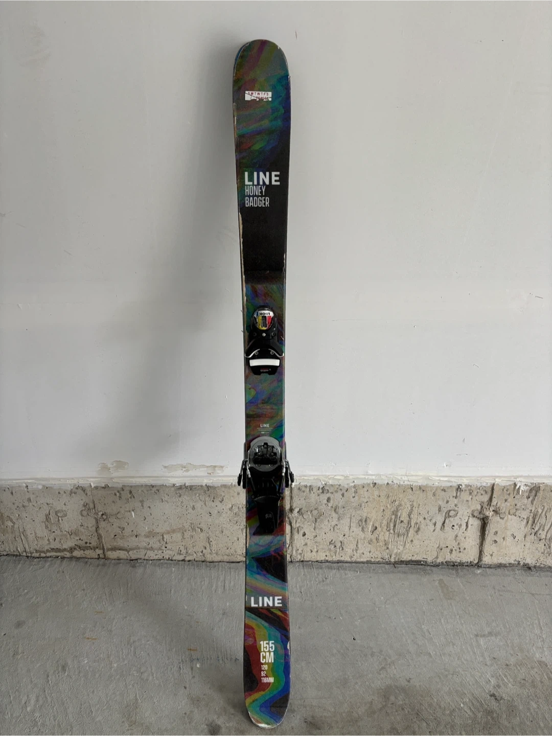 Selling a pair of Line Honey Badger skis. They are 155 cm in length. The dimensions are 120mm / 92mm / 116mm. Ready for some fun on the slopes! Note, they are pretty beat up as were used mostly in the park.