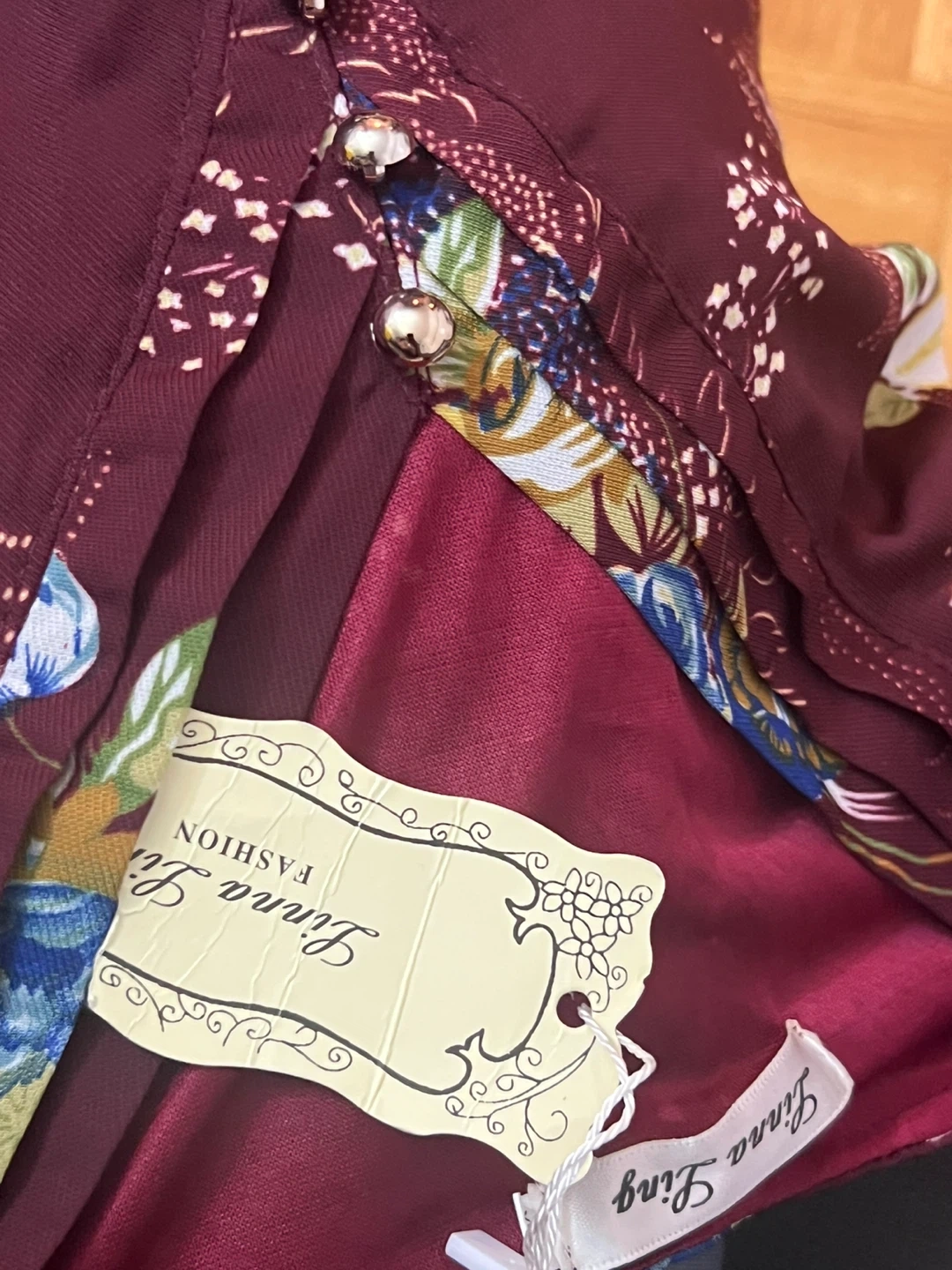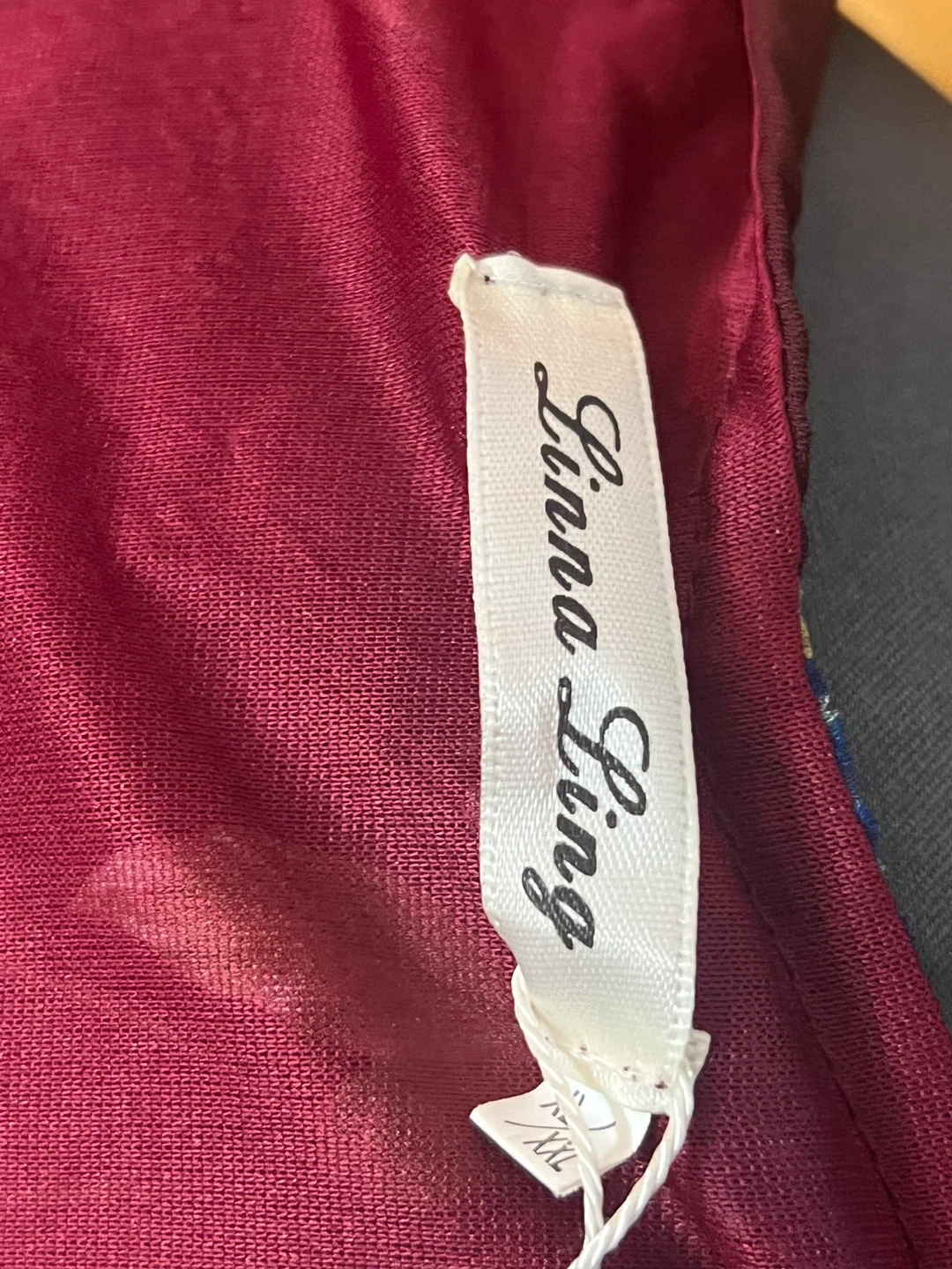 Beautiful Linna Ling wrap dress in size XXL. The dress features a lovely floral print on a rich burgundy background. Perfect for any occasion!