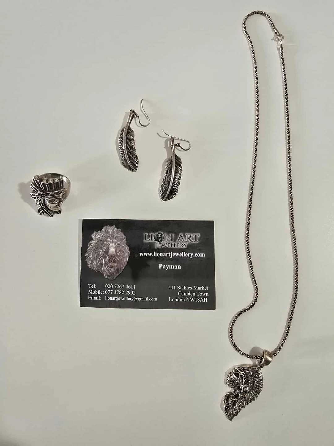 Selling a Lion Art Jewellery set. Includes a necklace and a ring. All pieces are in great condition! (the feather earrings have been sold) These pieces were individually created in Camden Village in London. Would make a unique gift for someone special! Open to selling ring and necklace separately.