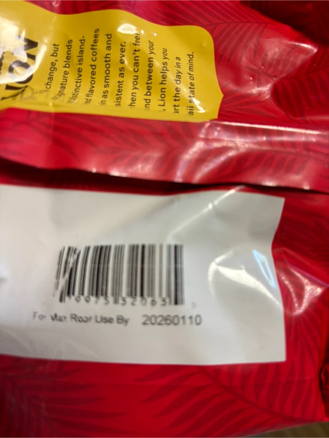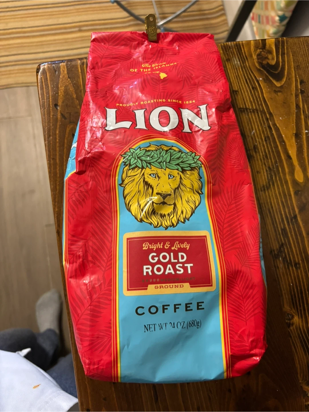 Selling a bag of Lion Coffee, Gold Roast, ground coffee. The bag contains 24oz (680g) of coffee. The 'For Max Roast Use By' date is 2026 January 10