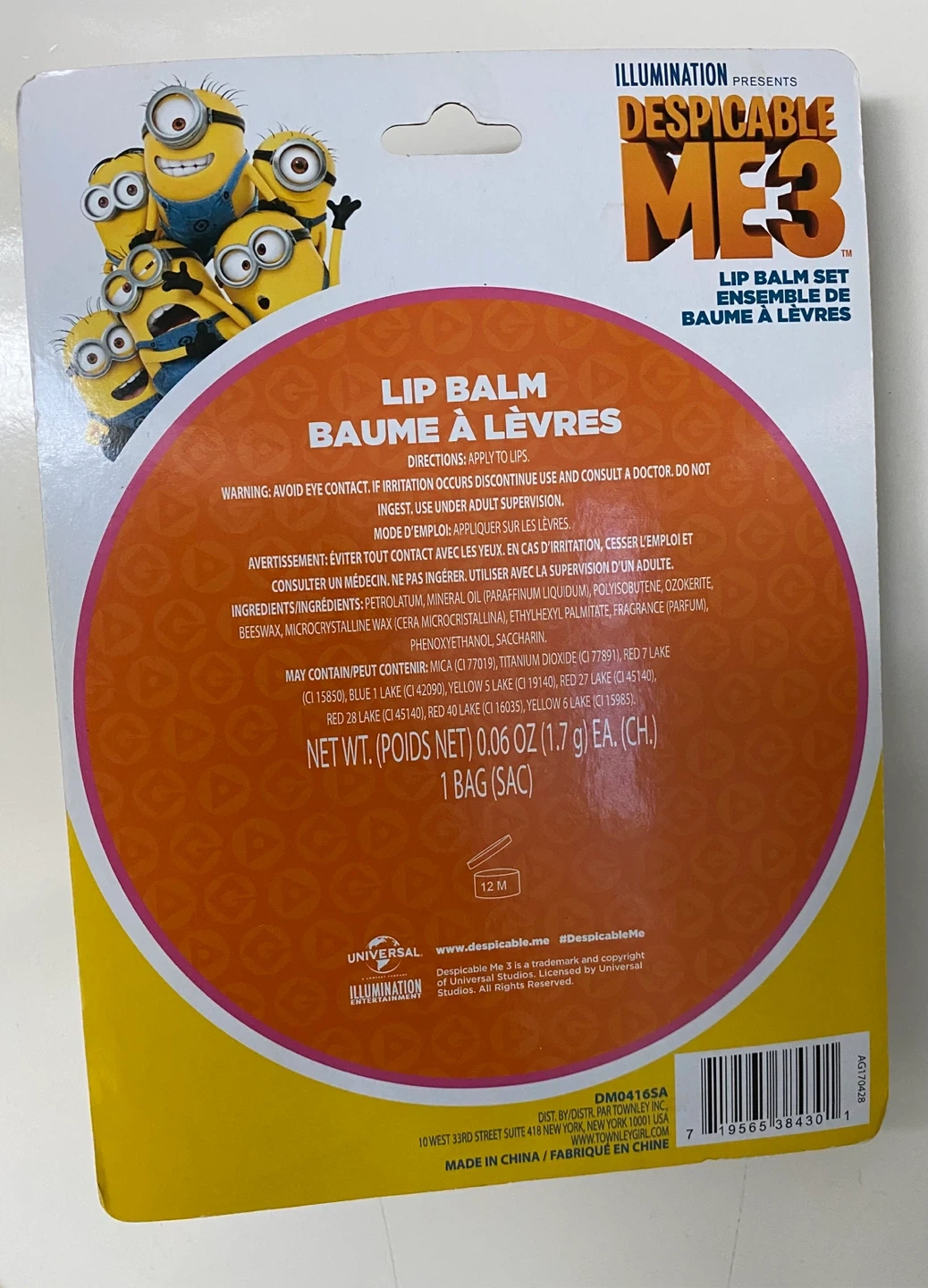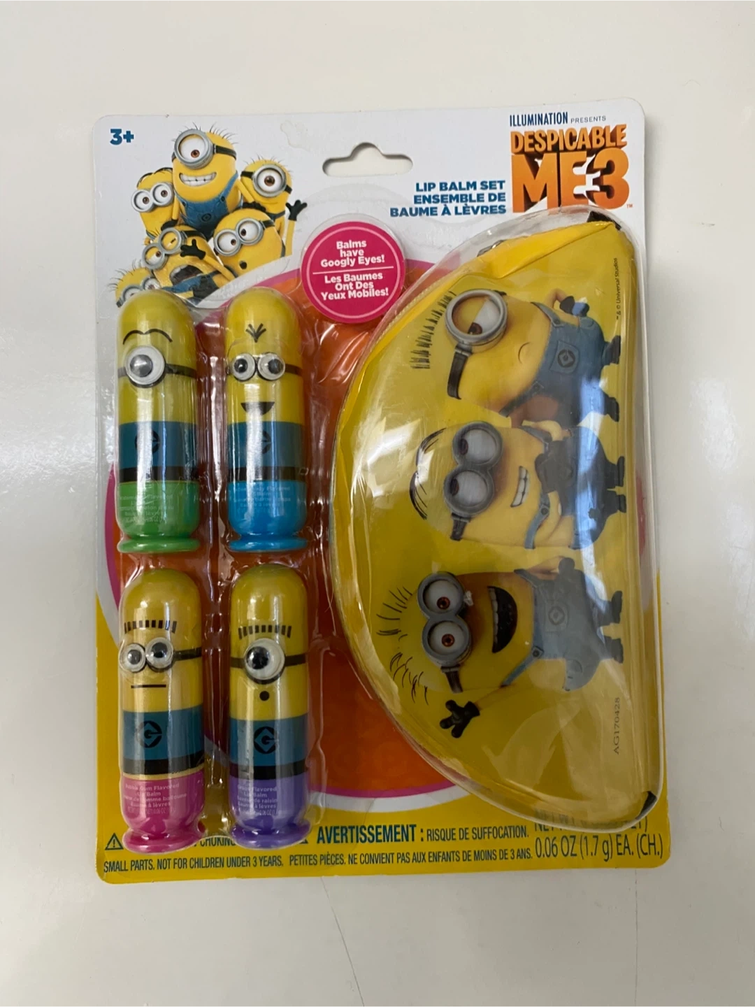 This ‘Despicable Me 3’ lip balm set is perfect for kids 3+. It includes 4 lip balms (with googly eyes) and a carrying case. The lip balms are 0.06 oz (1.7 g) each. New, in sealed package.