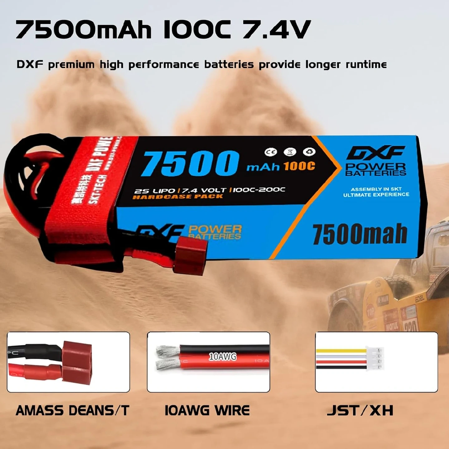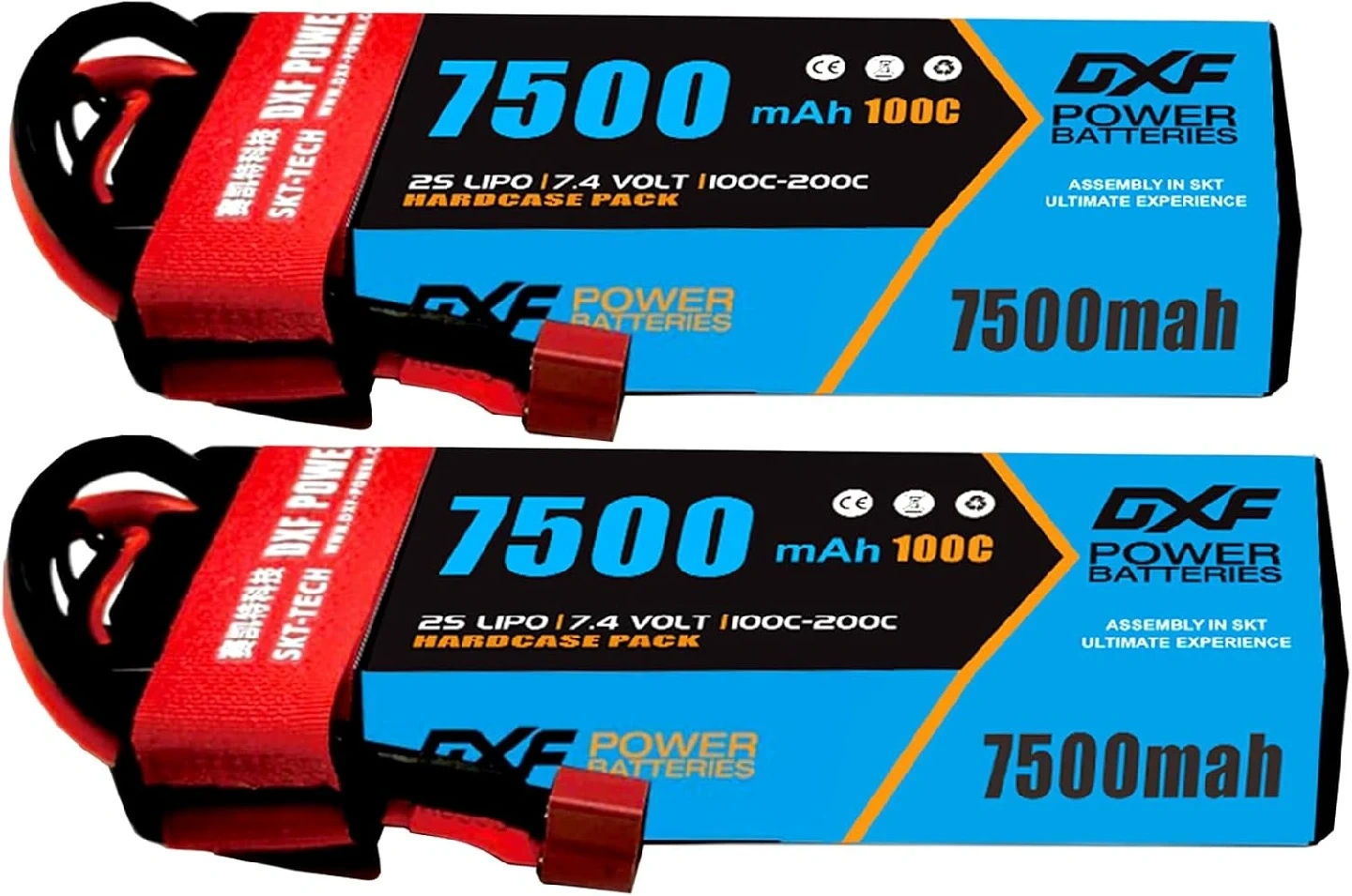 754DXF Explosive Power 2S LiPo Battery 7500mAh 7.4V 100C HardCase rc Battery with Deans Connector for RC Car, Truck, Truggy, Boat - LiPo Battery 2Pack, Brand New in the Box/Sealed Features: Unleash the power with our 7.4V LIPO BATTERY – perfect for your RC CAR. This 2S LIPO BATTERY PACK delivers a staggering 100C discharge rate! Engineered for performance, this 7.4V BATTERY PACK fits 1/10 and 1/8 scale RC vehicles like Bandit, Rustler, Losi, and Team Associated.(Only if the voltage, dimension and the plug match, then it will fit). With a massive 7500mAh capacity, this LIPO BATTERY ensures your RC CAR runs longer and harder. Ideal for intense racing sessions! Compact and durable, the 7.4V BATTERY measures 138*47*25mm, making it a perfect fit for various RC models. Lightweight at just 323g! Enhance your RC experience with our premium 7.4V LIPO BATTERY. Compatible with a wide range of RC CARS, it’s your go-to power source!