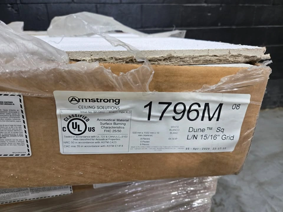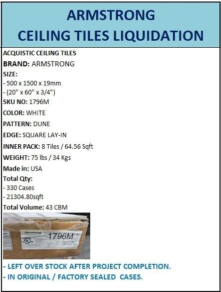 60DROP CEILING TILES Brand: ARMSTRONG Size: 20 x 60 x 3/4" Inches Size: 500x1500x19 mm SKU No: 1796M Color: White Pattern: DUNE Edge: Square lay-In Inner Pack: 8 Tiles / 64.56 Sqft Weight: 75 Lbs / 34 Kgs Made in: USA Total Qty: 330 Cases Total Sqft: 20,982 Sqft Total Sqmts: 1949.29 Sqmt Total Volume: 43 CBM Feel free to message if you have any questions!
