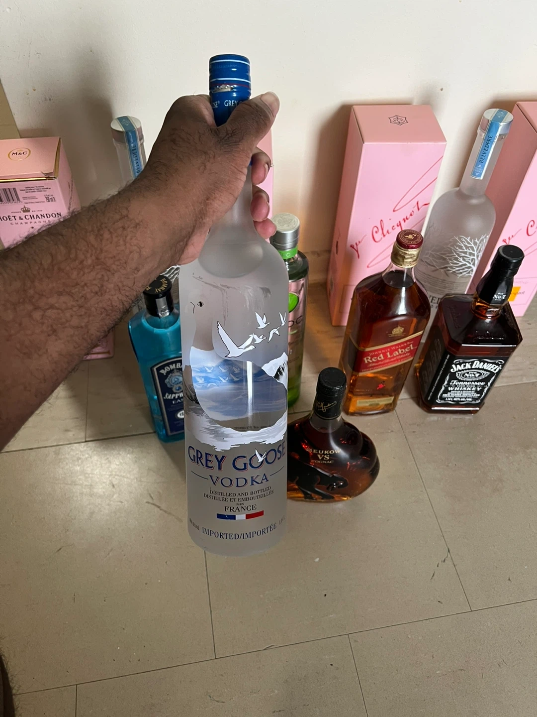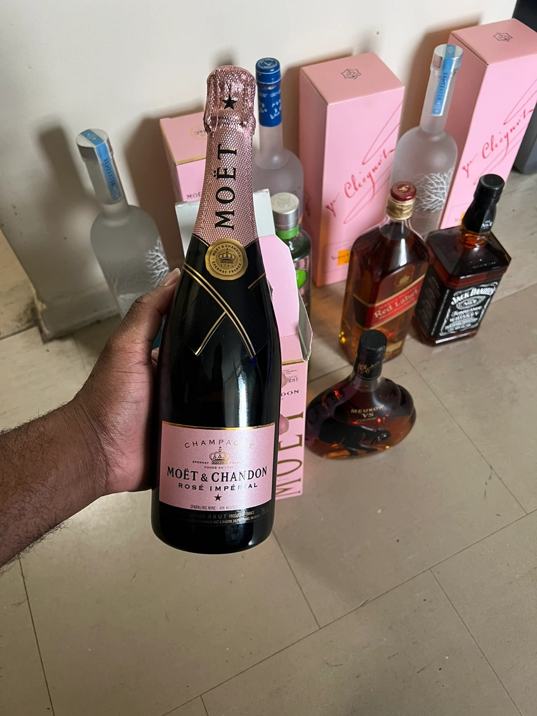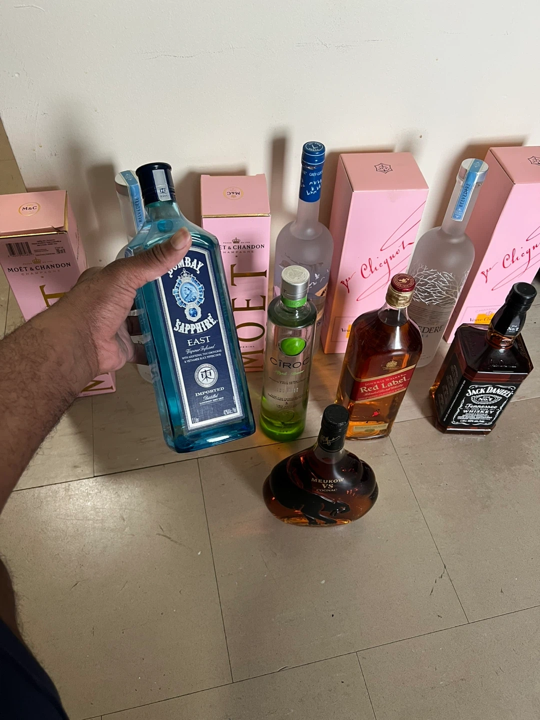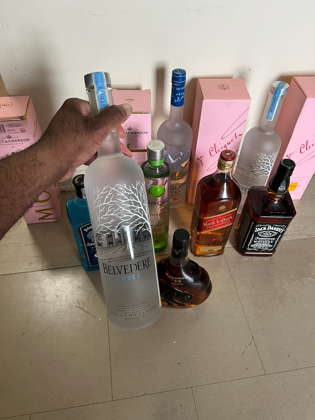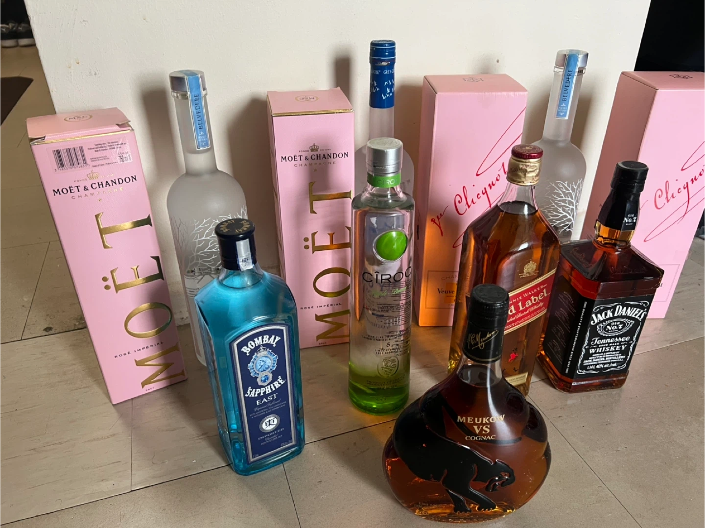 Selling a variety of liquor bottles including Moet & Chandon Rose Imperial, Veuve Clicquot Rose, Belvedere Vodka, Bombay Sapphire Gin, Ciroc Vodka, Johnnie Walker Red Label, Jack Daniels, and Meukow VS Cognac. All bottles are unopened and in their original boxes. 1400 worth of drinks give me your best offer