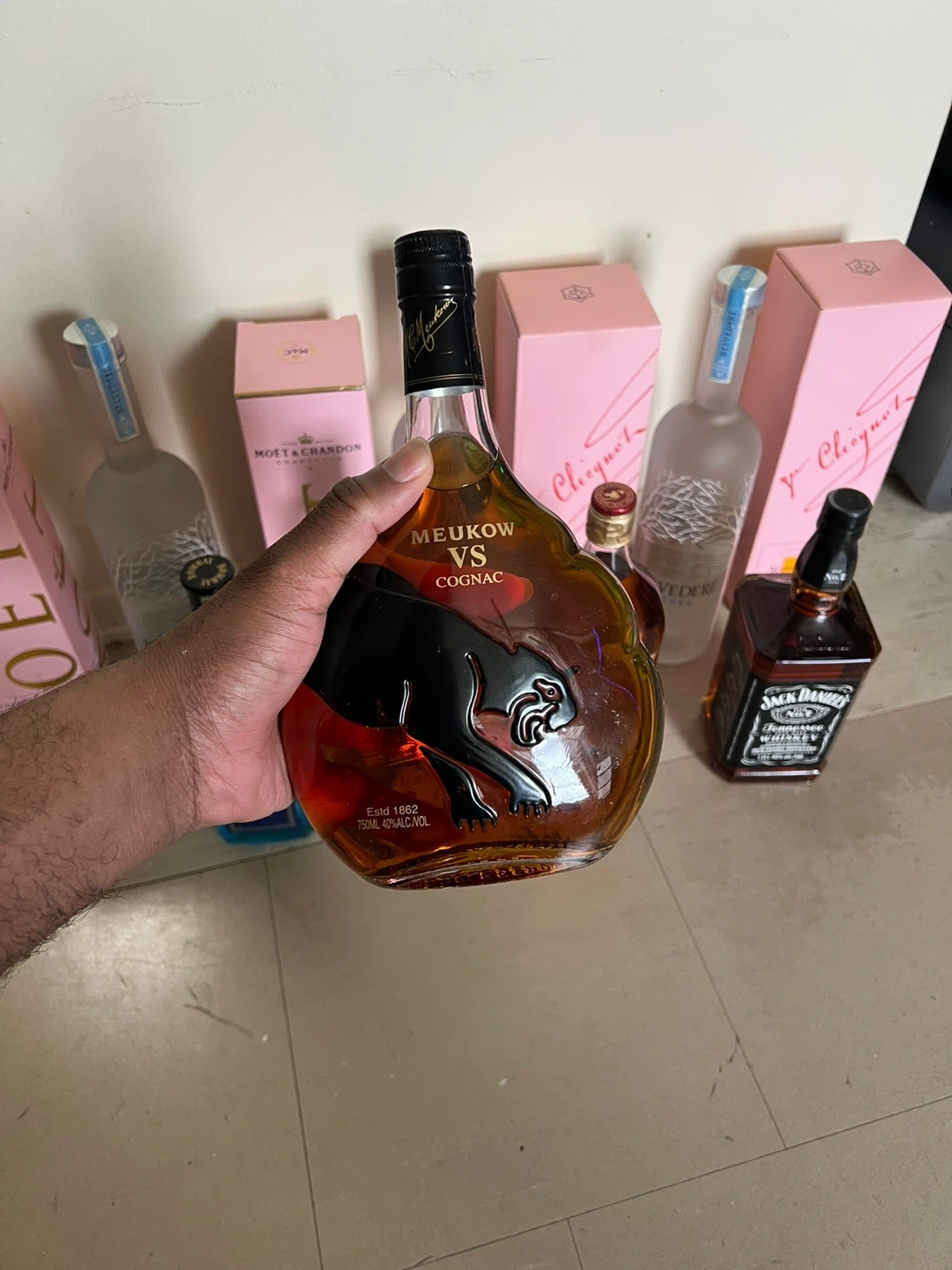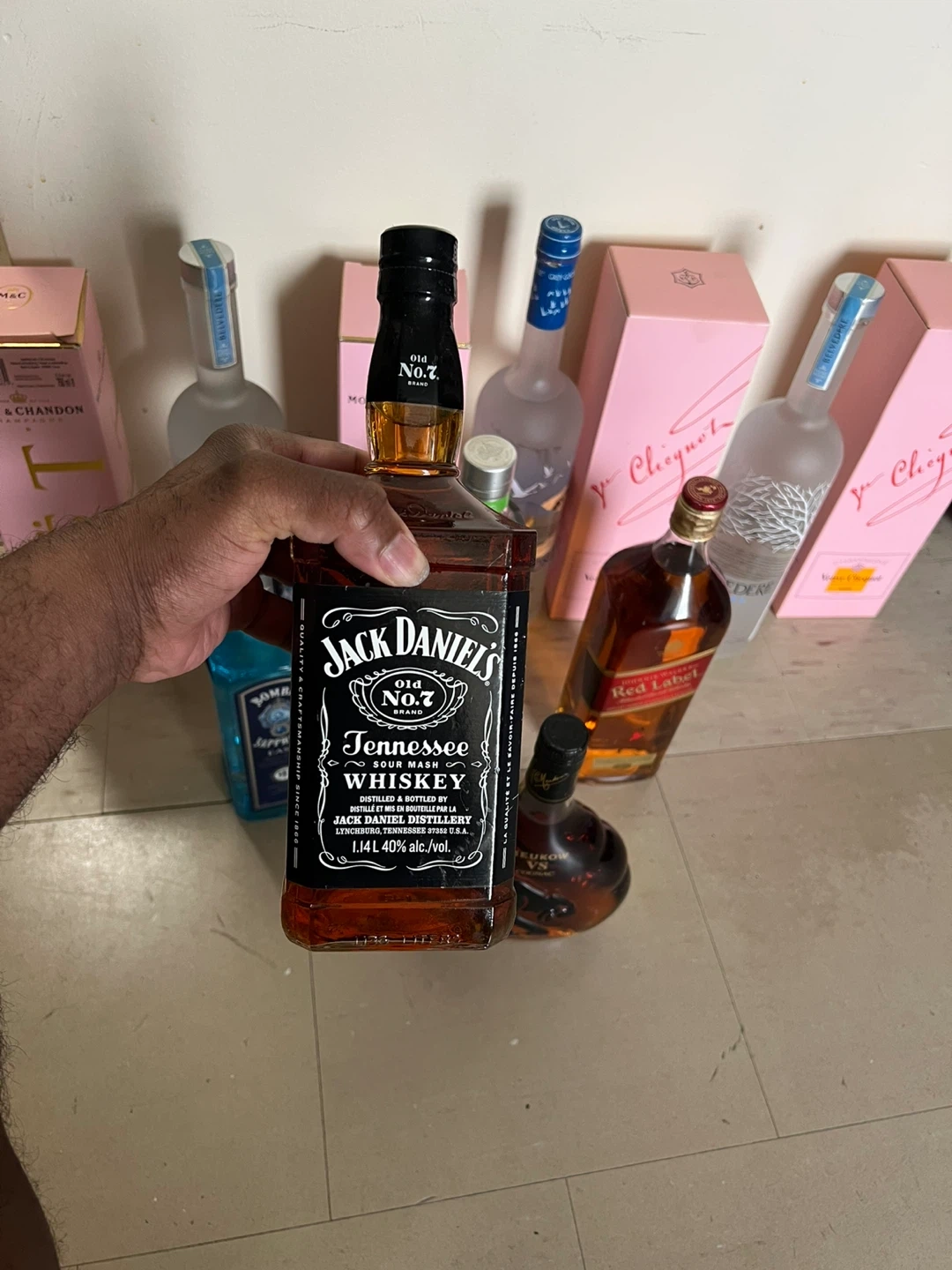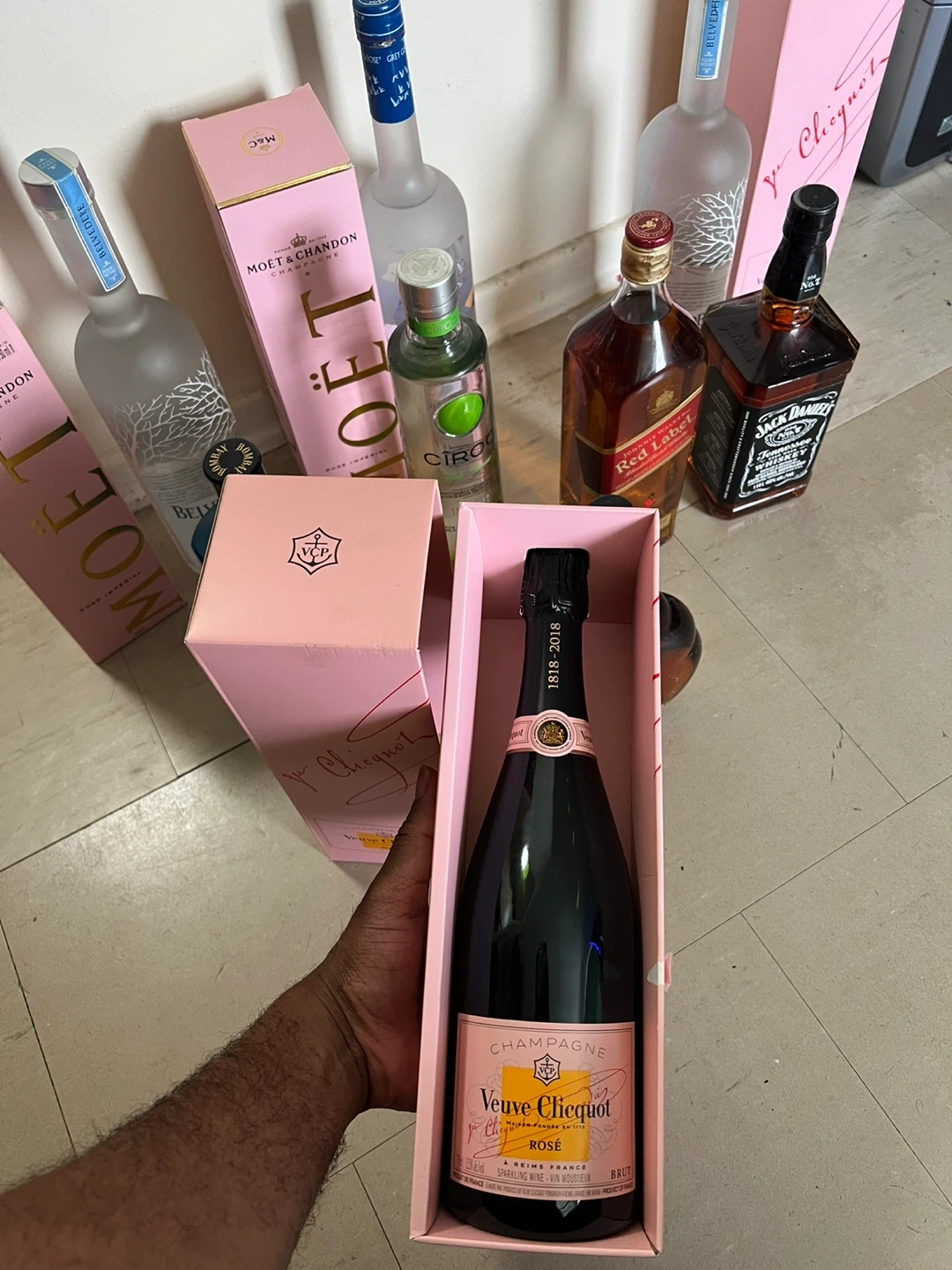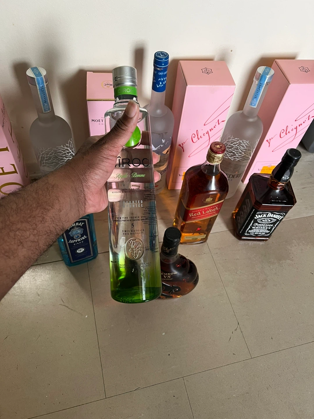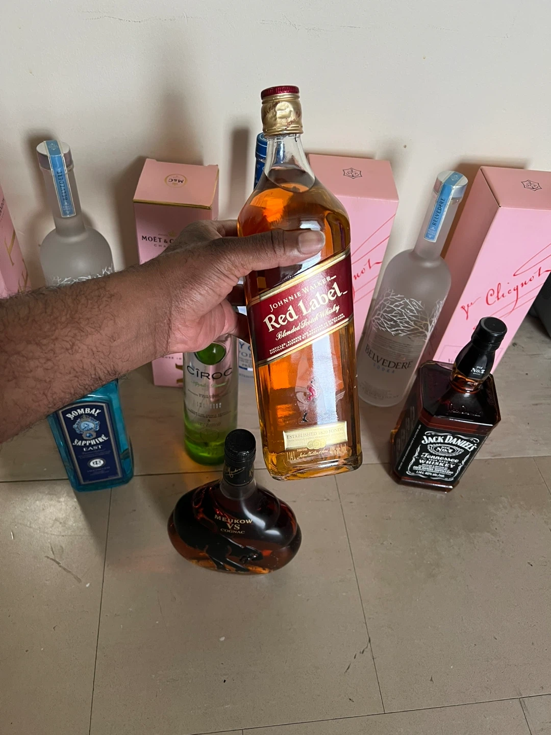 Selling a variety of liquor bottles including Moet & Chandon Rose Imperial, Veuve Clicquot Rose, Belvedere Vodka, Bombay Sapphire Gin, Ciroc Vodka, Johnnie Walker Red Label, Jack Daniels, and Meukow VS Cognac. All bottles are unopened and in their original boxes. 1400 worth of drinks give me your best offer
