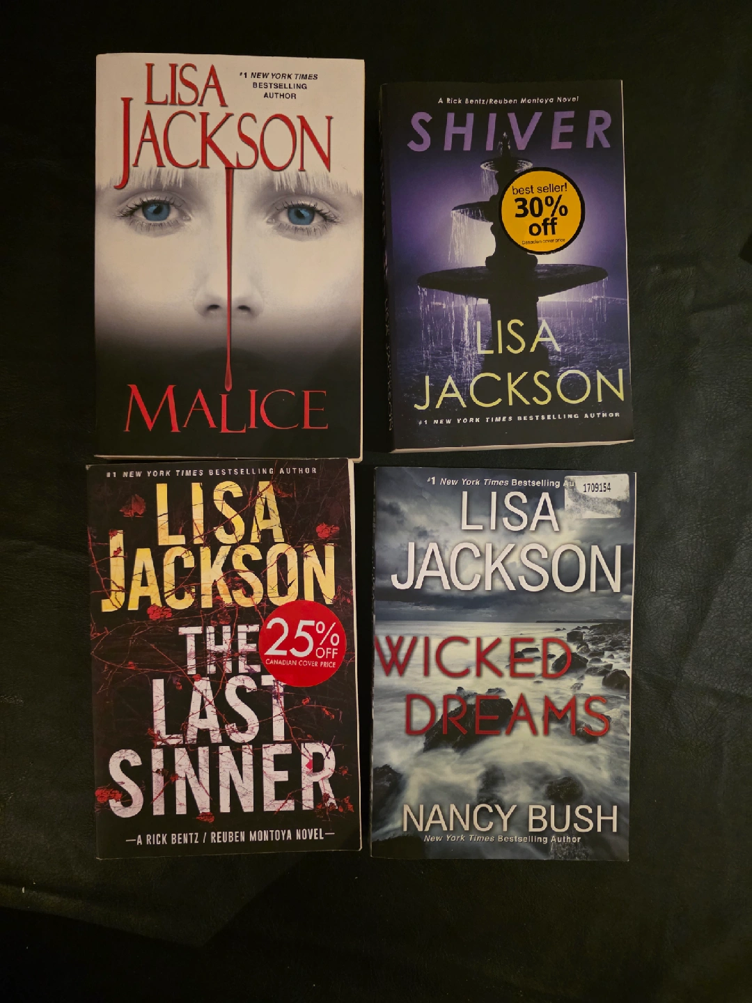 Selling a set of Lisa Jackson novels. Includes Wicked Dreams (Nancy Bush), Malice, Shiver (A Rick Bentz/Reuben Montoya Novel), and The Last Sinner (A Rick Bentz / Reuben Montoya Novel). Great for thriller and suspense fans!