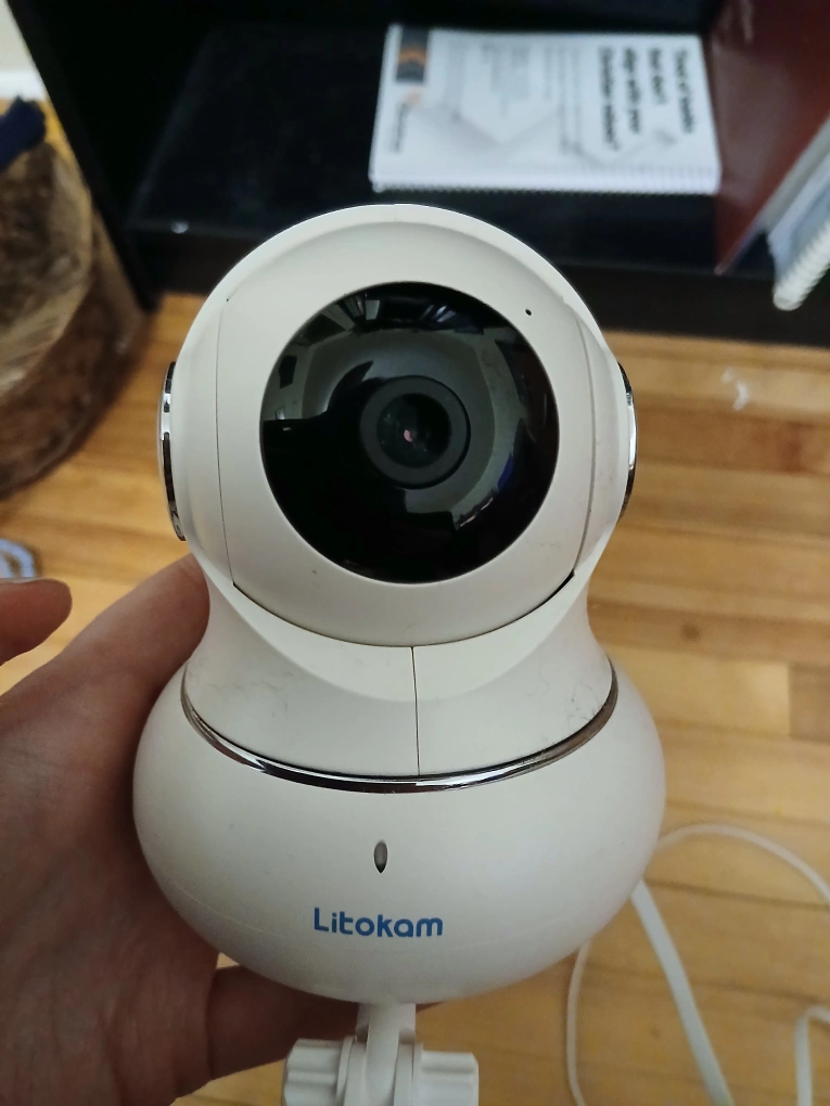 15Small white Litokam brand motion-sensor indoor camera - can be controlled with app from Litokam. Used to watch over kitties; camera pans and tilts and is easy to mount.