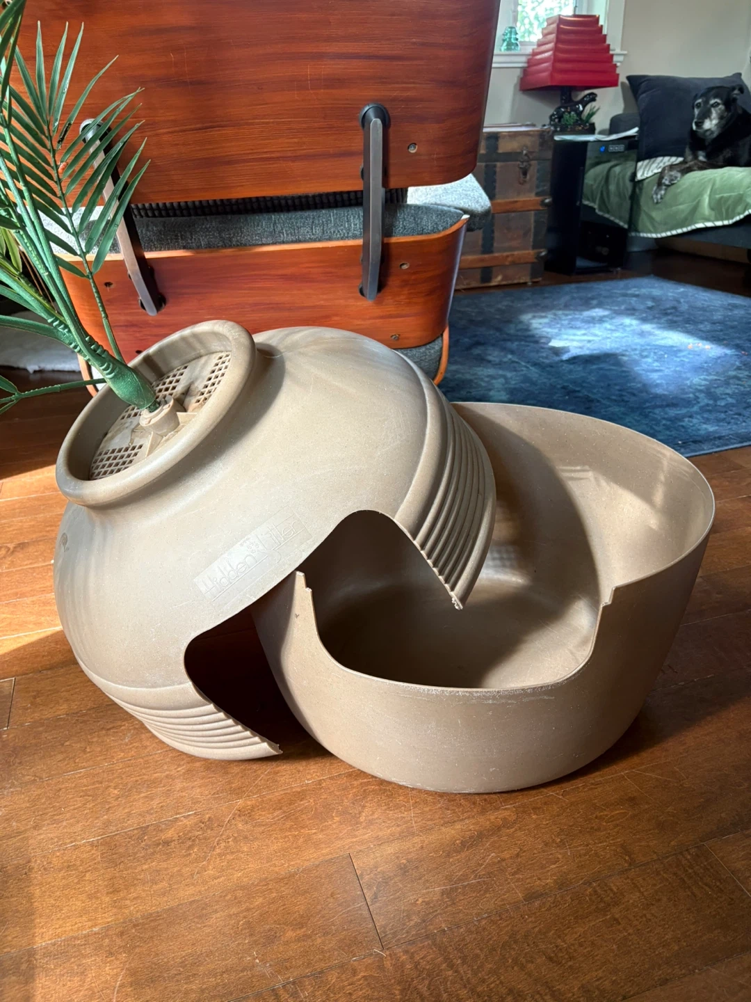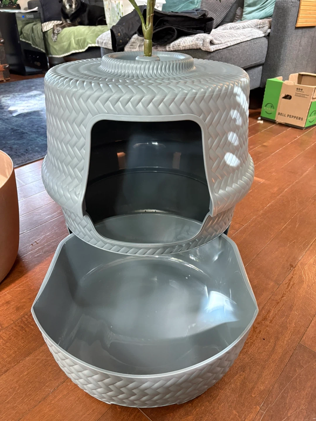 Two litter boxes. Brown one ($10) is second hand to me but works perfectly, larger in diameter. Grey one was brand new, used for a week, cat totally rejected it, did his ‘business’ everywhere but the litter box. Paid $89 for it, asking $20. Just need them gone. Don’t have the space.