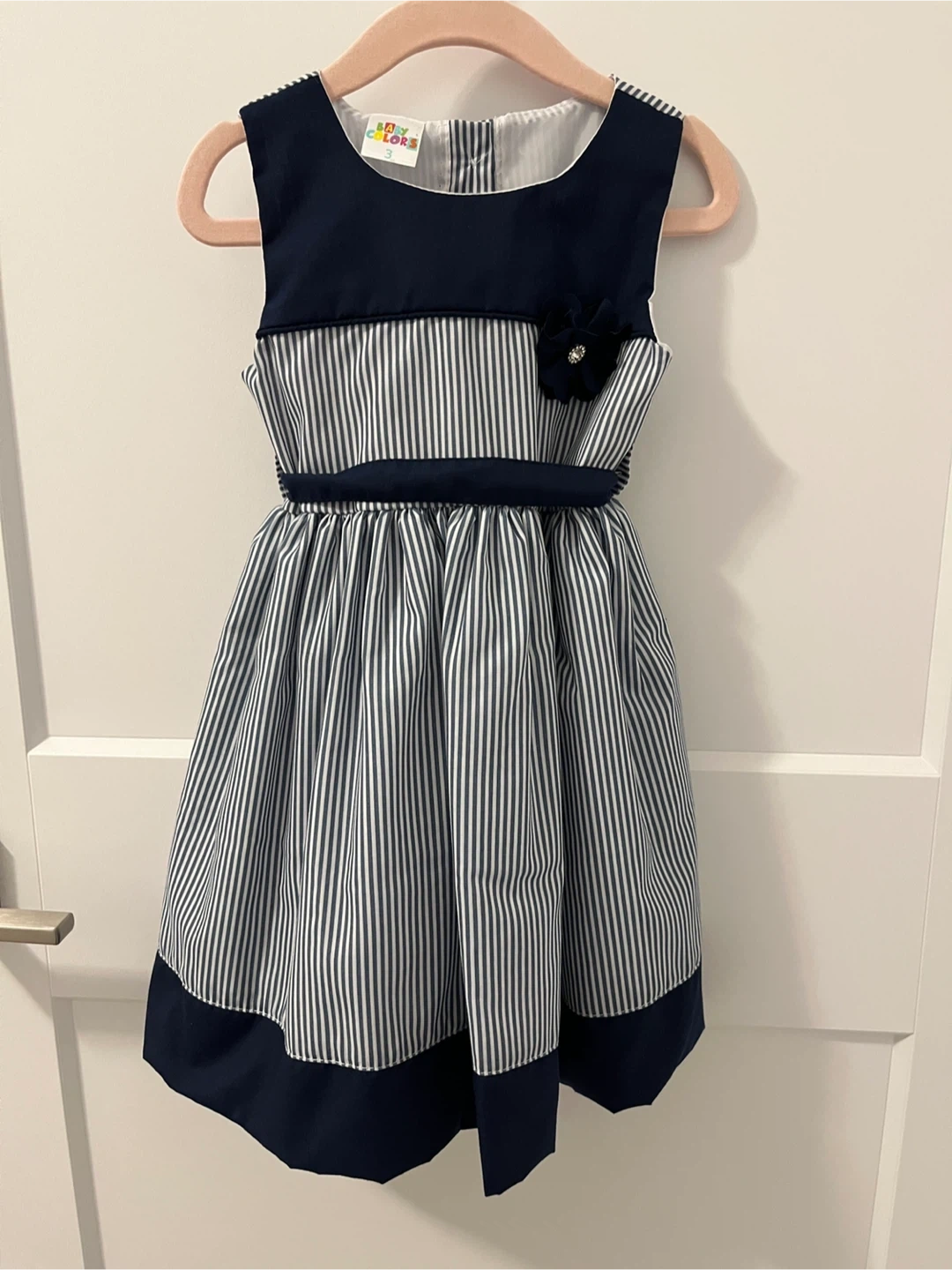 A cute dress size 3T It features a striped pattern with navy blue accents and a bow at the waist. Perfect for any occasion! New with no tags.