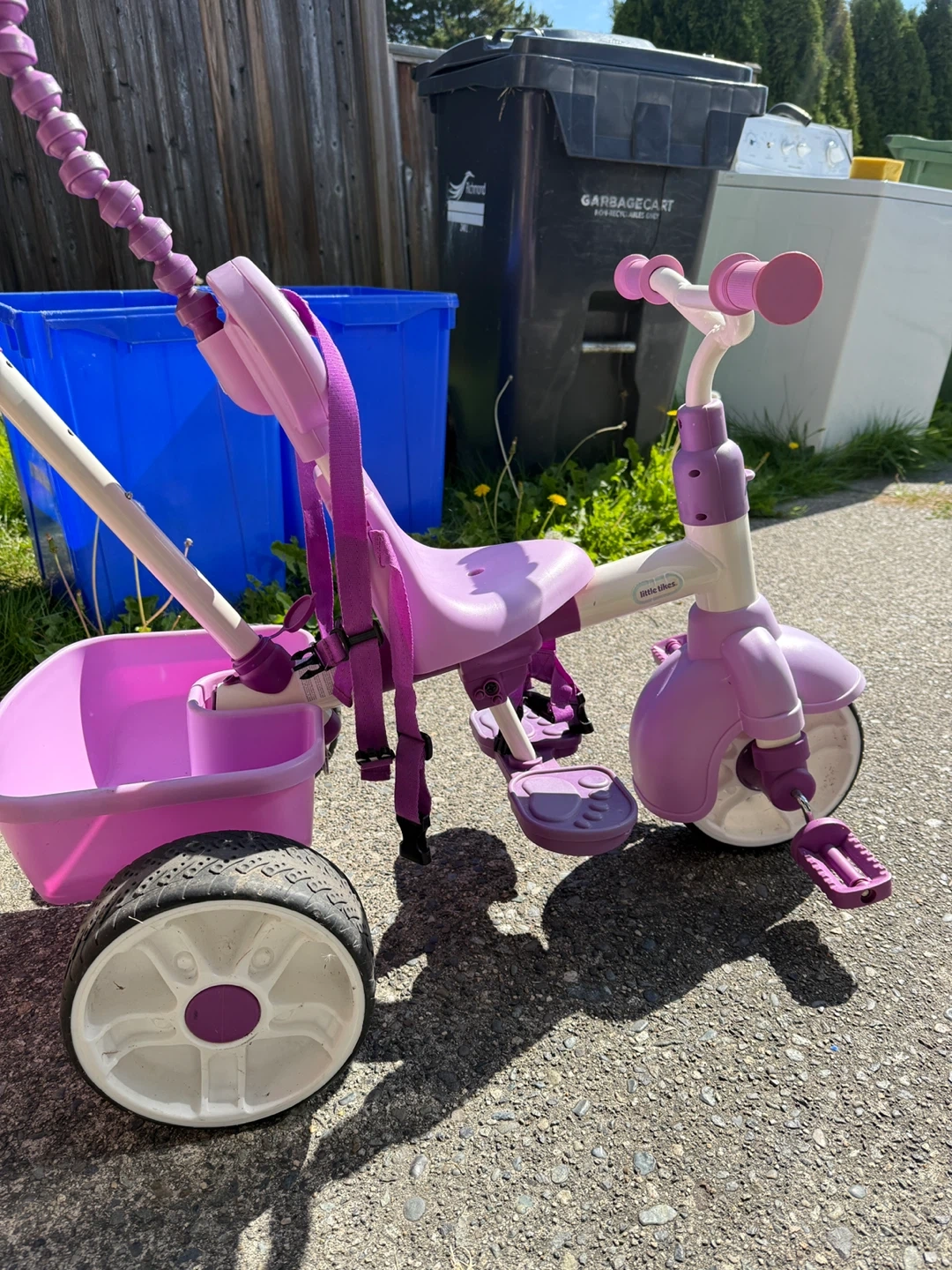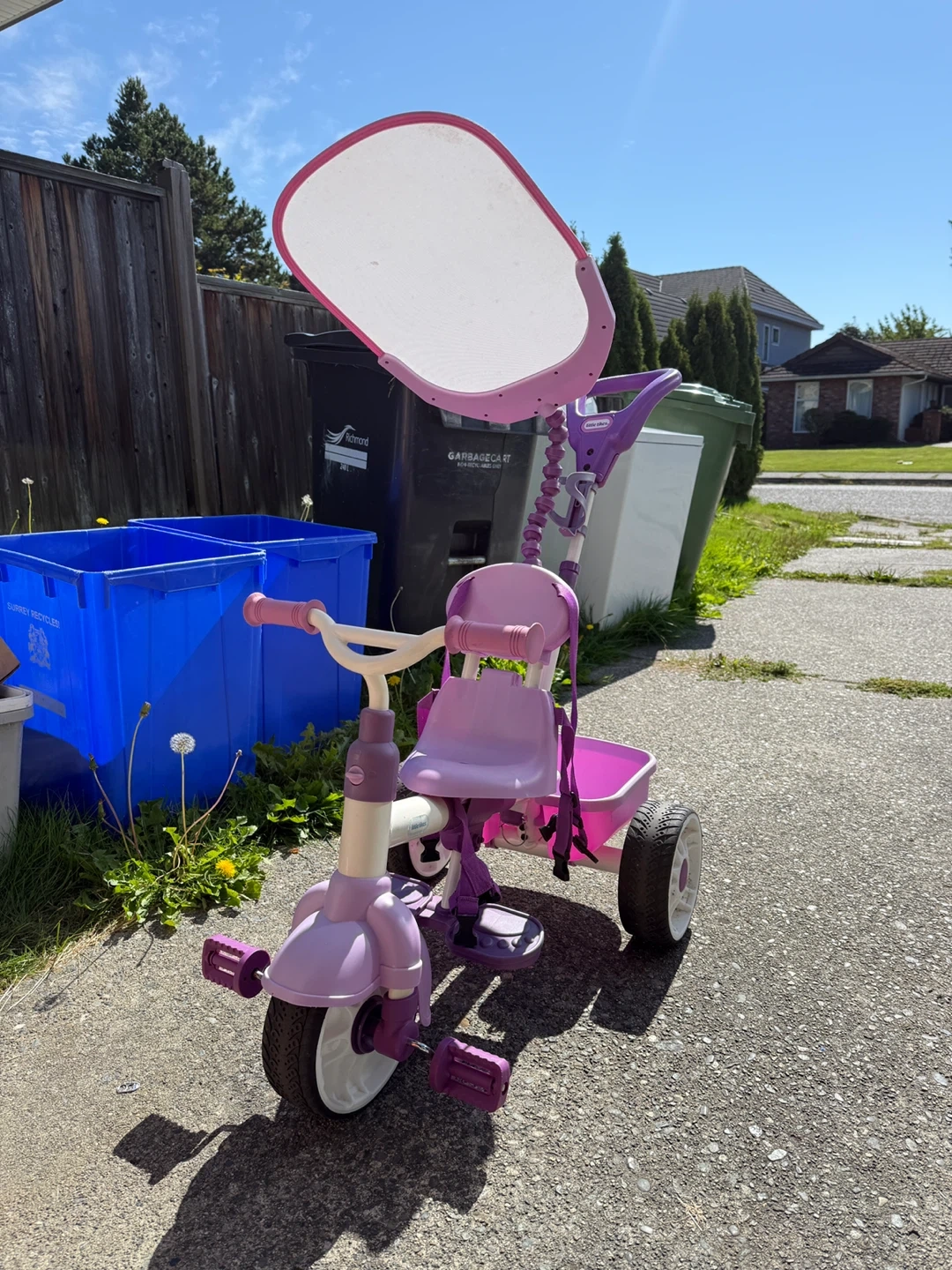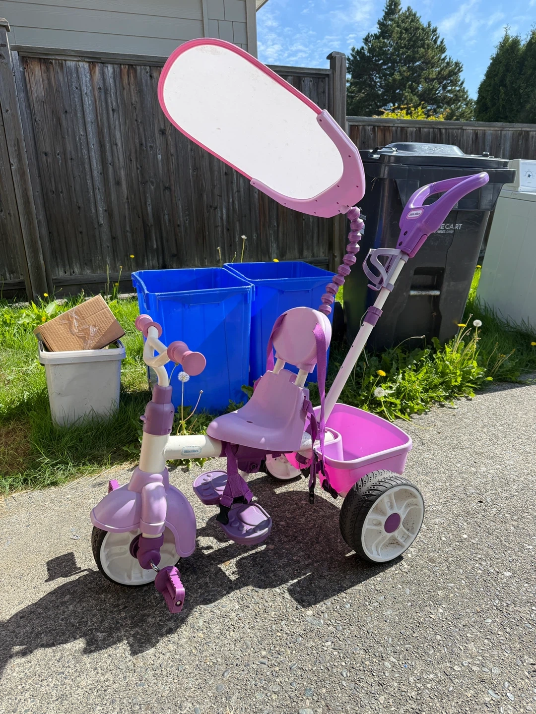 Selling a gently used Little Tikes 4-in-1 Trike in purple and white. It's a great way to get around with your little one! The trike has a parent handle, adjustable seat, and a sunshade to keep your child comfortable. There's also a storage bucket in the back for toys or snacks