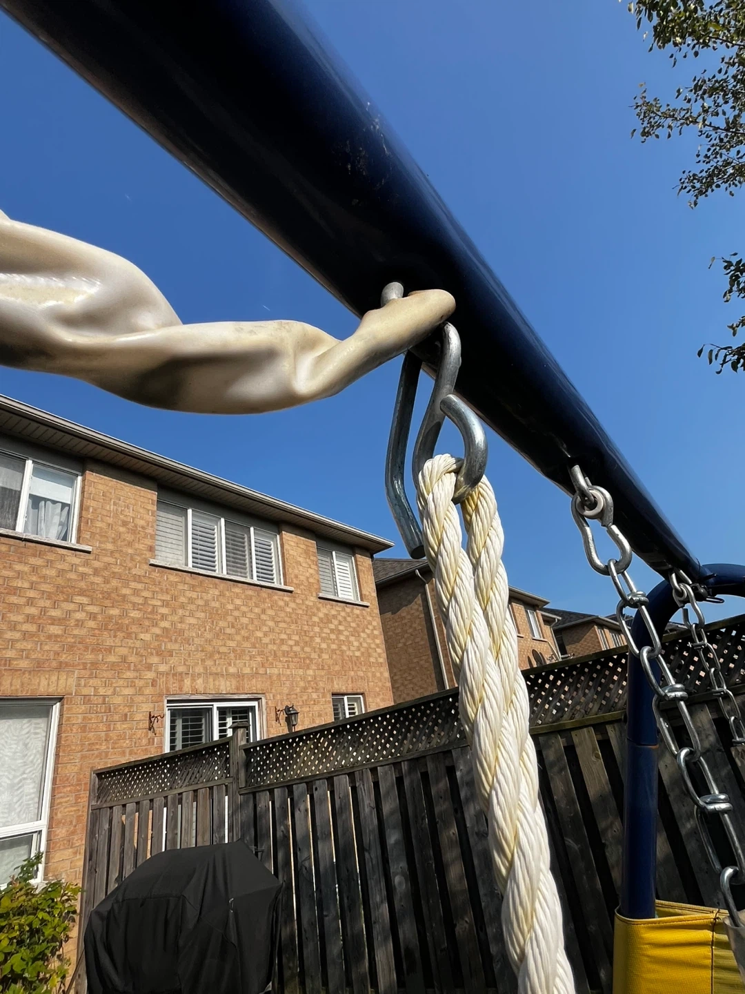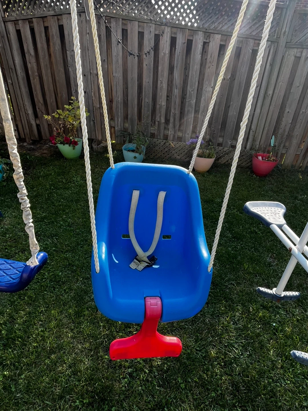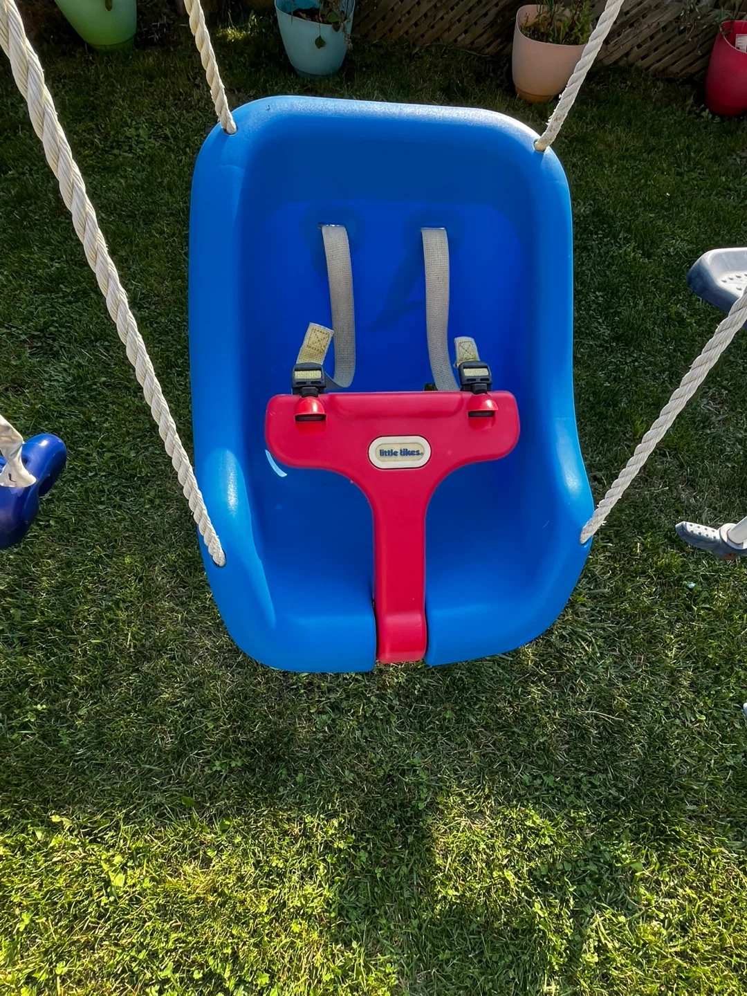 23Here's a gently used Little Tikes toddler swing in blue and red! It's perfect for little ones who are ready to swing. The swing has a safety harness to keep your child secure while they enjoy the ride! Hours of fun outdoors or even indoors if you have the swing frame! So string even a petit grown up can easily fit easily.
