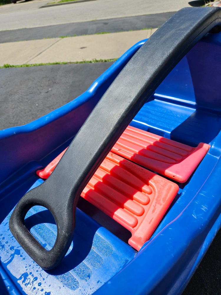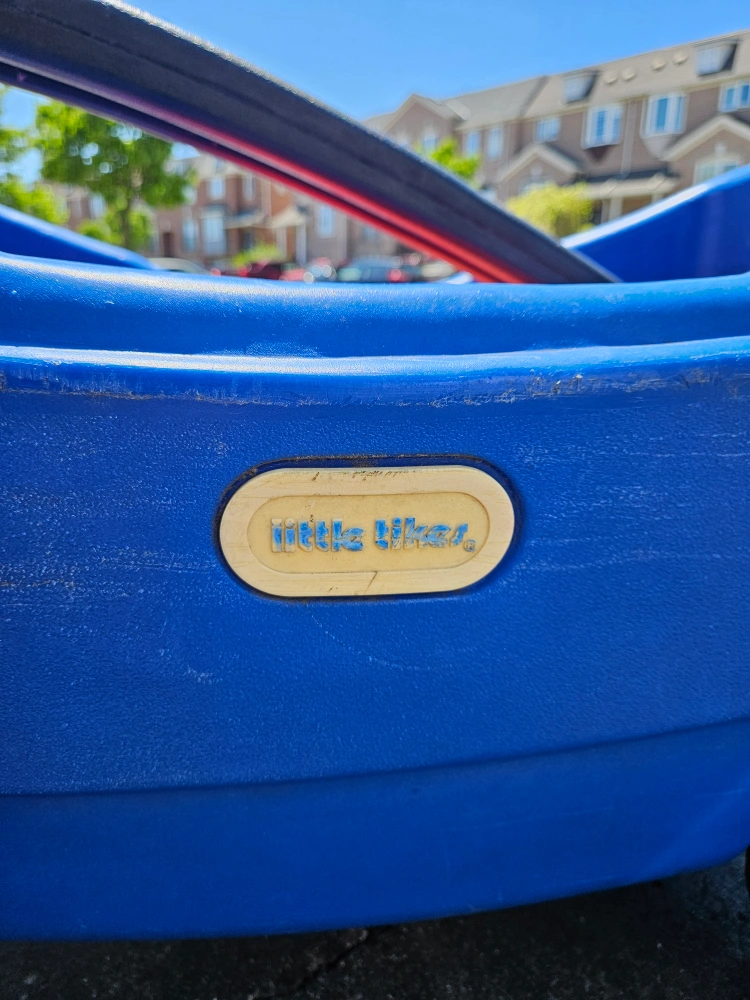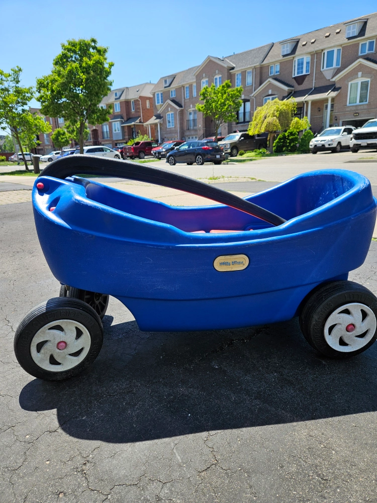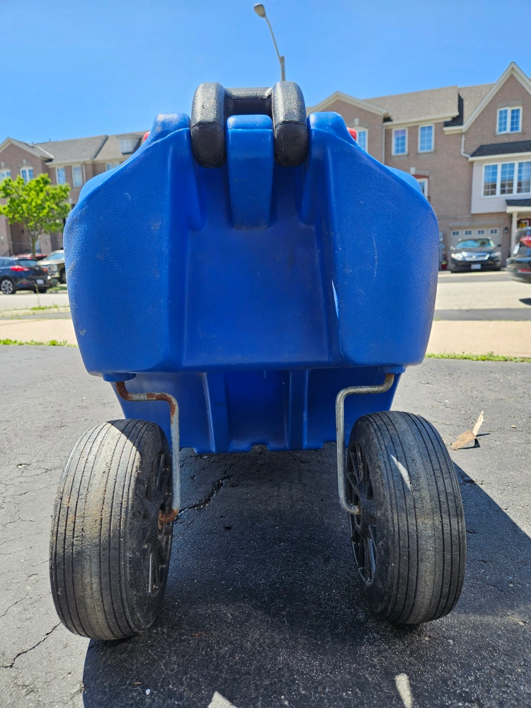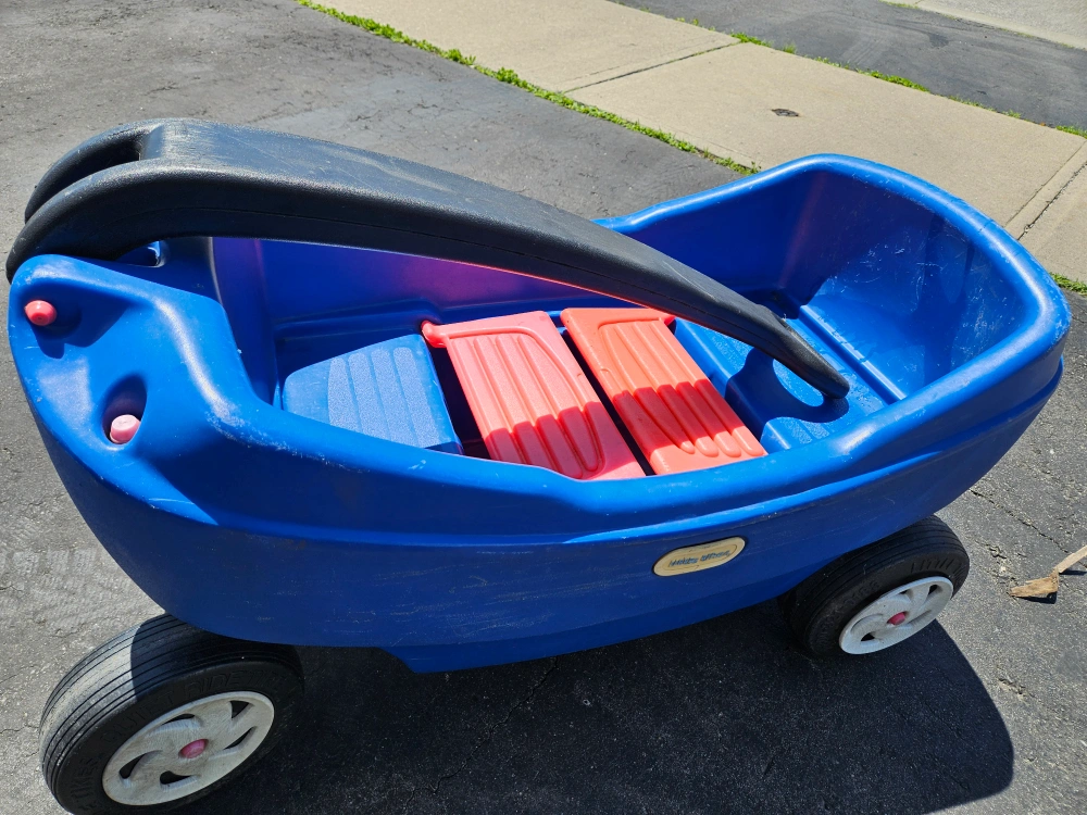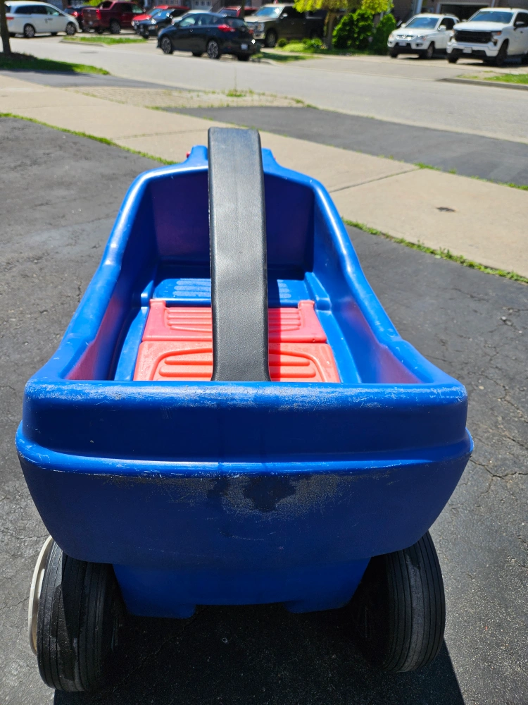 98Blue plastic wagon. Features two red plastic inserts, a black handle, and four wheels. Shows some wear.