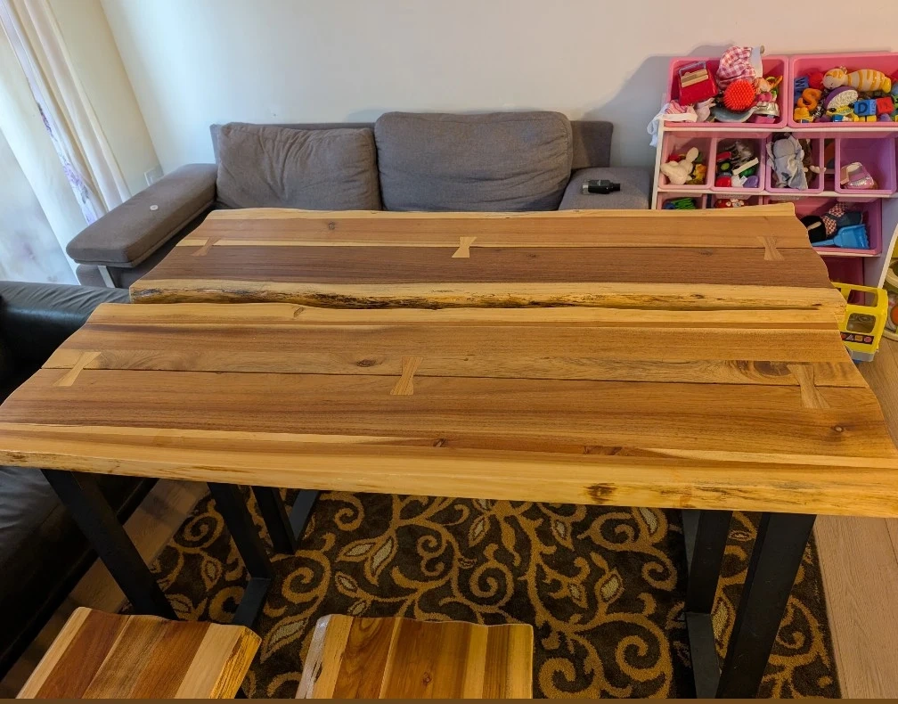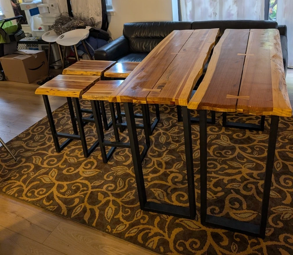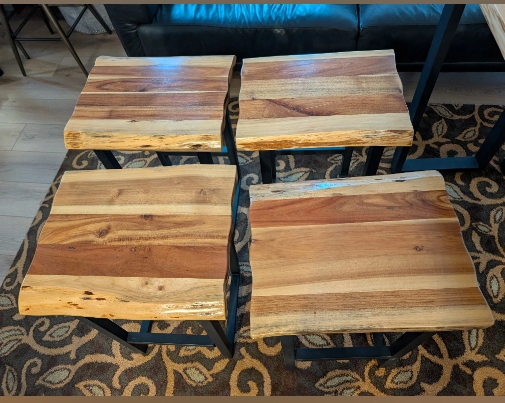 10Beautiful live edge wood table with four matching stools! The table features a unique, natural edge and sturdy black metal legs. It's a great set for a kitchen or dining area, adding a rustic and modern touch to your home.