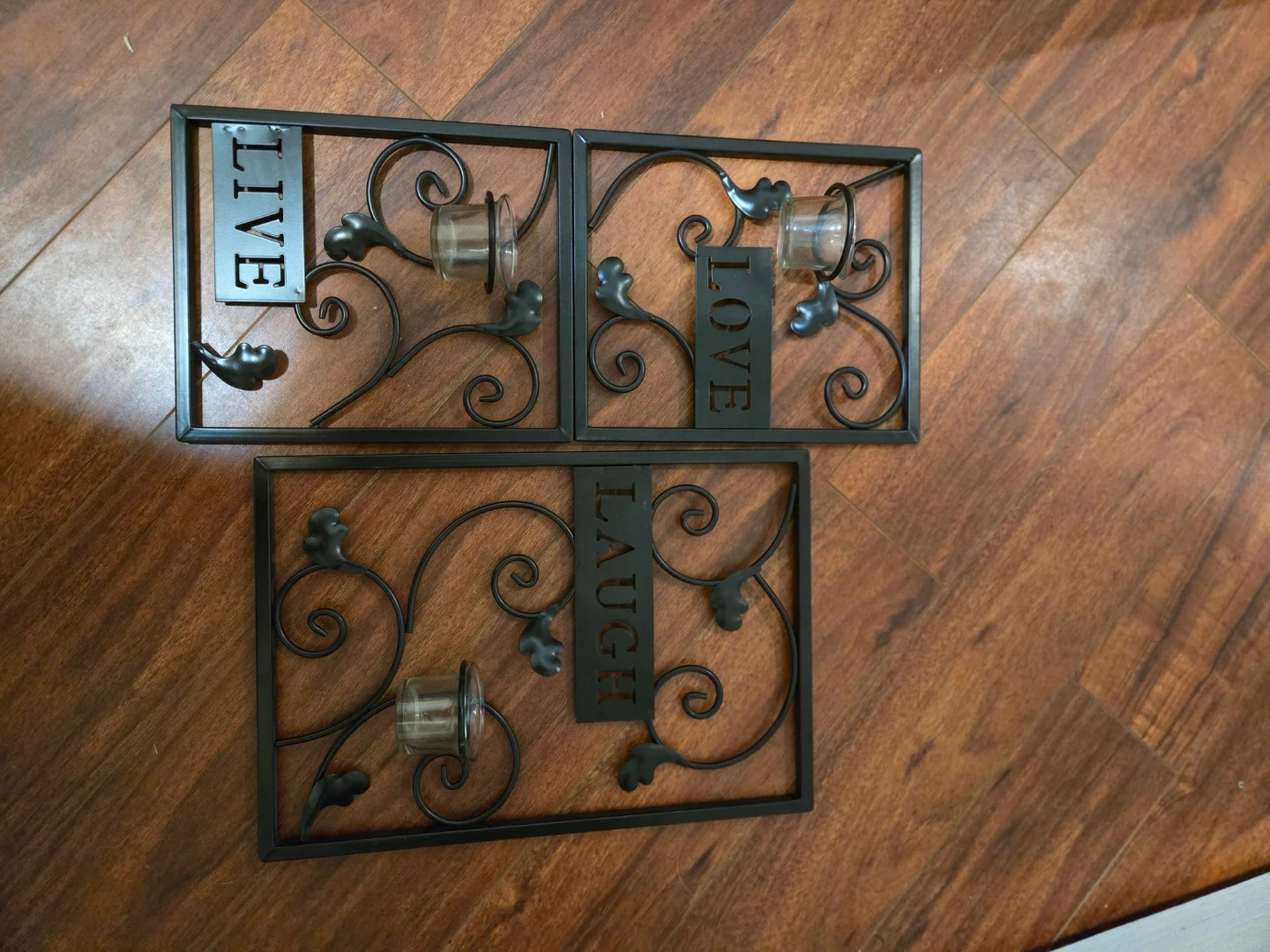 60Set of three metal wall candle holders with the words 'Live', 'Love', and 'Laugh' They are in excellent condition and ready to add a touch of warmth to your home