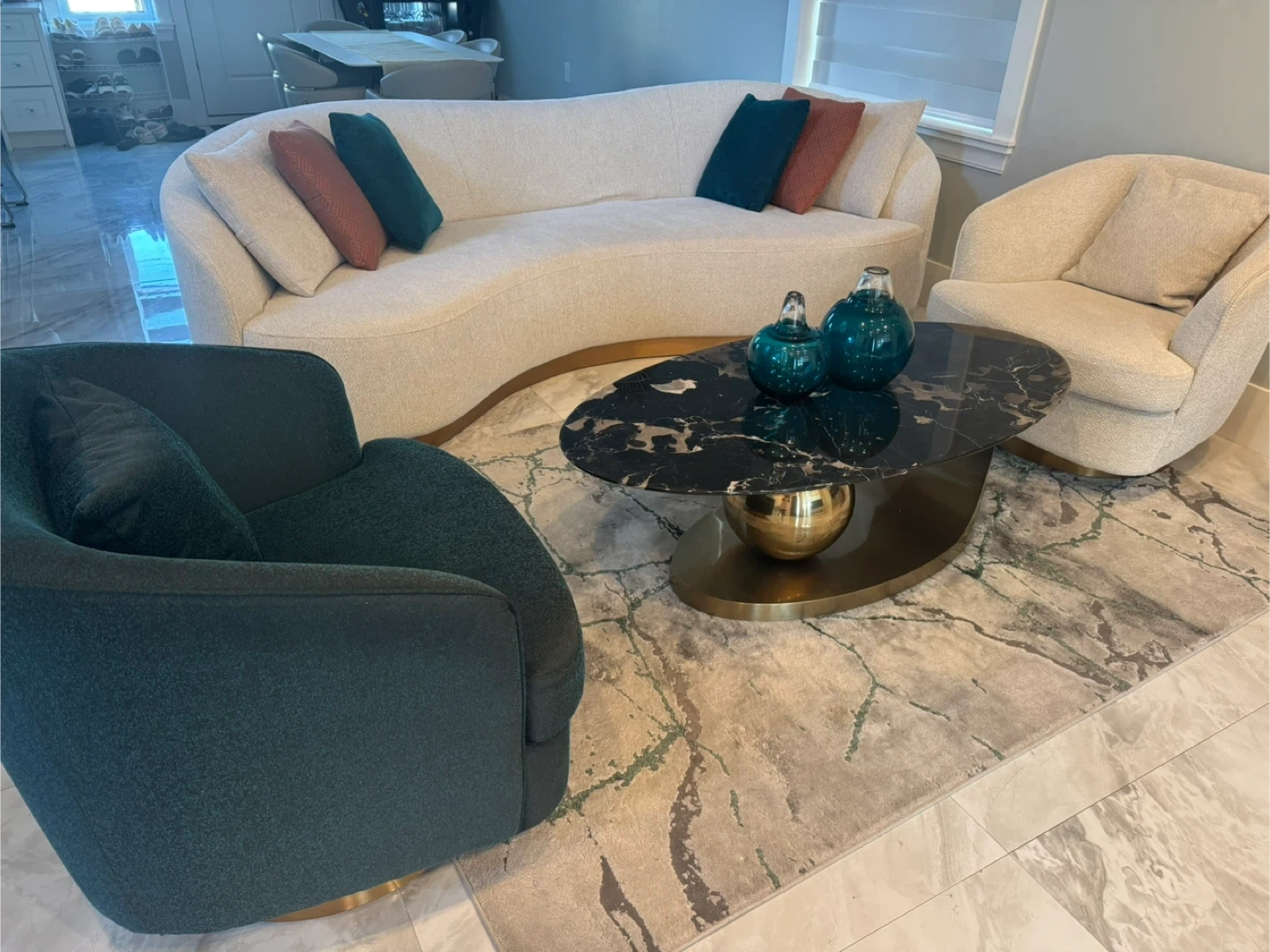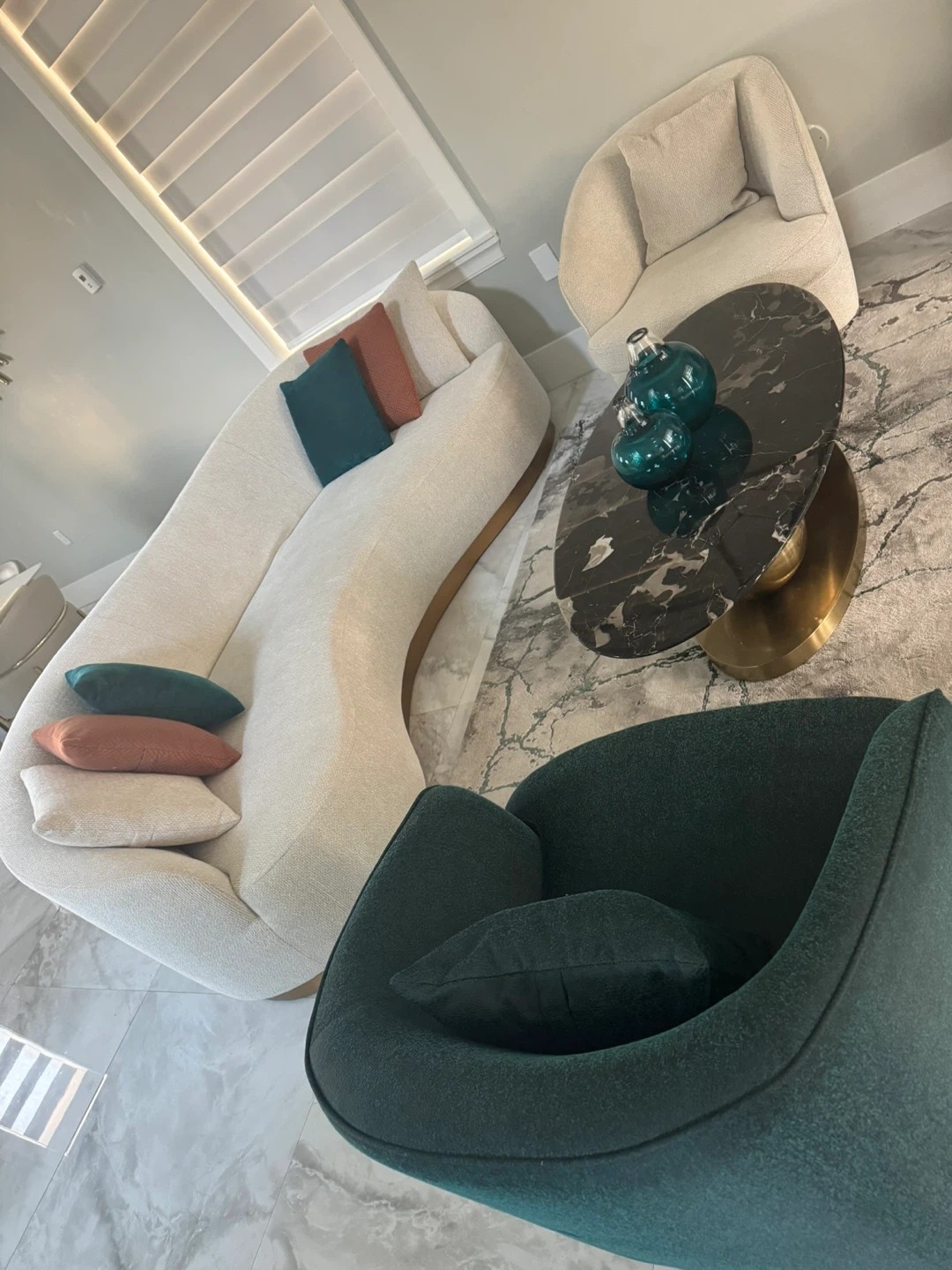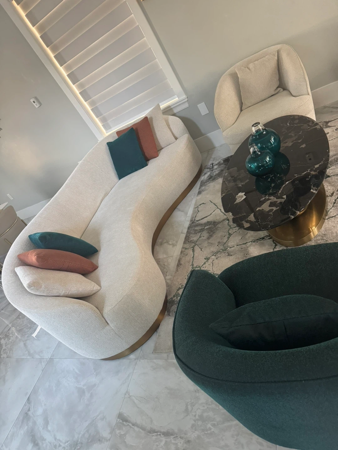 Selling a living room furniture set consisting of a sofa, two chairs, and a coffee table. The sofa is a unique, curved design in a light cream colour. One chair is a matching cream colour, while the other is a deep green. The coffee table has a black marble top and a gold base. Perfect to give your living space a modern and stylish look! They can be sold separately