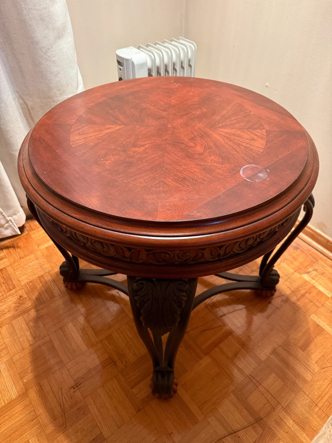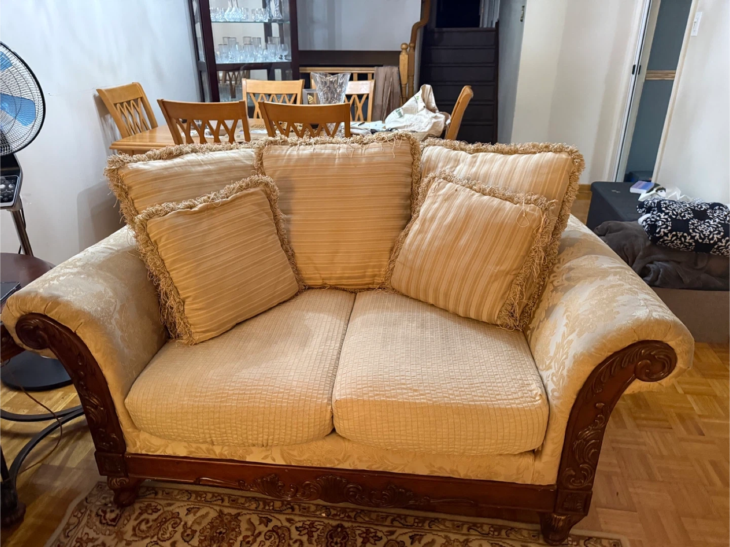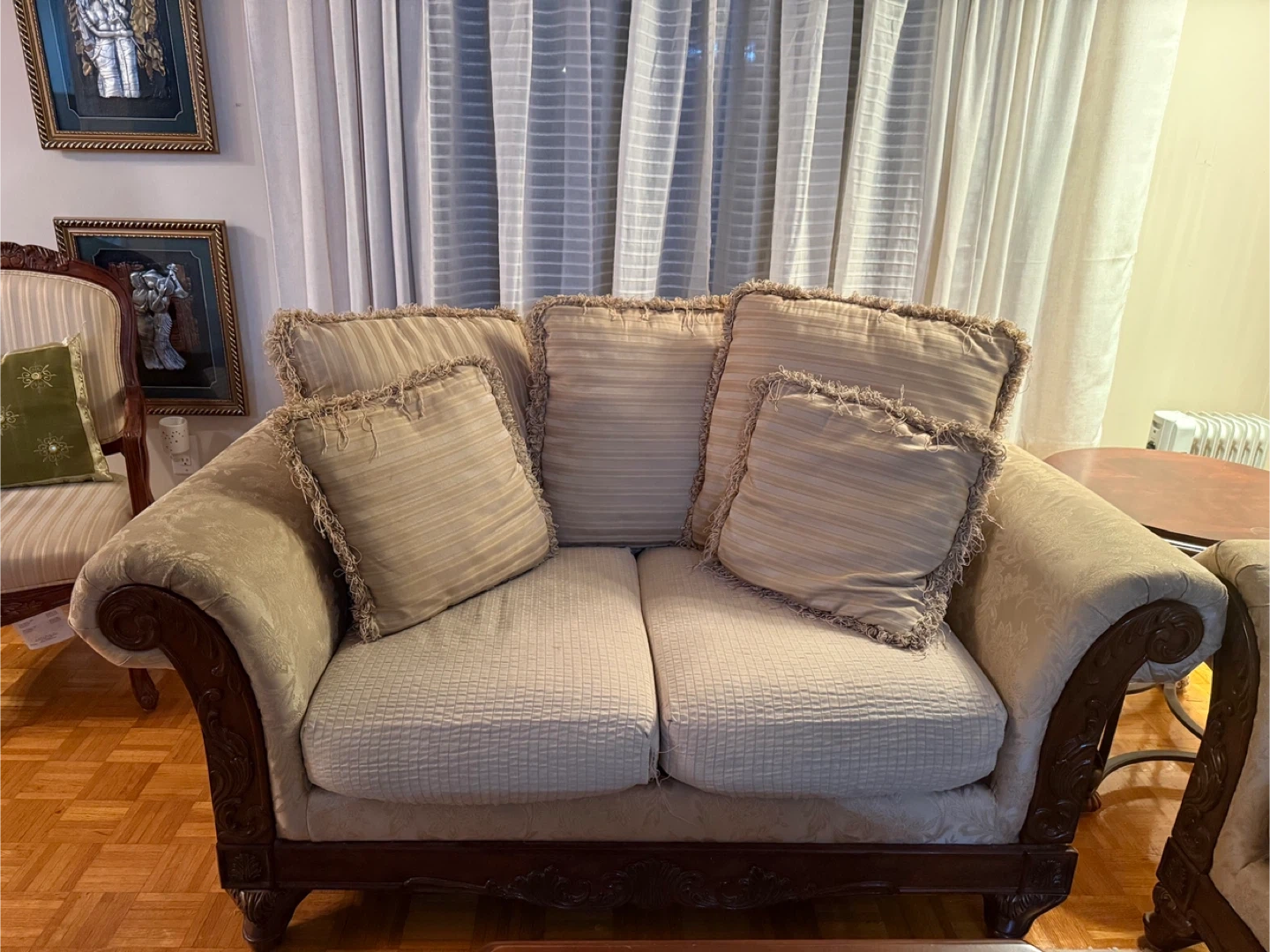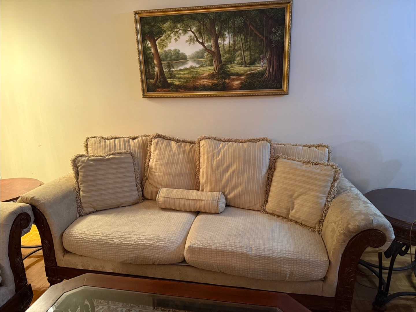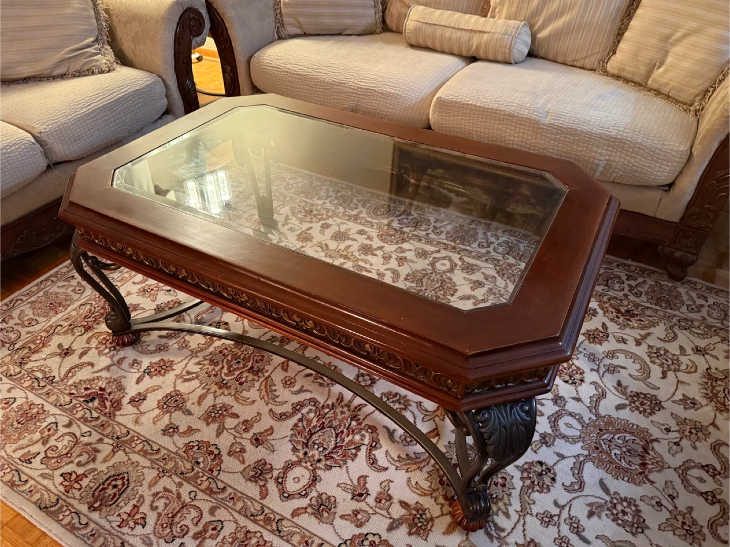 10Selling a complete living room set including sofas and a coffee table. The set features a classic design with comfortable cushions and a decorative wooden frame. The coffee table has a glass top and ornate legs. Perfect for furnishing your living space!