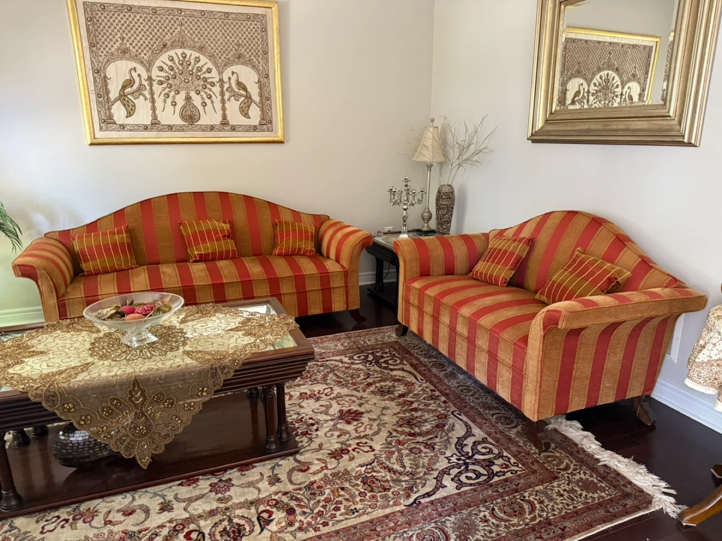 10A lovely striped sofa , love seat and armchair set, perfect for adding a touch of warmth to your living room. The set includes a sofa , love seat and an armchair, all in good condition. The cushions are included!