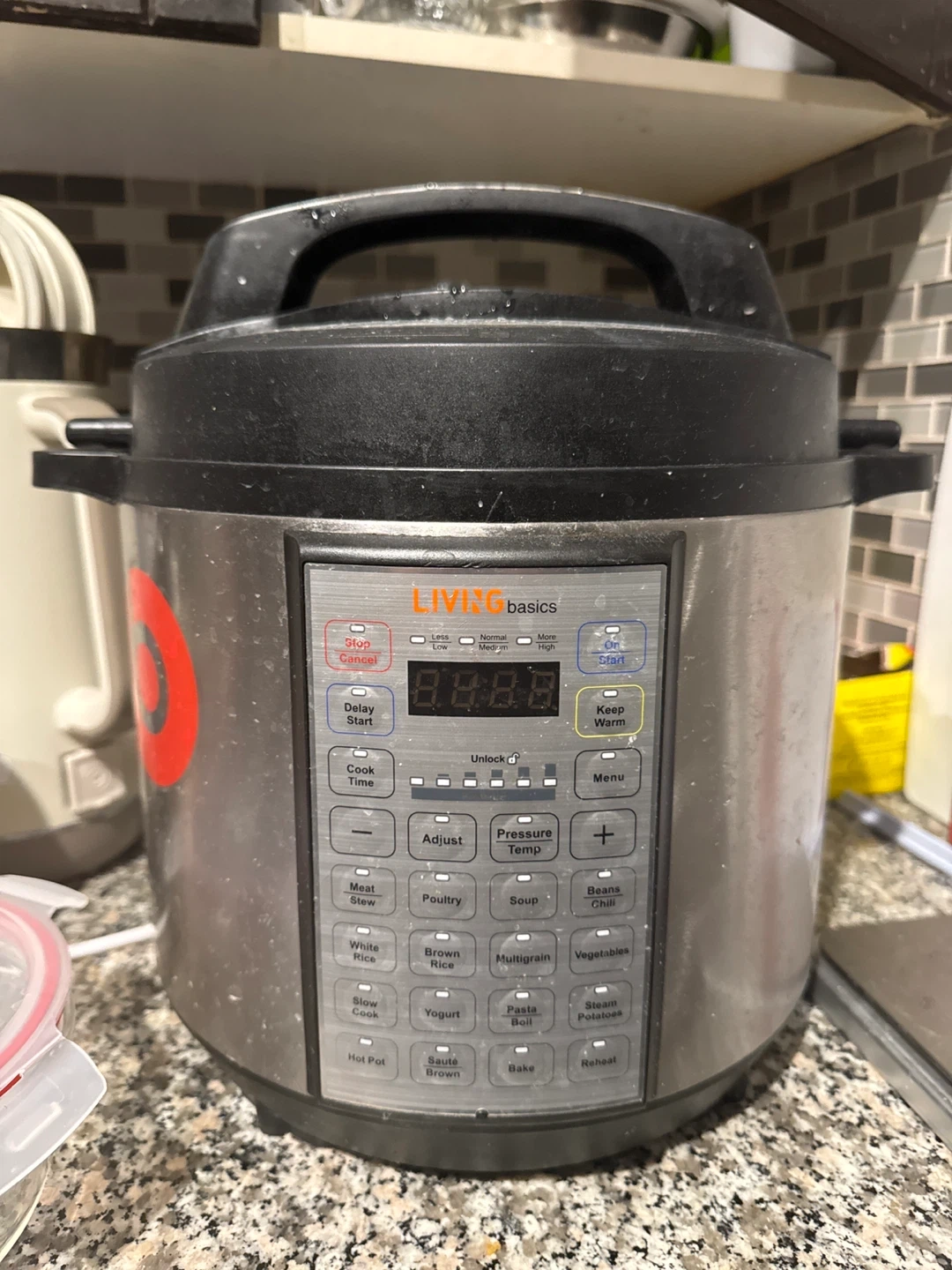 10Selling a LIVINGbasics electric pressure cooker. It has settings for meat stew, poultry, soup, beans/chili, white rice, brown rice, multigrain, vegetables, slow cook, yogurt, pasta, steam/potatoes, hot pot, saute/brown, bake, and reheat