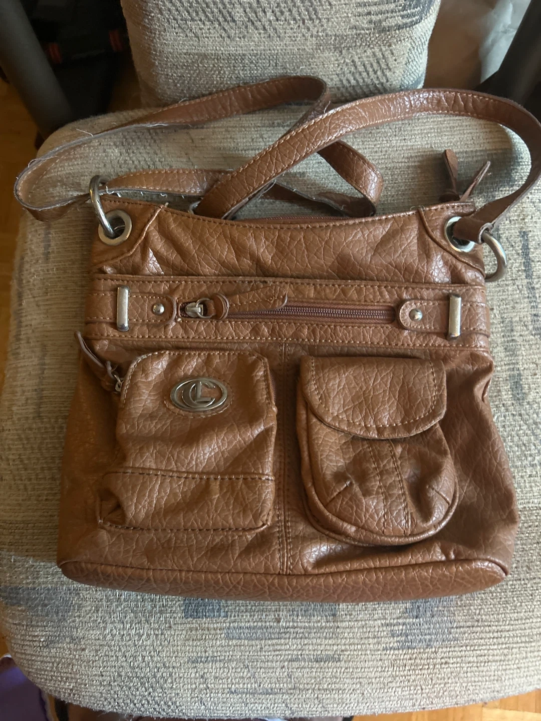 60Here's a Liz Claiborne shoulder bag in a lovely brown colour! It has a few pockets on the front and a zipper closure. It's in good condition and ready for a new home