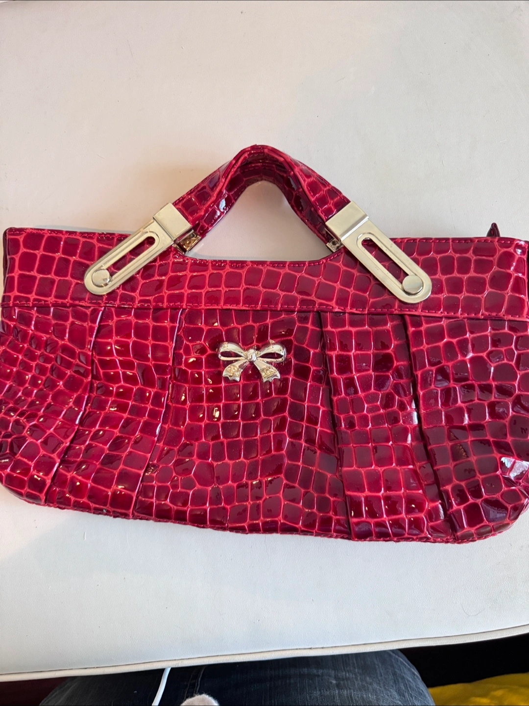 A Lacquer leather handbag in a beautiful burgundy colour! It features a croc-embossed pattern and a cute bow detail. Perfect for adding a touch of elegance to any outfit