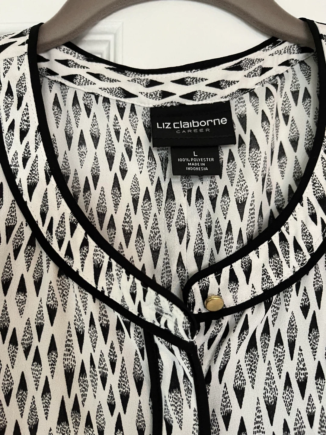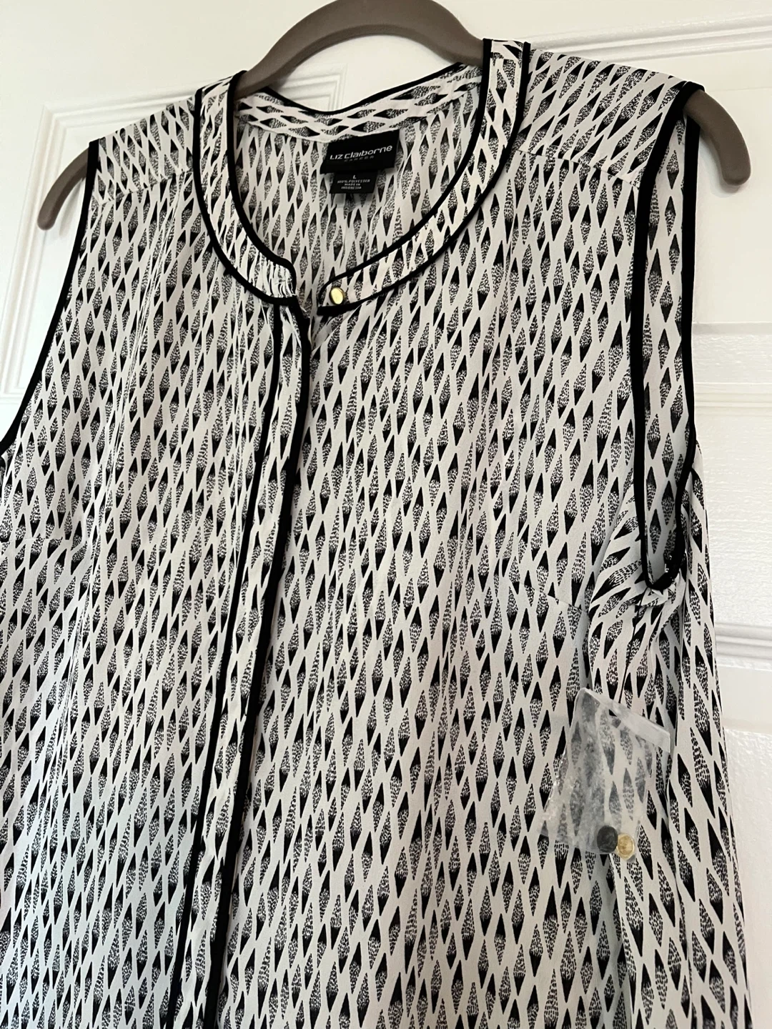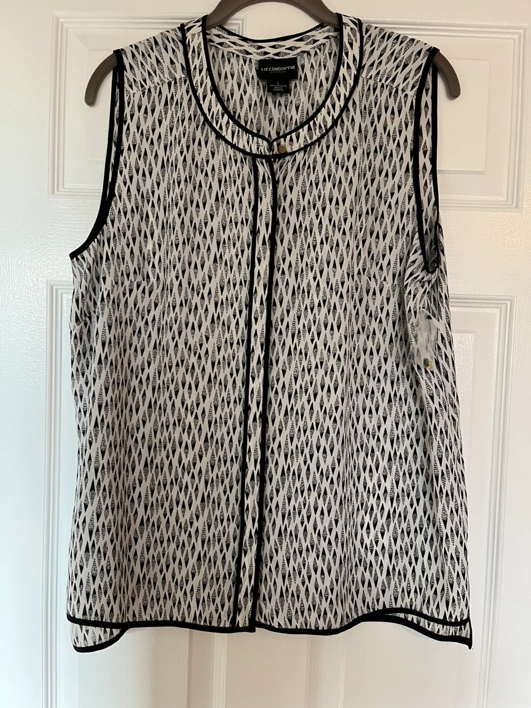 956Liz Claiborne Career top in size L. It's a sleeveless top with a black and white pattern and black trim. Made of 100% polyester, it's lightweight and easy to wear!