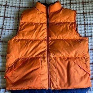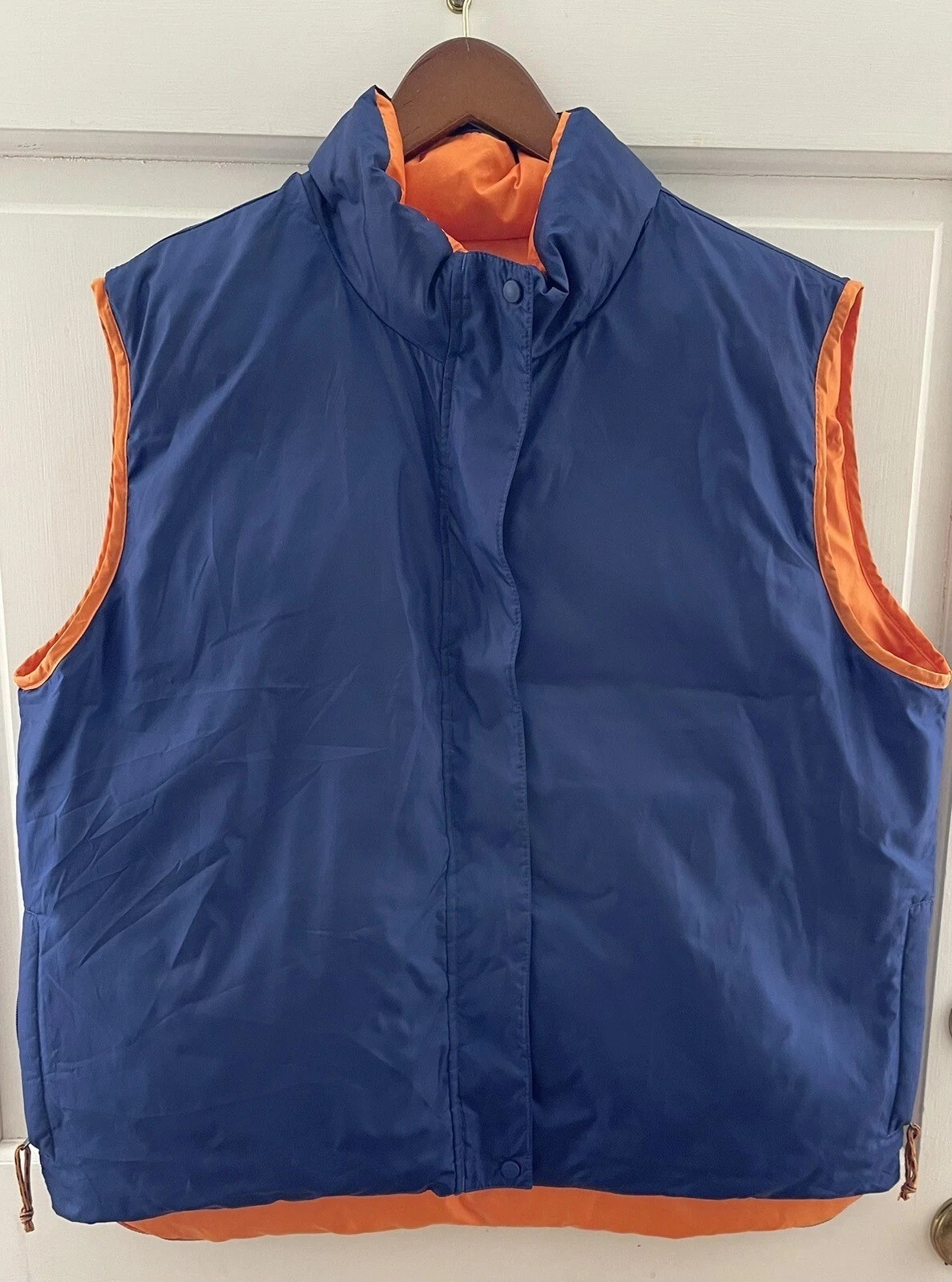 Cozy reversible puffer vest in blue and orange! Perfect for layering during those chilly Canadian days. It's in great condition and ready for a new home