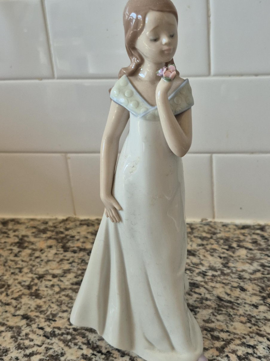 A lovely Lladro figurine depicting a girl holding a flower. It would make a beautiful addition to any collection or a sweet decorative piece for your home