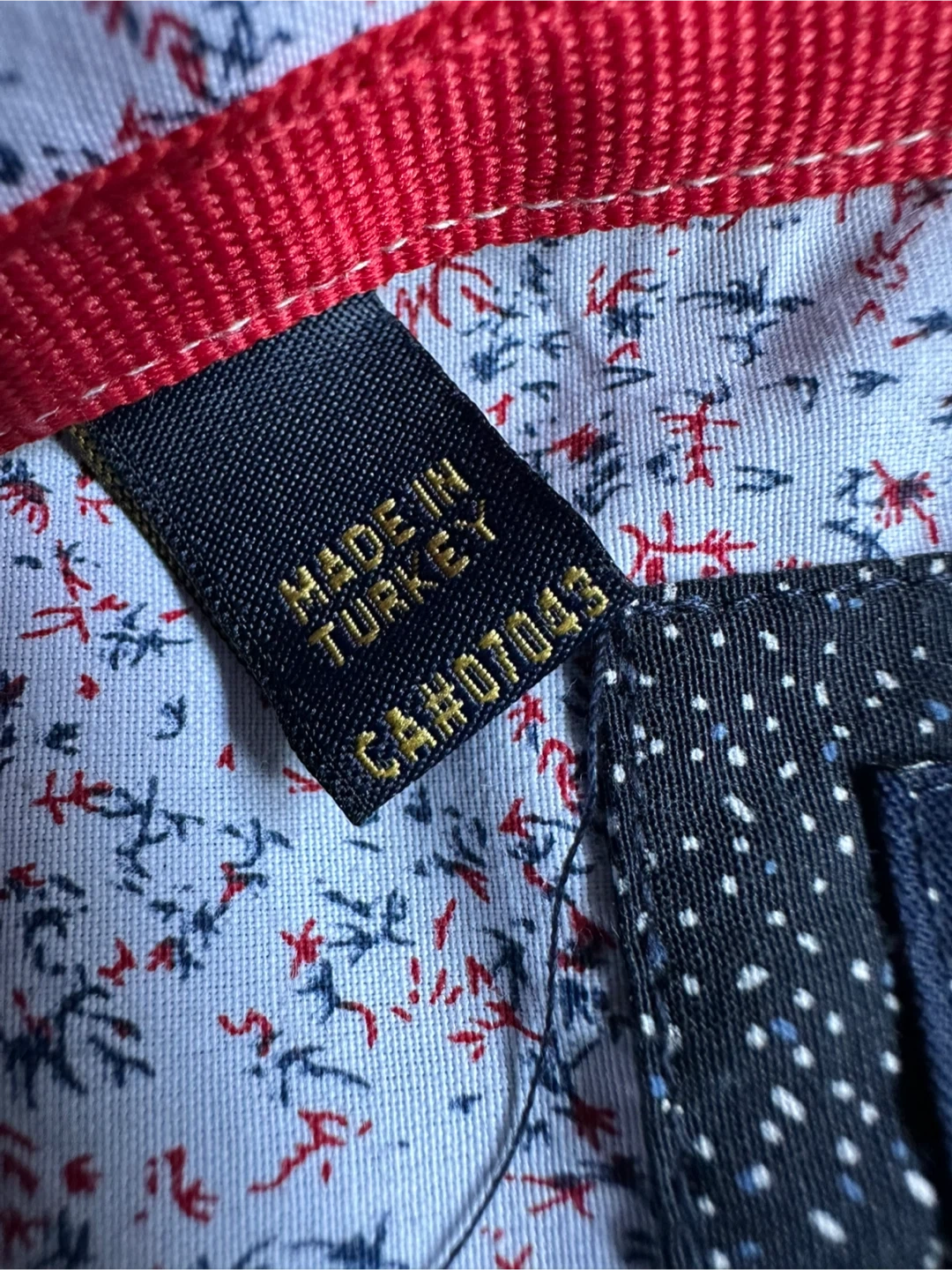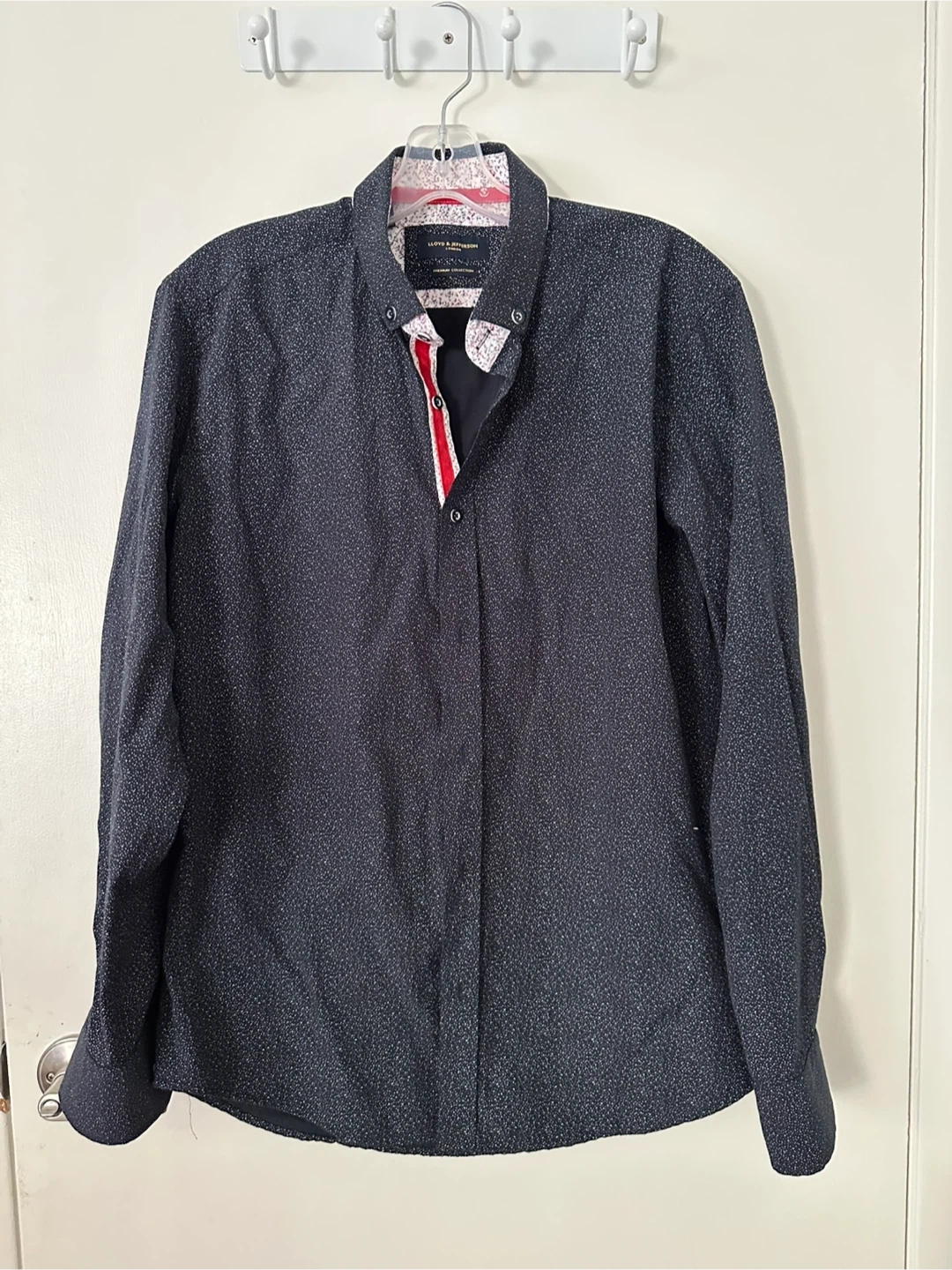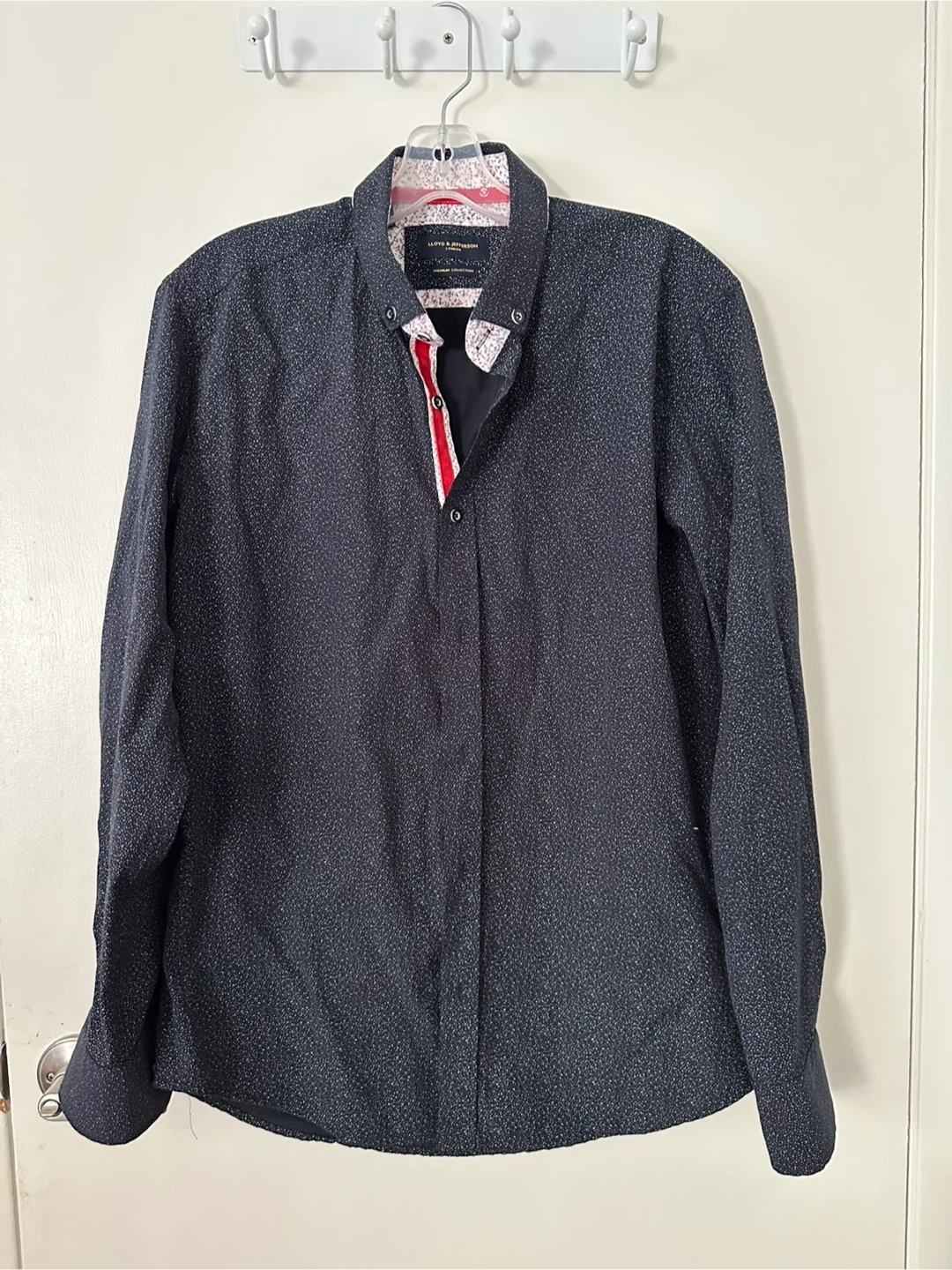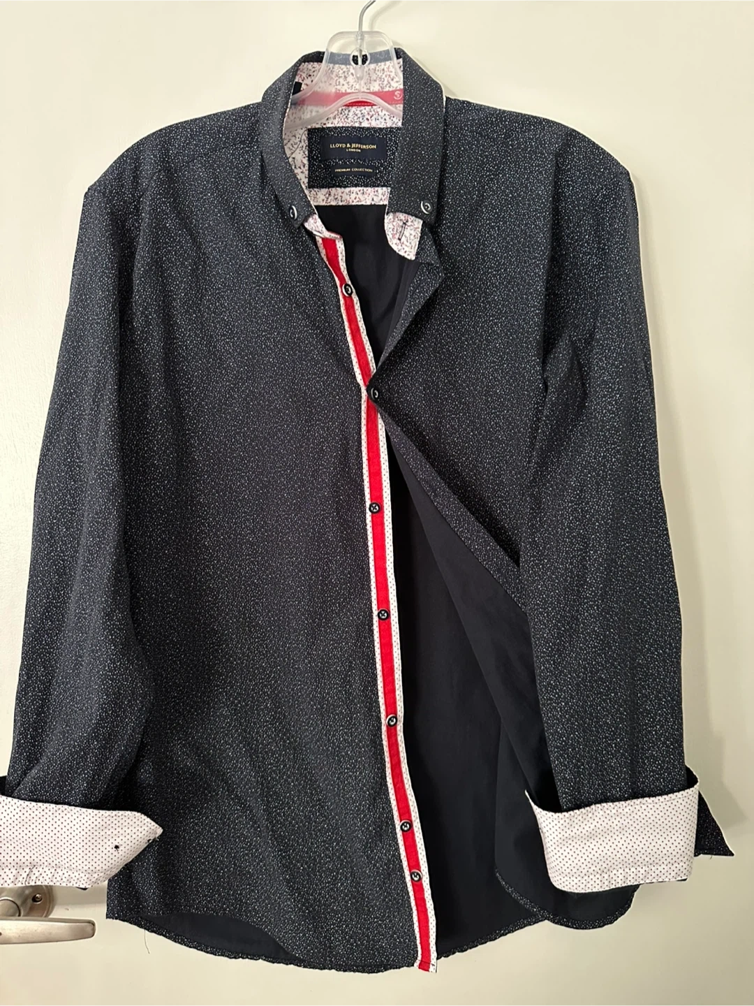 Lloyd & Jefferson London Premium Collection shirt for sale! The shirt is a blend of 50% cotton and 50% polyester. It has a unique design with a red stripe detail. Perfect for any occasion .
