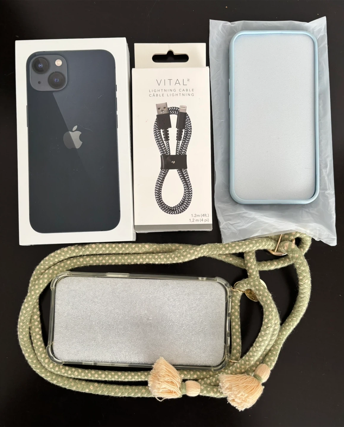 1000+iPhone 13 Midnight with 128GB of storage in excellent condition with a battery health of 98%. Comes with the original box and charging cable. Also included extra Vital cable and pair of new phone cases. Looks completely new - screen protector and case were used from first minute, working perfectly. Reason of selling upgrade to new model.