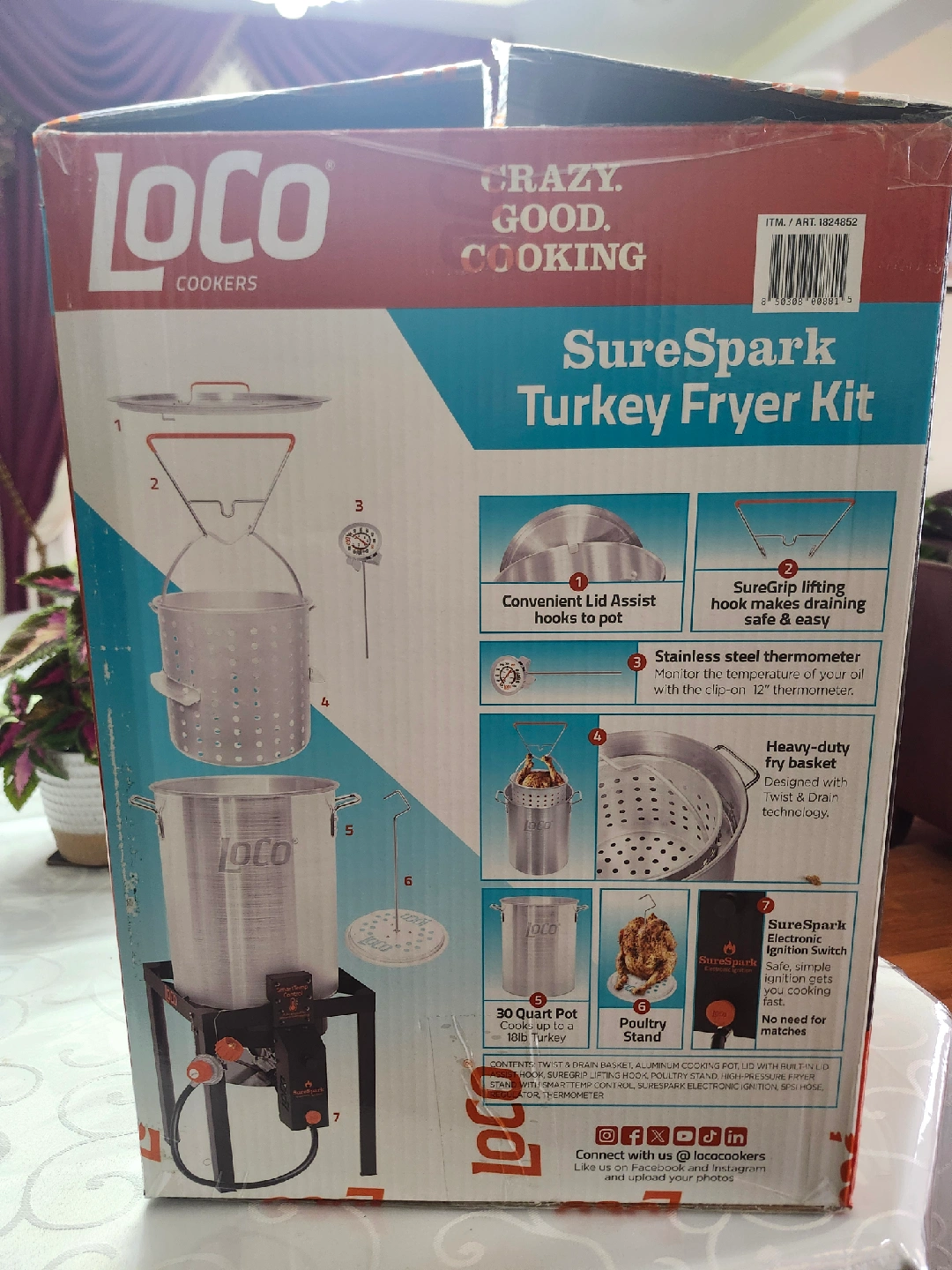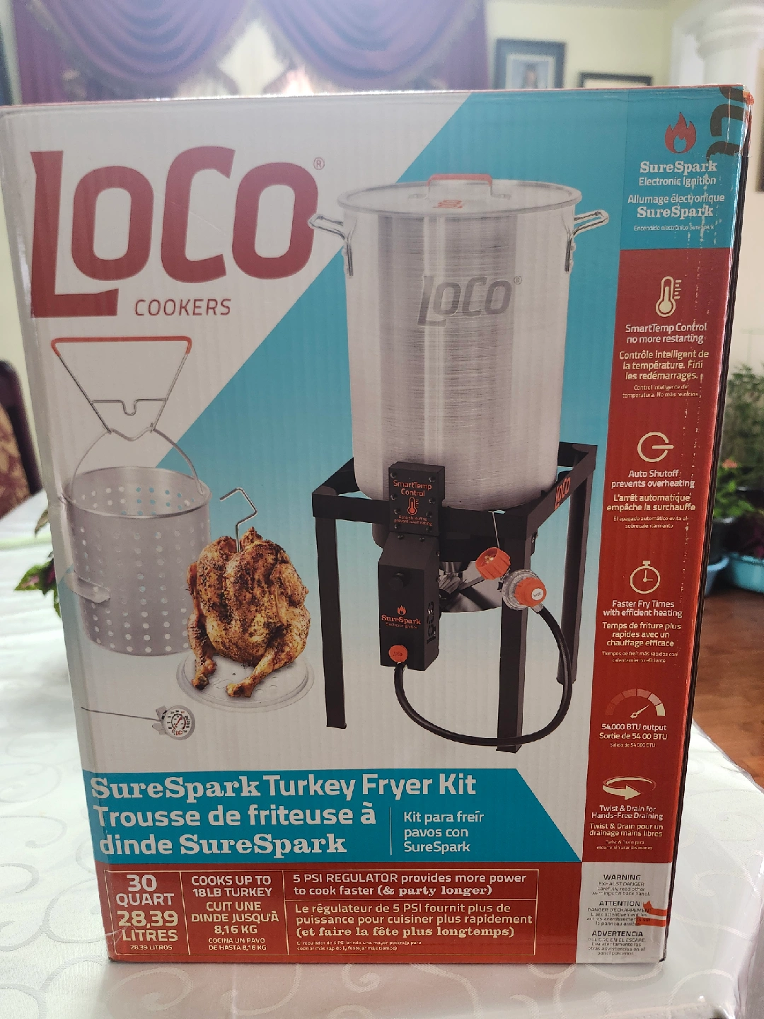 10Get ready for some delicious turkey with this Loco Cookers SureSpark Turkey Fryer Kit! It's designed to cook up to 18 lbs of turkey in a 30-quart pot. The kit includes a 5 PSI regulator for more power to cook faster. The SureSpark electronic ignition switch makes cooking safe and easy, with no need for matches. It also features a stainless steel thermometer to monitor the temperature of your oil.