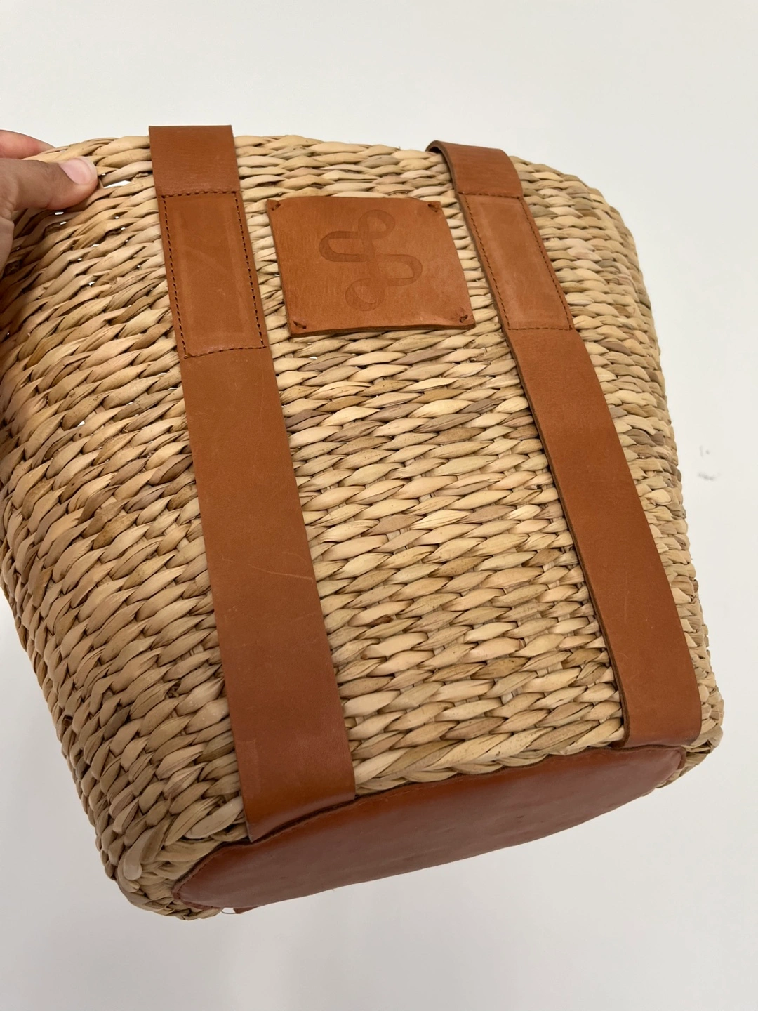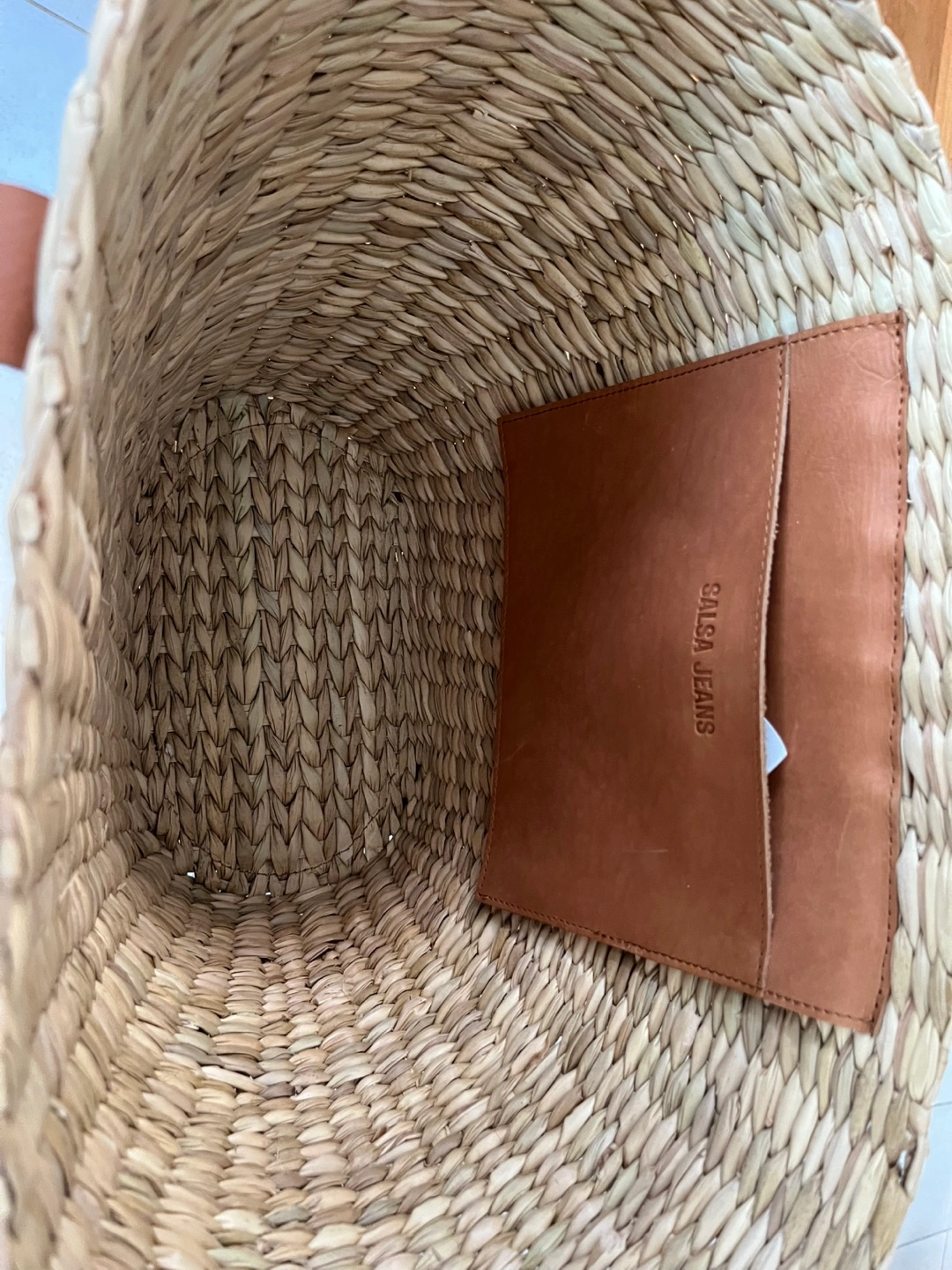 Selling a straw tote bag. It features brown leather straps and a logo on the front. The tag shows it was originally $110.00. Tags still on, it’s brand new, never used. Made in Portugal.