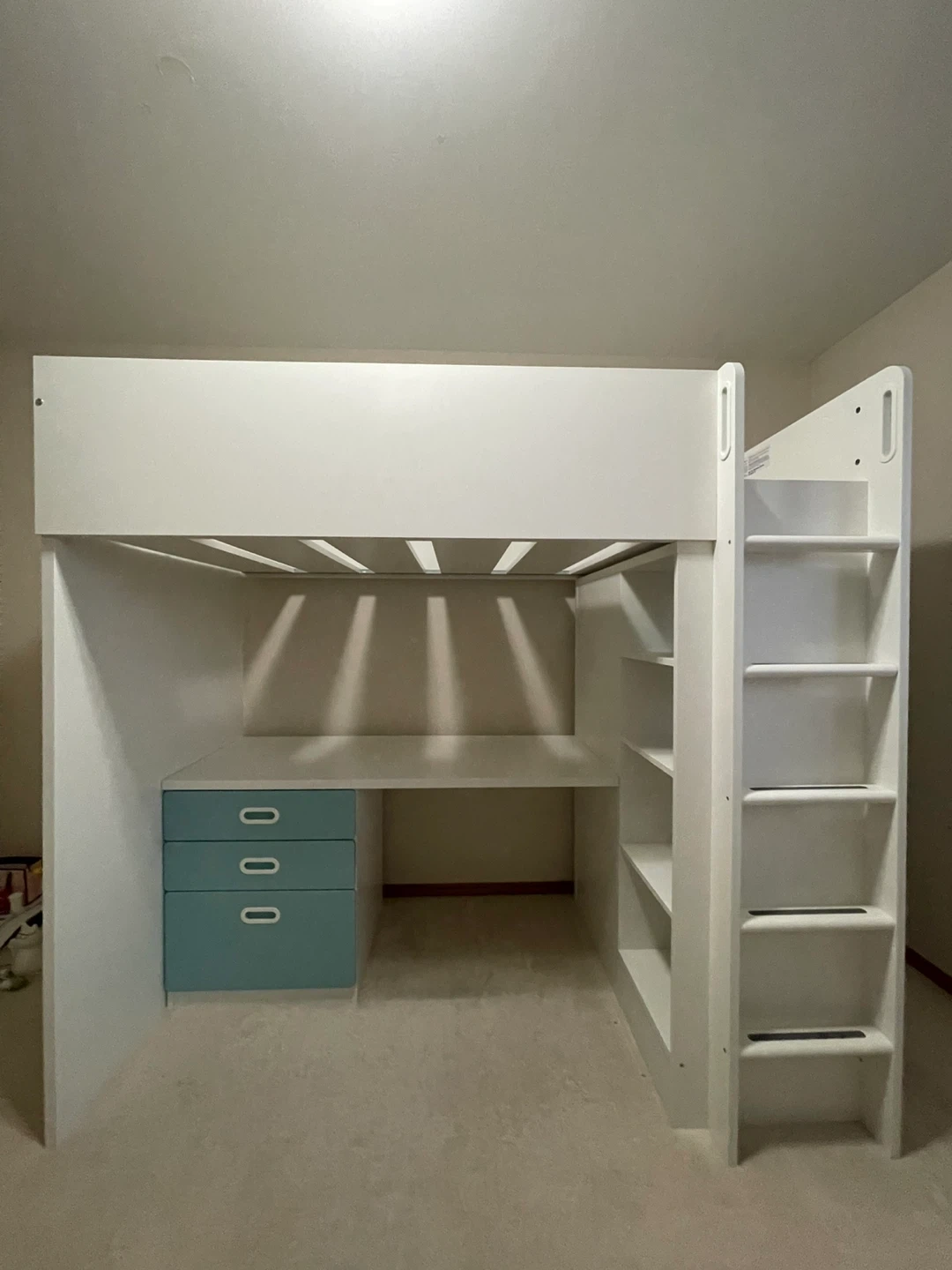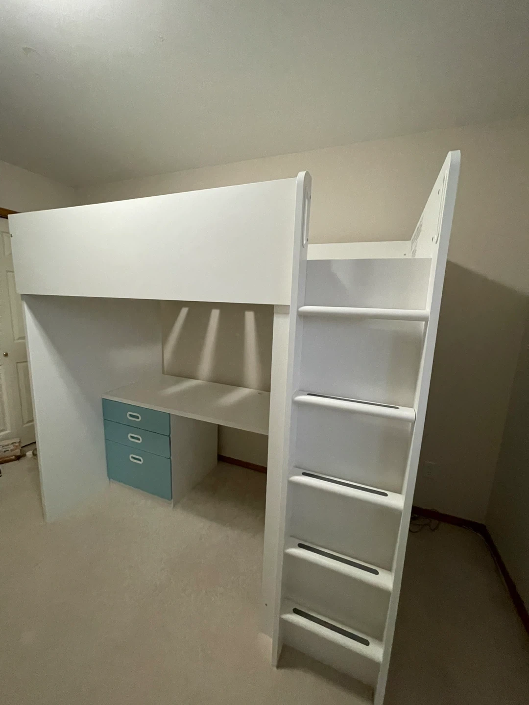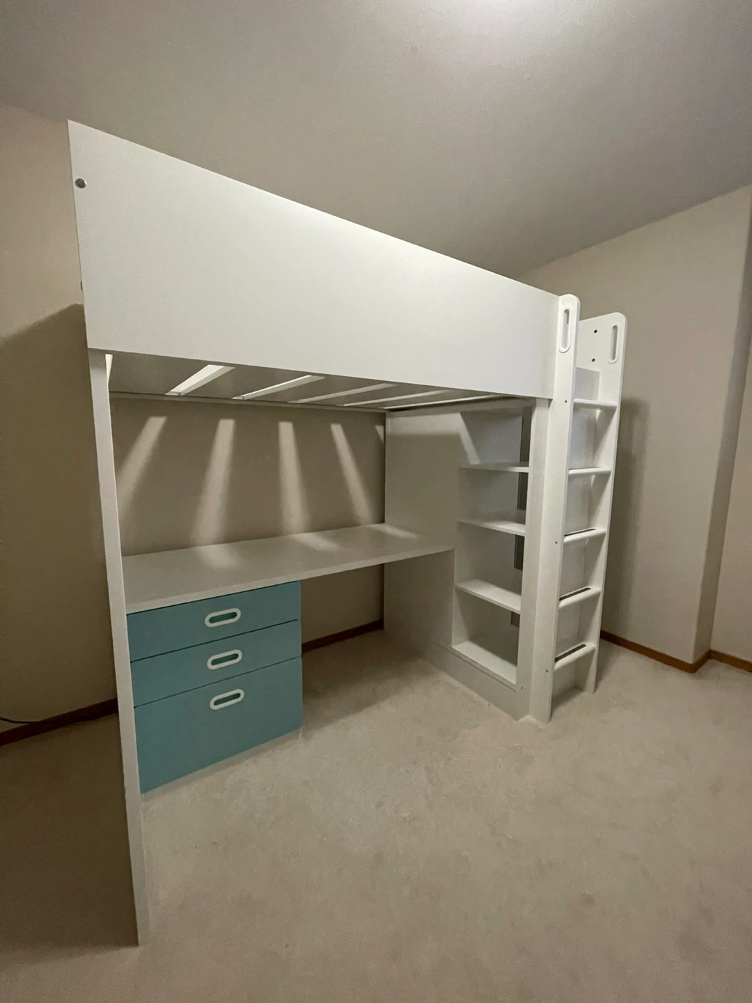 20Selling a loft bed with a built-in desk and storage! It features a clean white frame with cute blue drawers. Perfect for maximizing space in a smaller room or creating a fun study area for kids. It's in great condition and ready for a new home! Twin size mattress fits