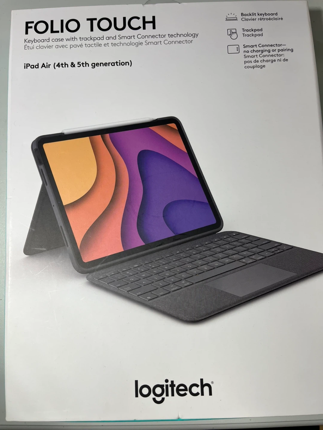 10Selling a Logitech Folio Touch keyboard case for iPad Air (4th & 5th generation). It's a keyboard case with trackpad and Smart Connector technology. Includes a backlight keyboard and trackpad. The box is included as well!