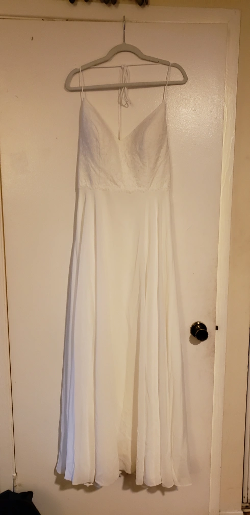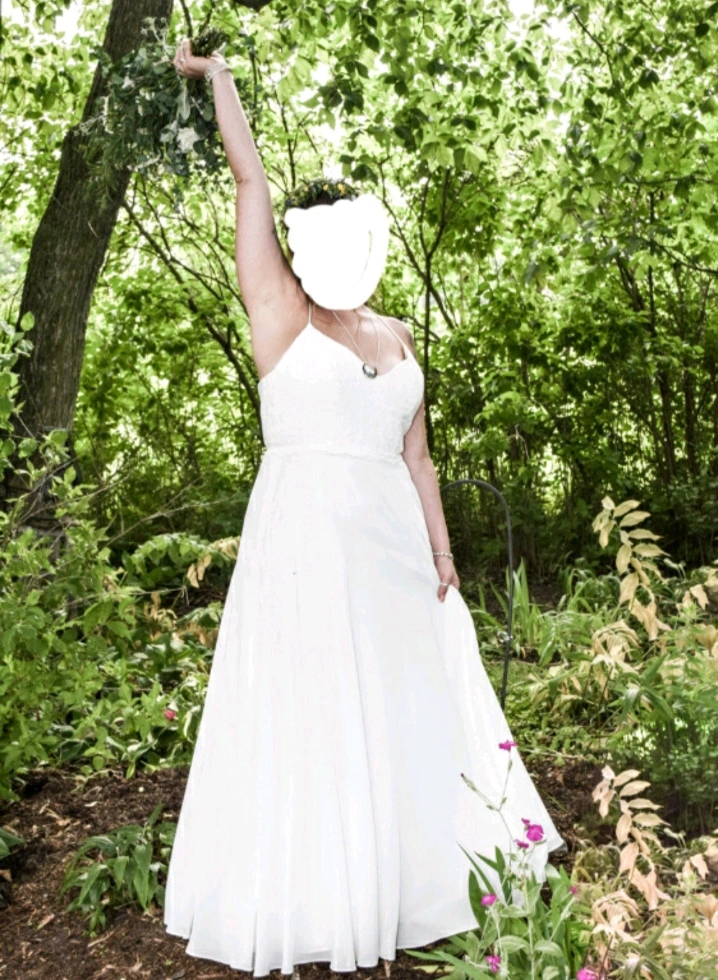 Selling a beautiful Éloise Marie Couture wedding dress. It's an ivory colour and size 12. The bodice is lace, and the skirt and liner are ivory. It's in great condition and ready for its next special day! I wore this in the middle of the July's dead heat, it was nice and cool! Paid $1000 asking $500 Worn once and has been freshly dry cleaned!