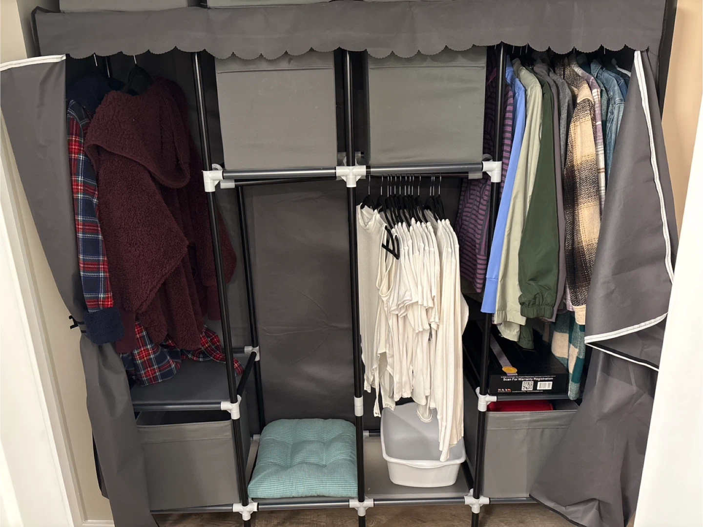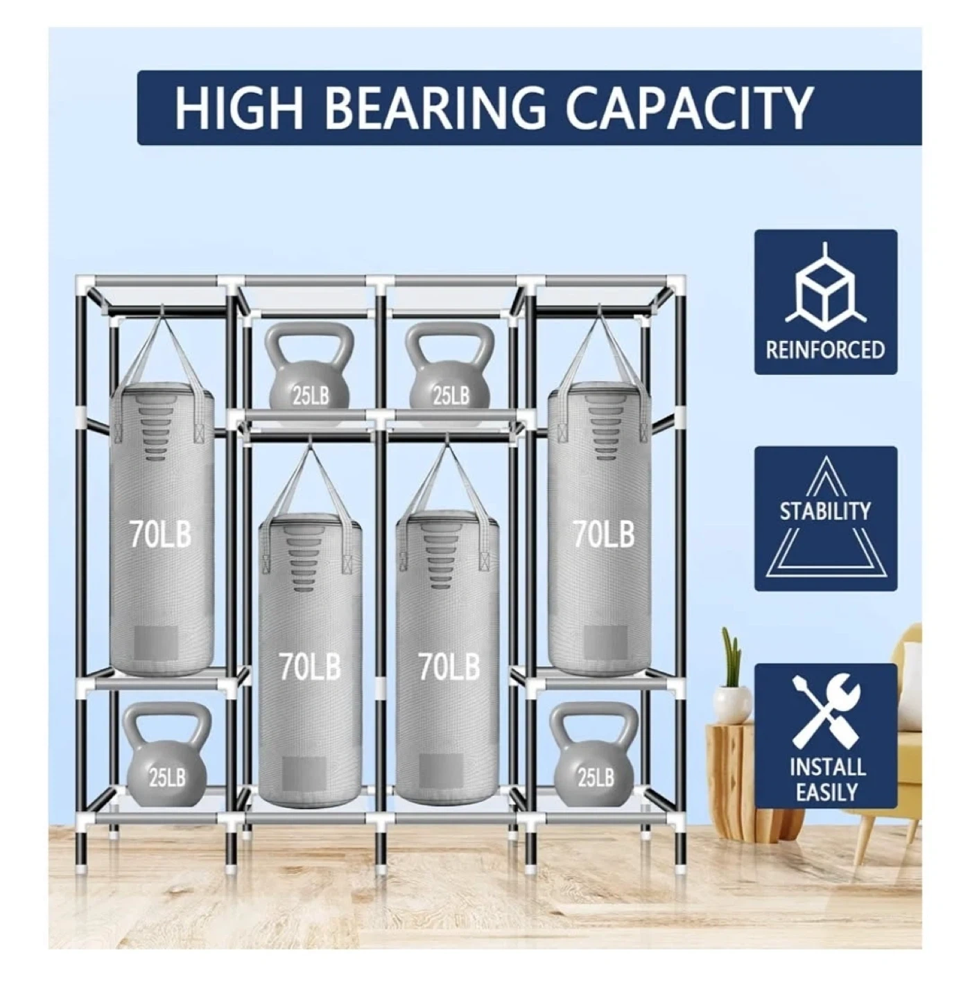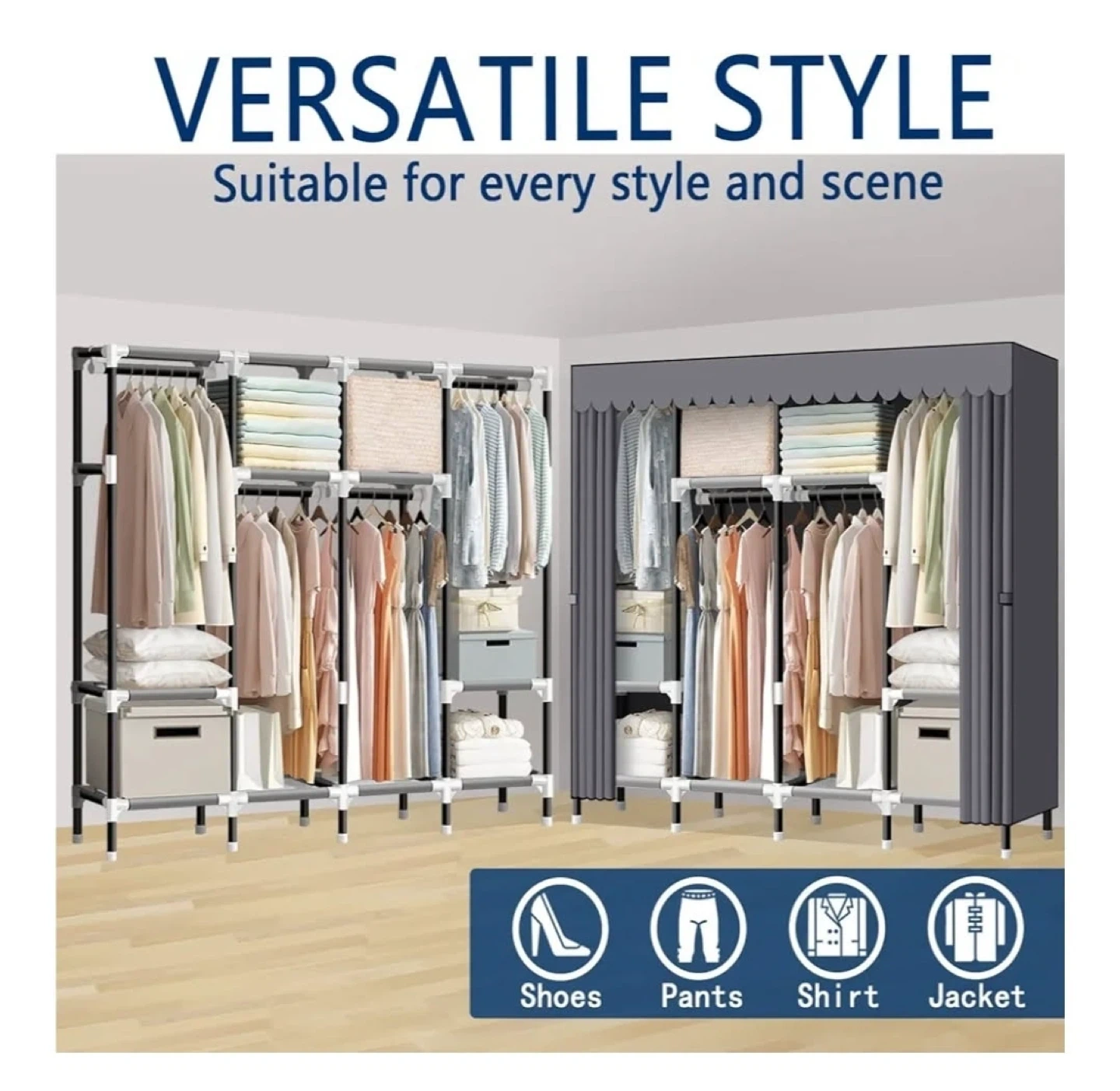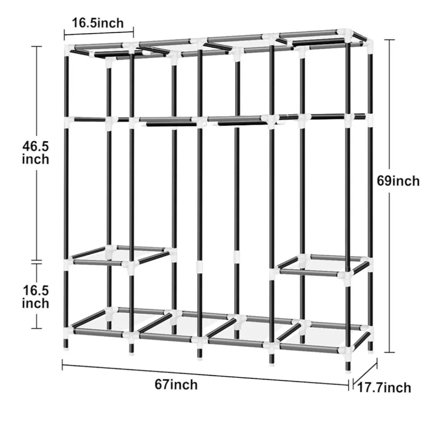 This LOKEME portable closet wardrobe is perfect for extra storage! It features 4 hanging rods and is made with a sturdy 25mm steel tube frame. The gray cover keeps everything tidy and out of sight. Dimensions are 67x17.7x69 inches, providing ample space for your clothes and accessories Great place for IKEA fabric bin storage (sold separately).