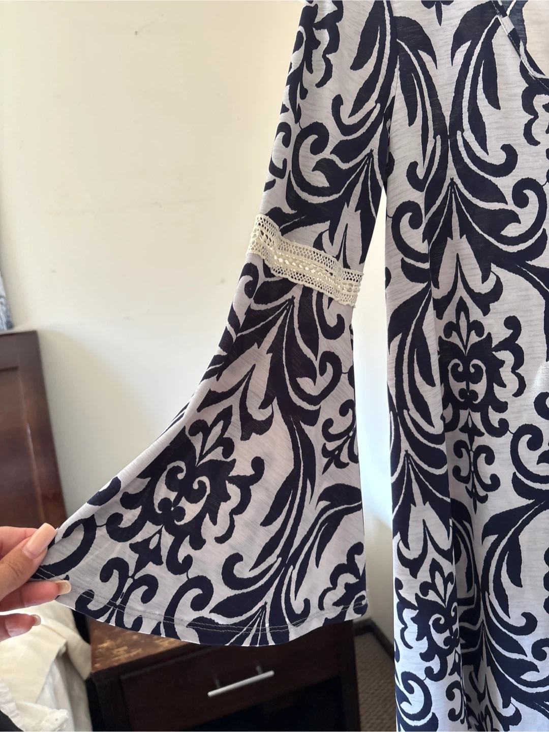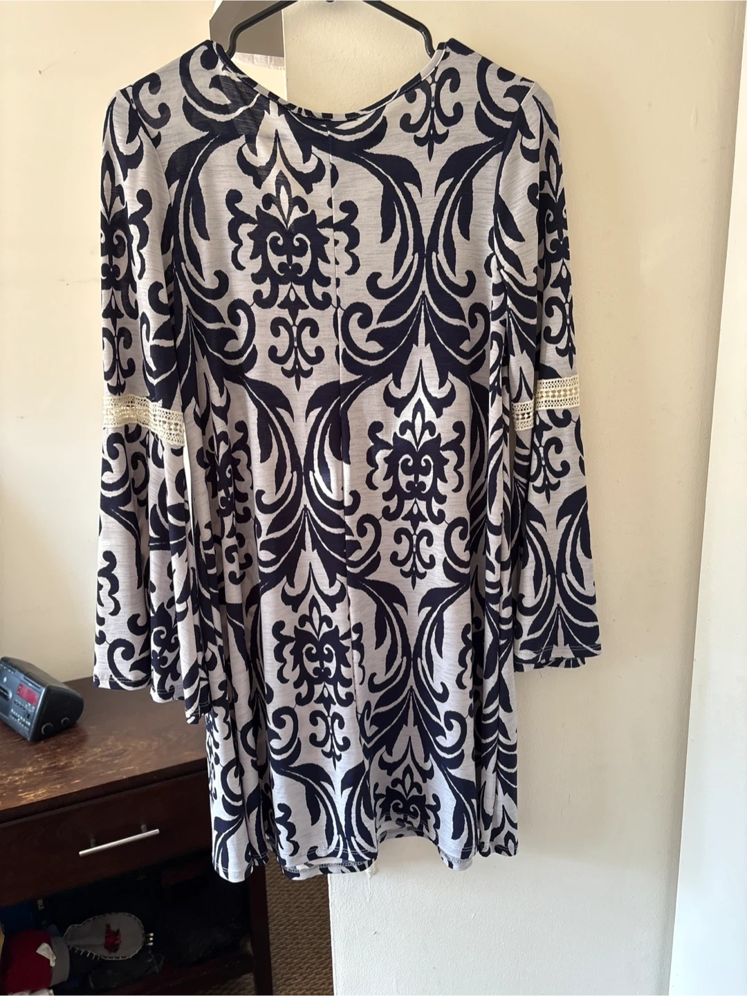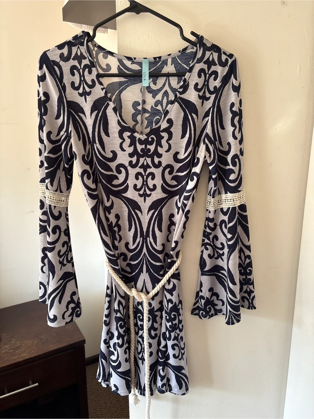 65Cute LOLLA dress featuring a navy and white print. It has long bell sleeves with lace detailing. It can be worn with or without a belt. Worn once.
