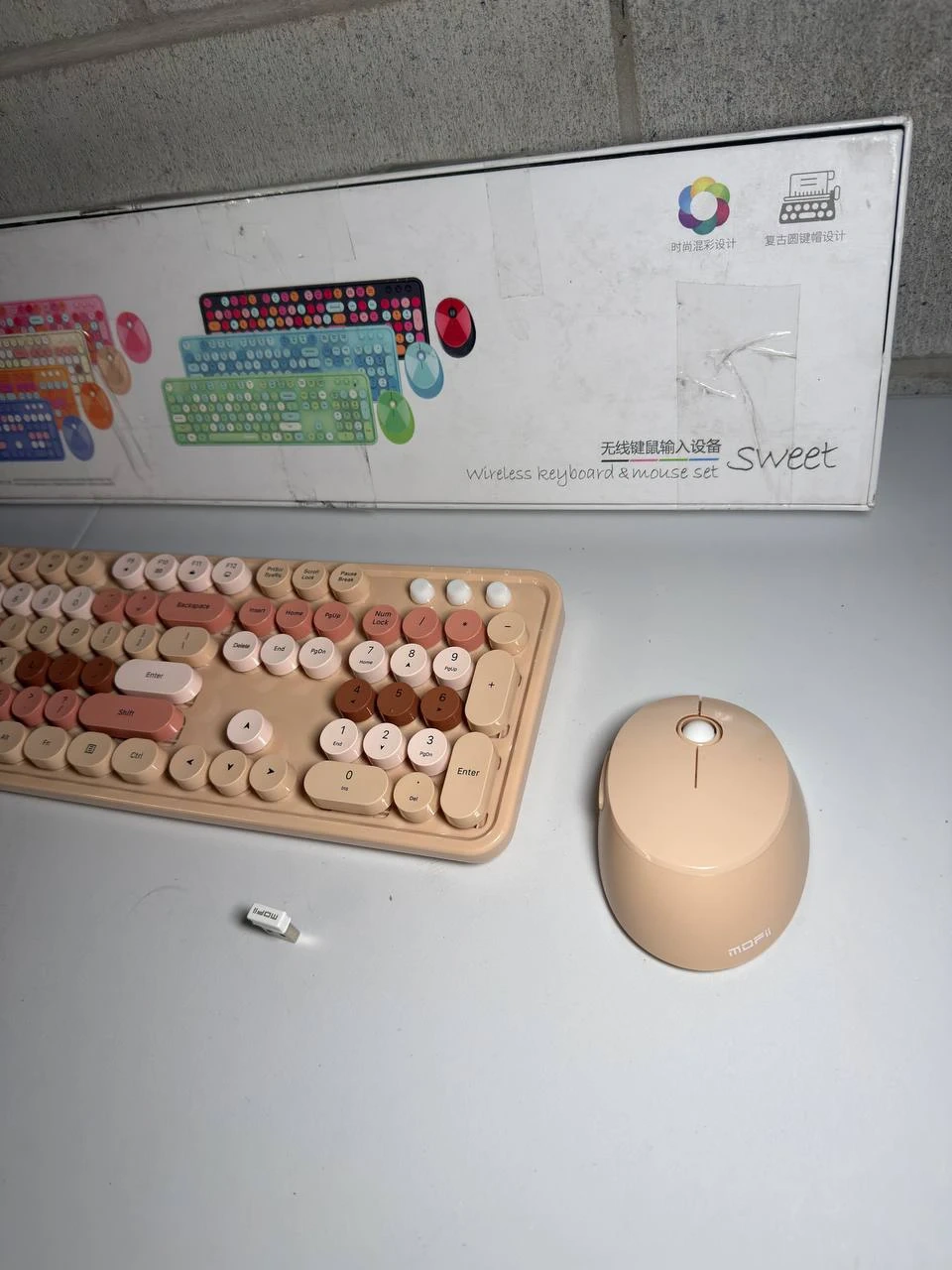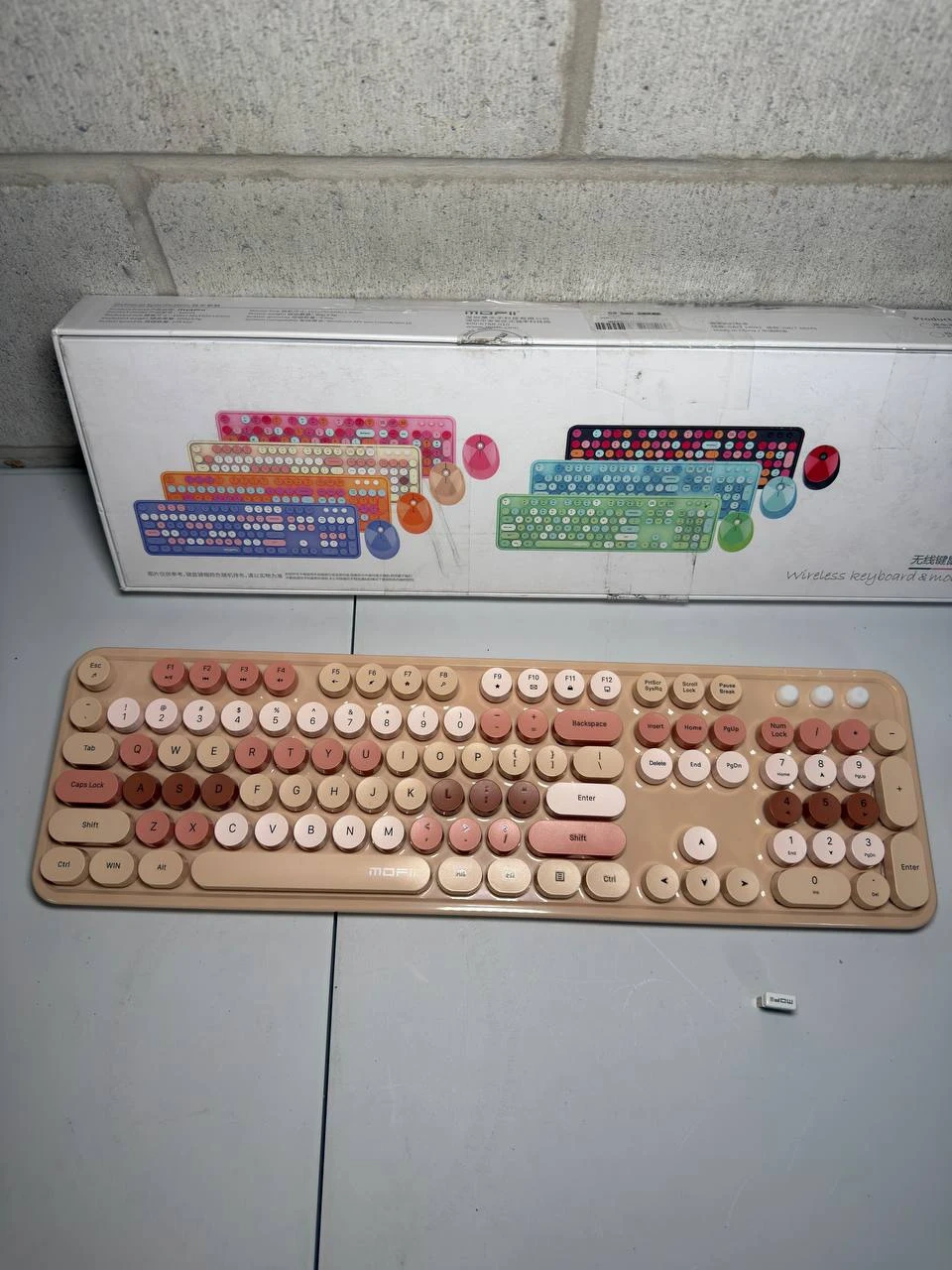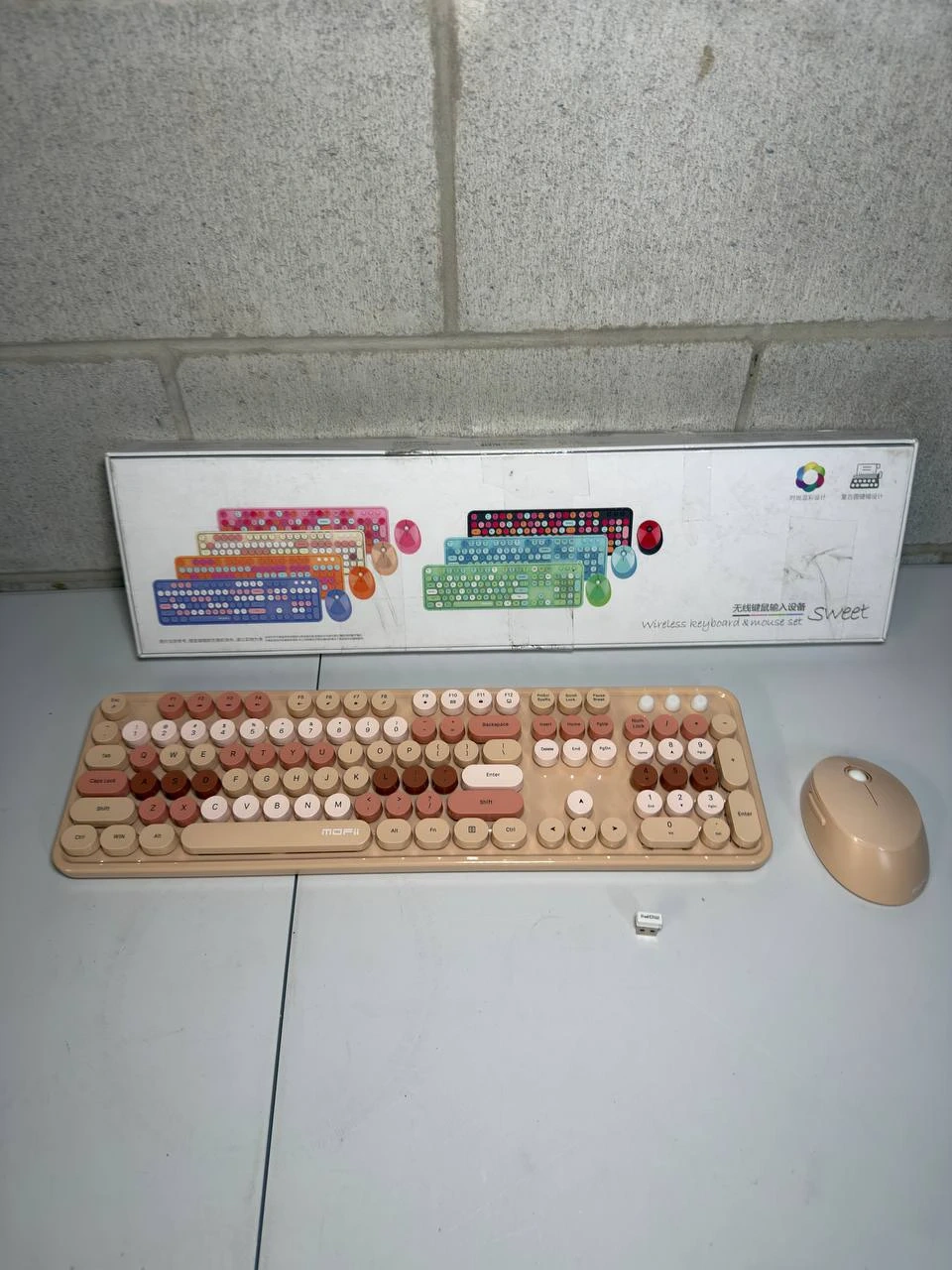 113‼️ All sales are final – no returns 💵 Cash only 🚚 Free Delivery In GTA over 50$ Condition: NEW Lomiluskr Milk Tea Wireless Keyboard & Mouse Set Full-size 104-key membrane keyboard with retro round keycaps for comfortable typing and a colorful design. Wireless 2.4G connection with up to 10m range; keyboard and mouse share a single USB receiver. Keyboard dimensions: 445 × 136 × 35 mm, mouse: 101 × 75 × 34 mm. Includes 13 hotkeys, optical mouse with 1600 DPI, and smart power-saving mode for long battery life.